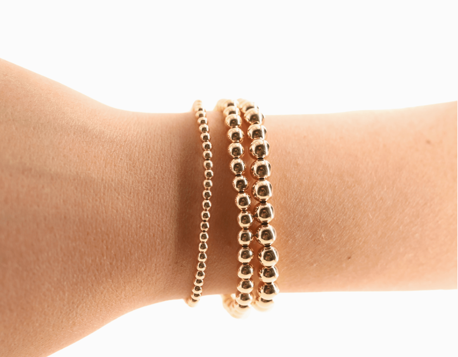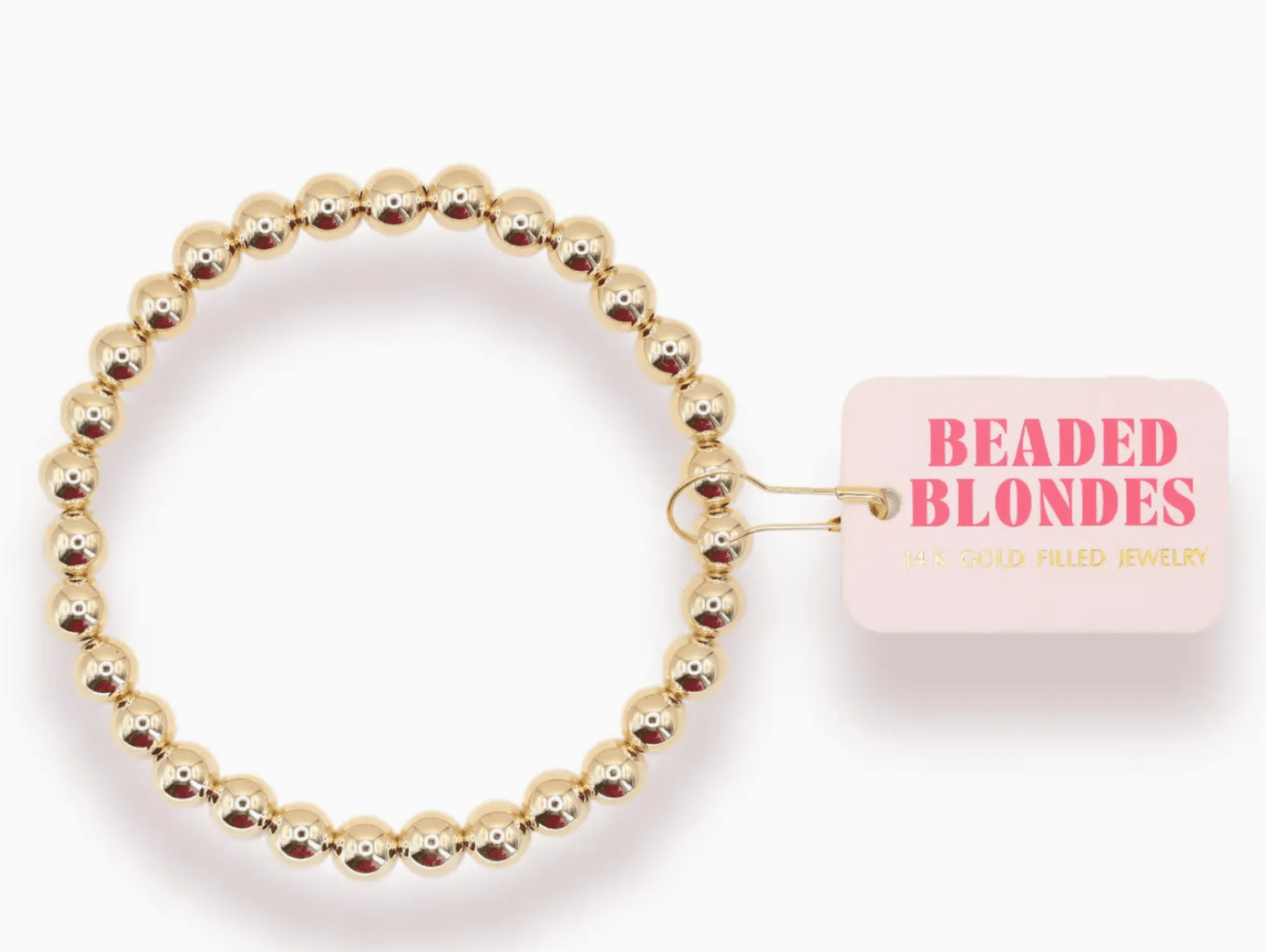 Beaded Blondes 6MM gold stackable beaded bracelet. • 14 K gold filled & elastic string • Handstrung in College Station, Texas. Sourced in the US. • Waterproof, workout proof & tarnish proof