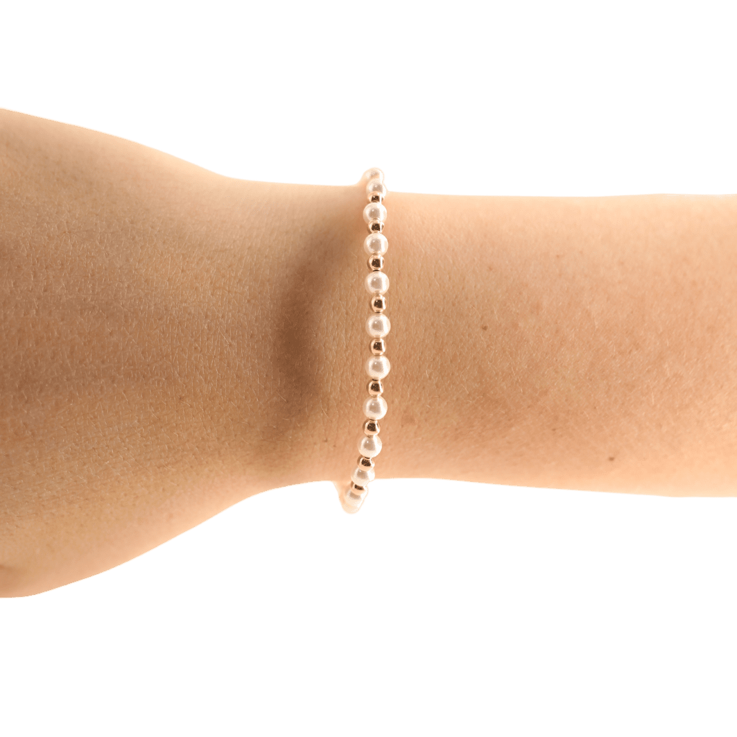The Luci bracelet is 3mm beads + synthetic pearls.