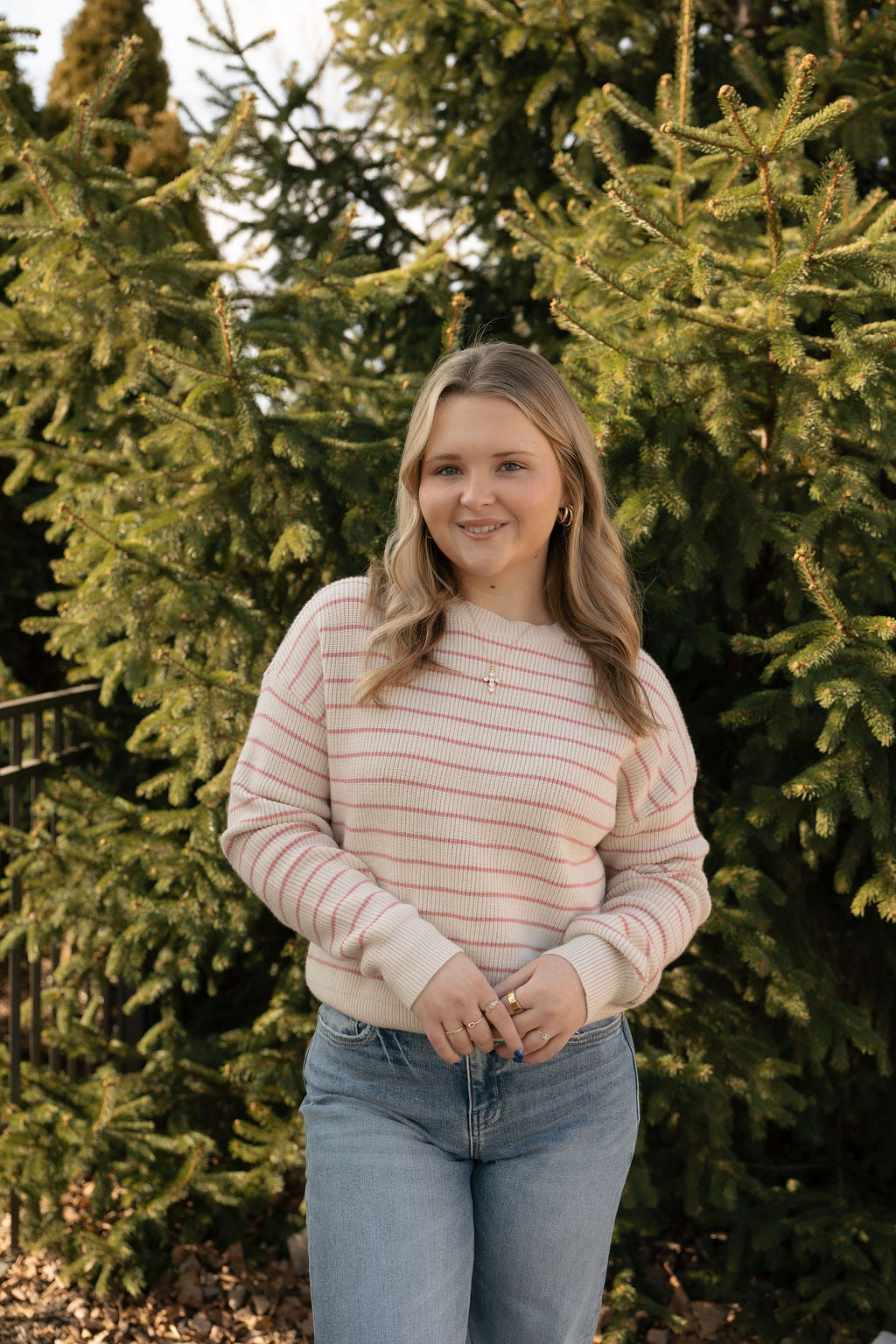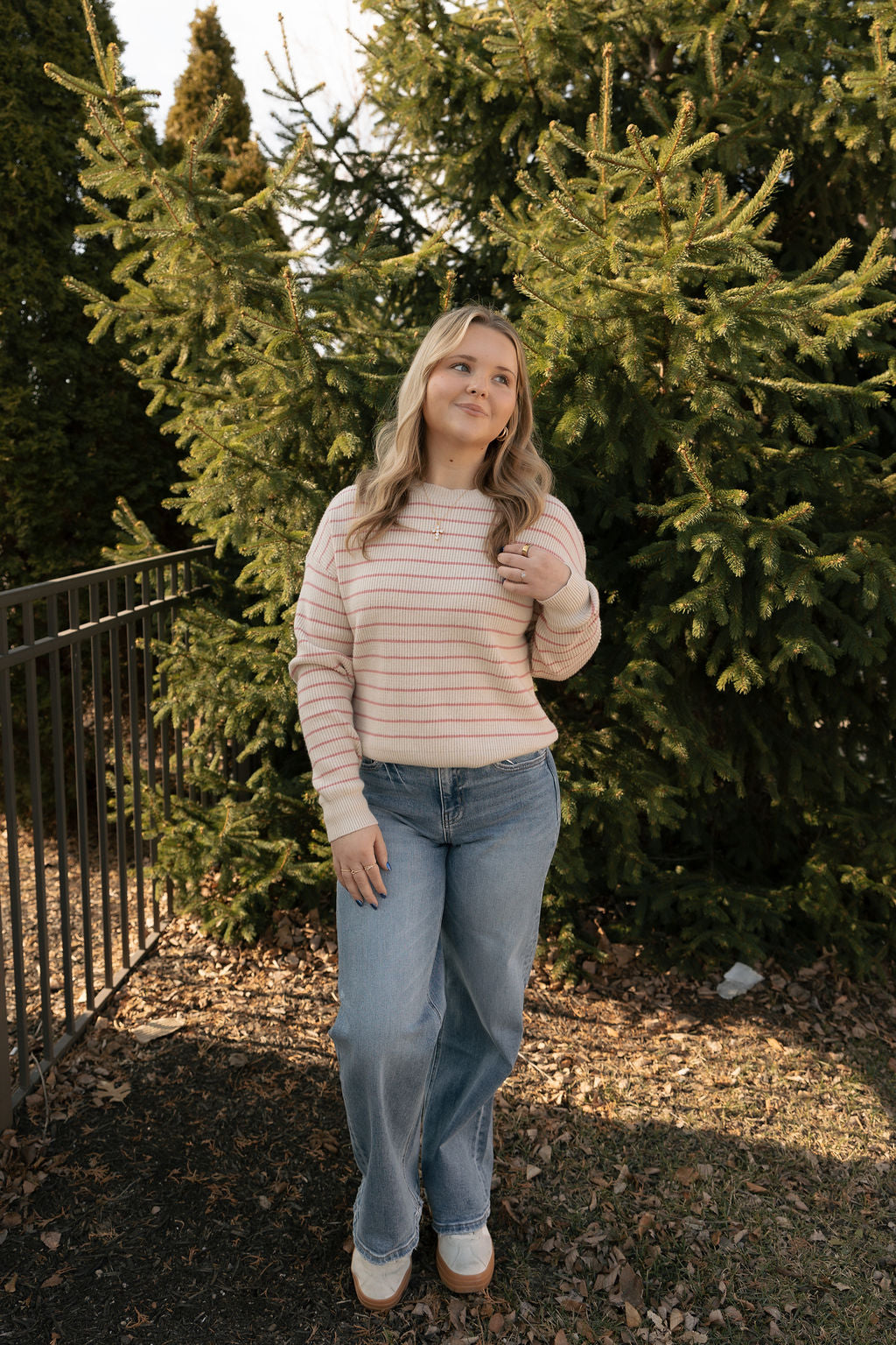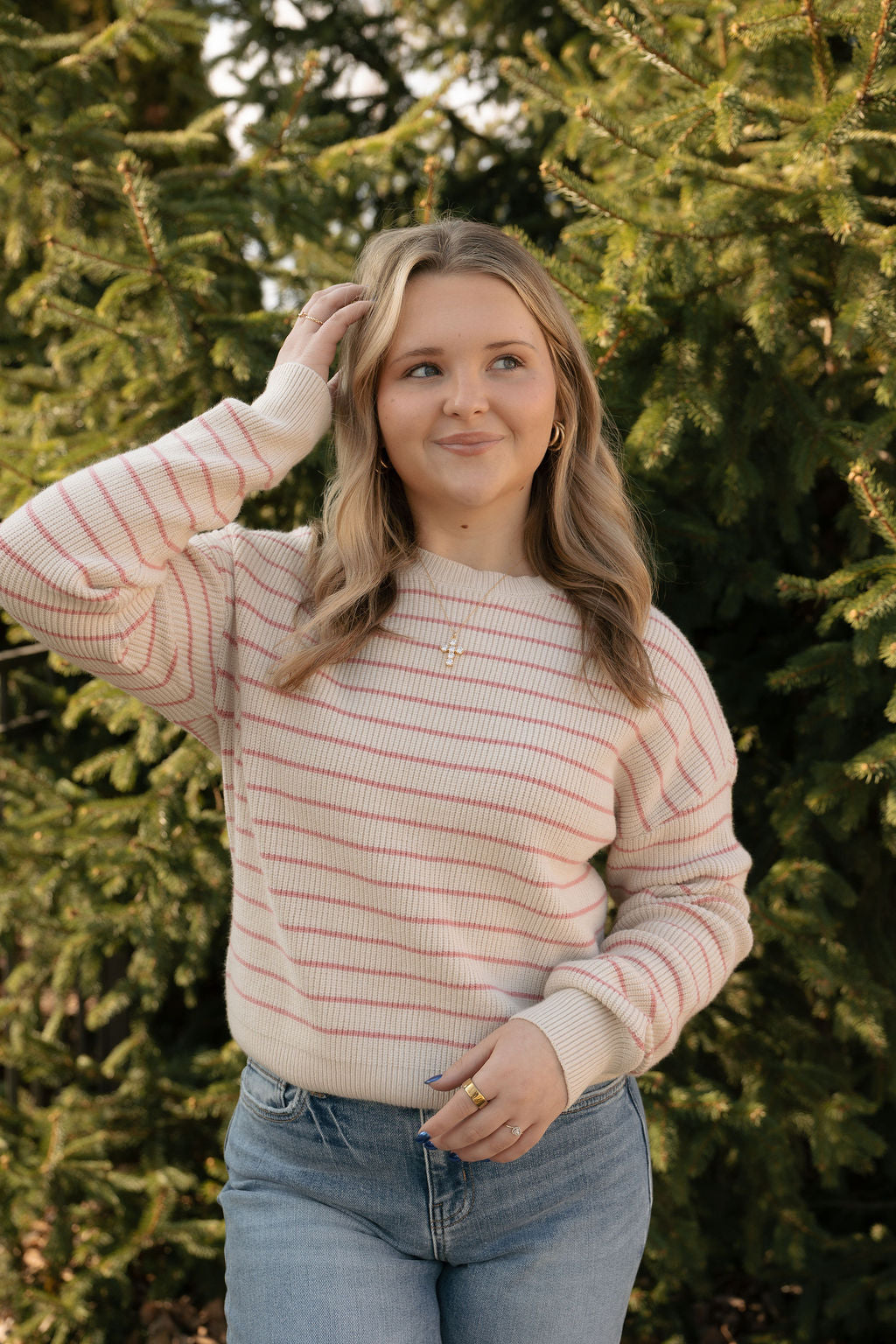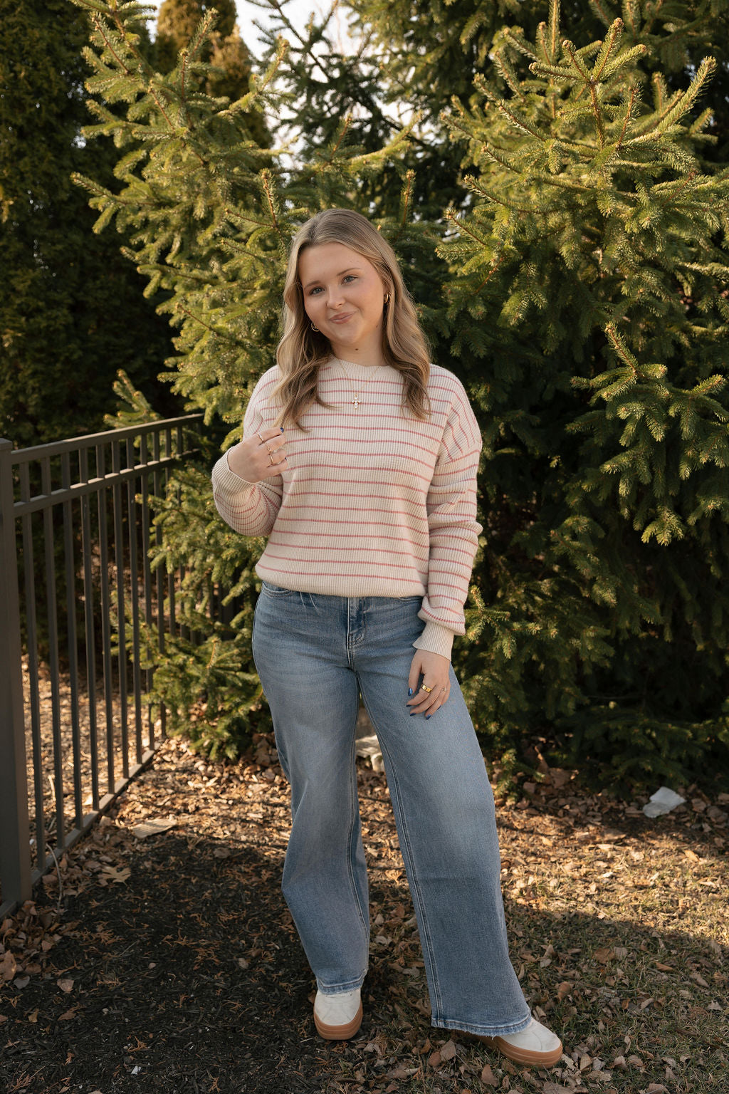 Cozy meets chic in the Ely Sweater by Thread & Supply — a relaxed, effortlessly stylish pullover that brings soft texture and subtle color to your seasonal wardrobe. This version features a fresh cream base with watermelon stripes that add a playful yet refined pop of color, making it an easy go-to for everyday styling.