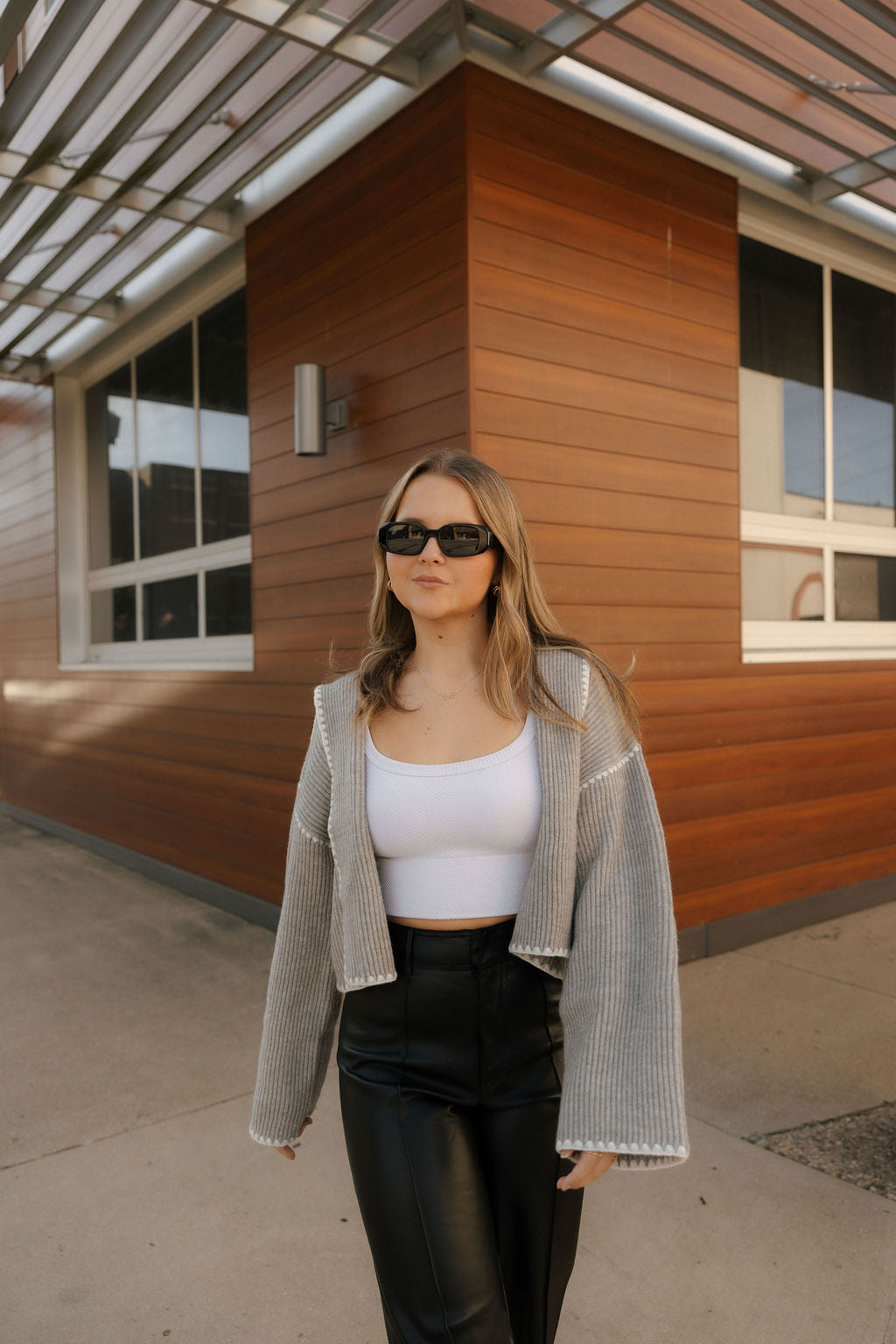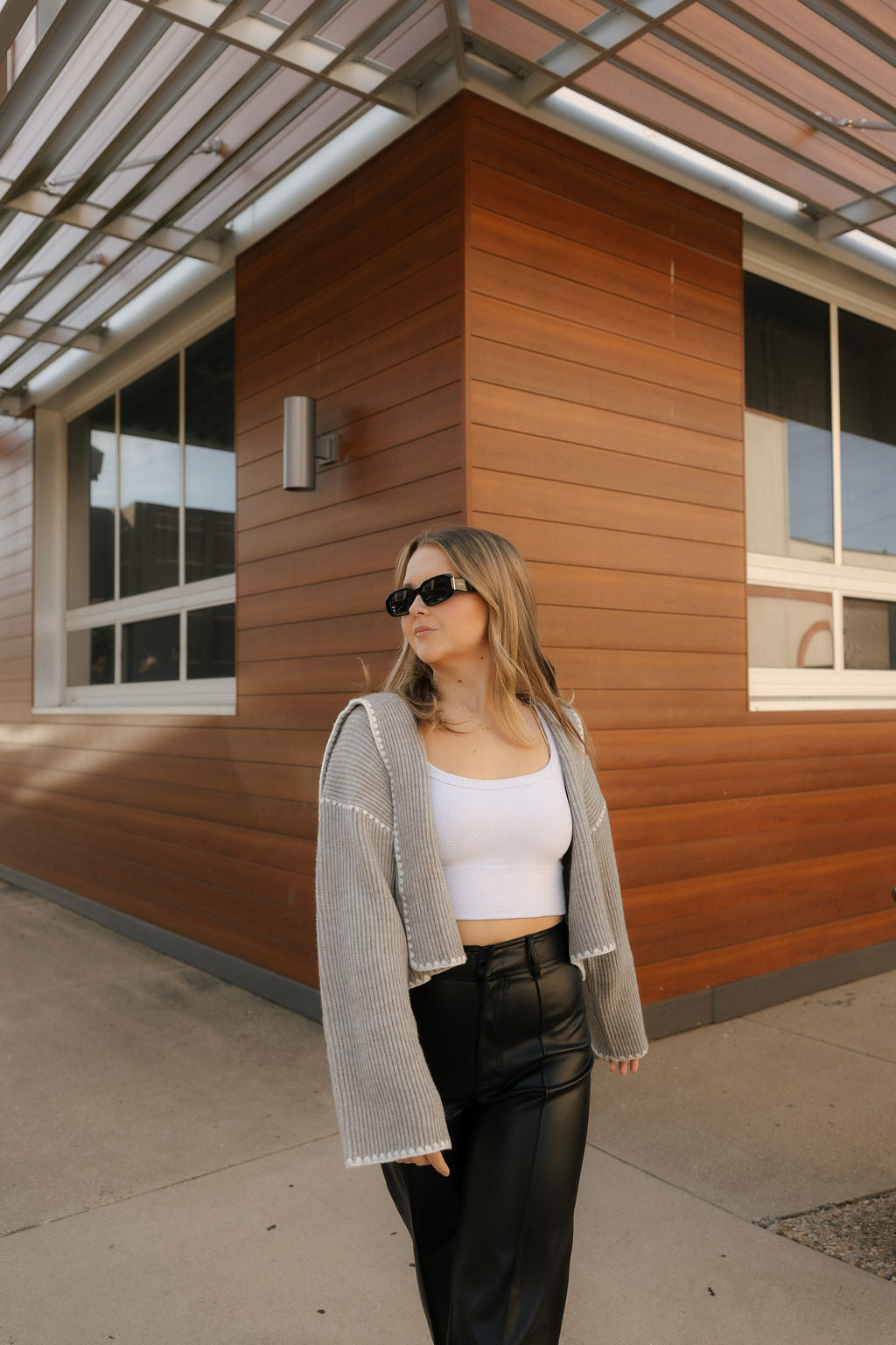 This gray sweater cardigan offers a perfect blend of simplicity and versatility for fall and winter. Its cropped length and long sleeves provide cozy coverage without bulk, making it an ideal layering piece for cooler days.