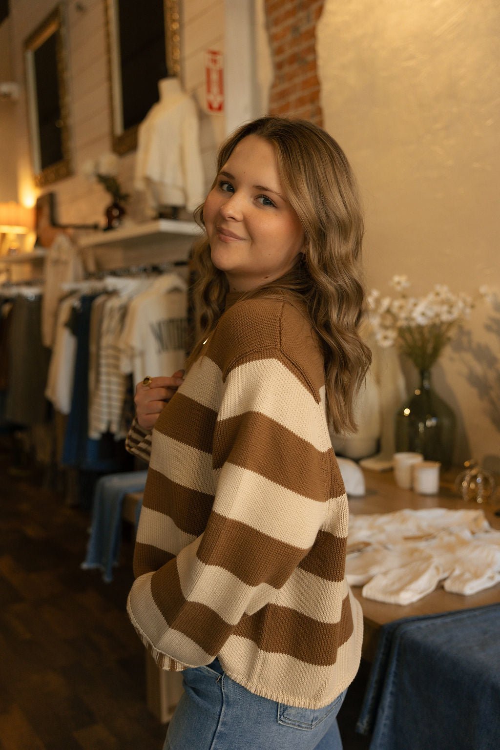 This sweater runs true to size with a slight oversized fit. Model wearing size small.