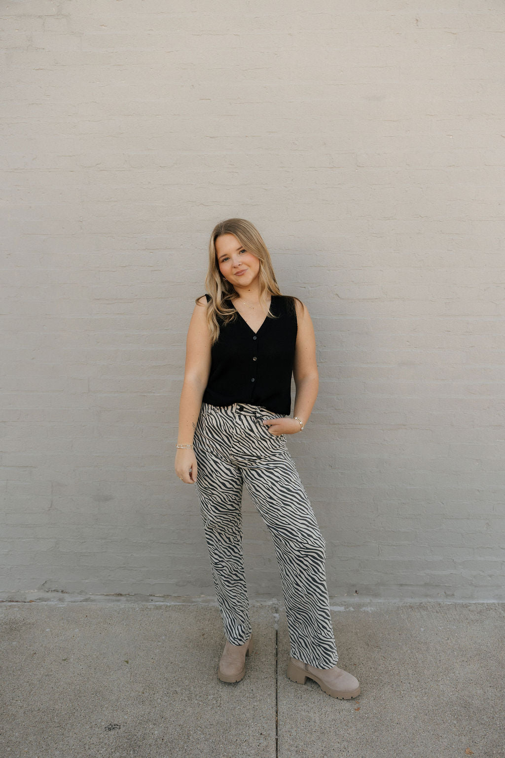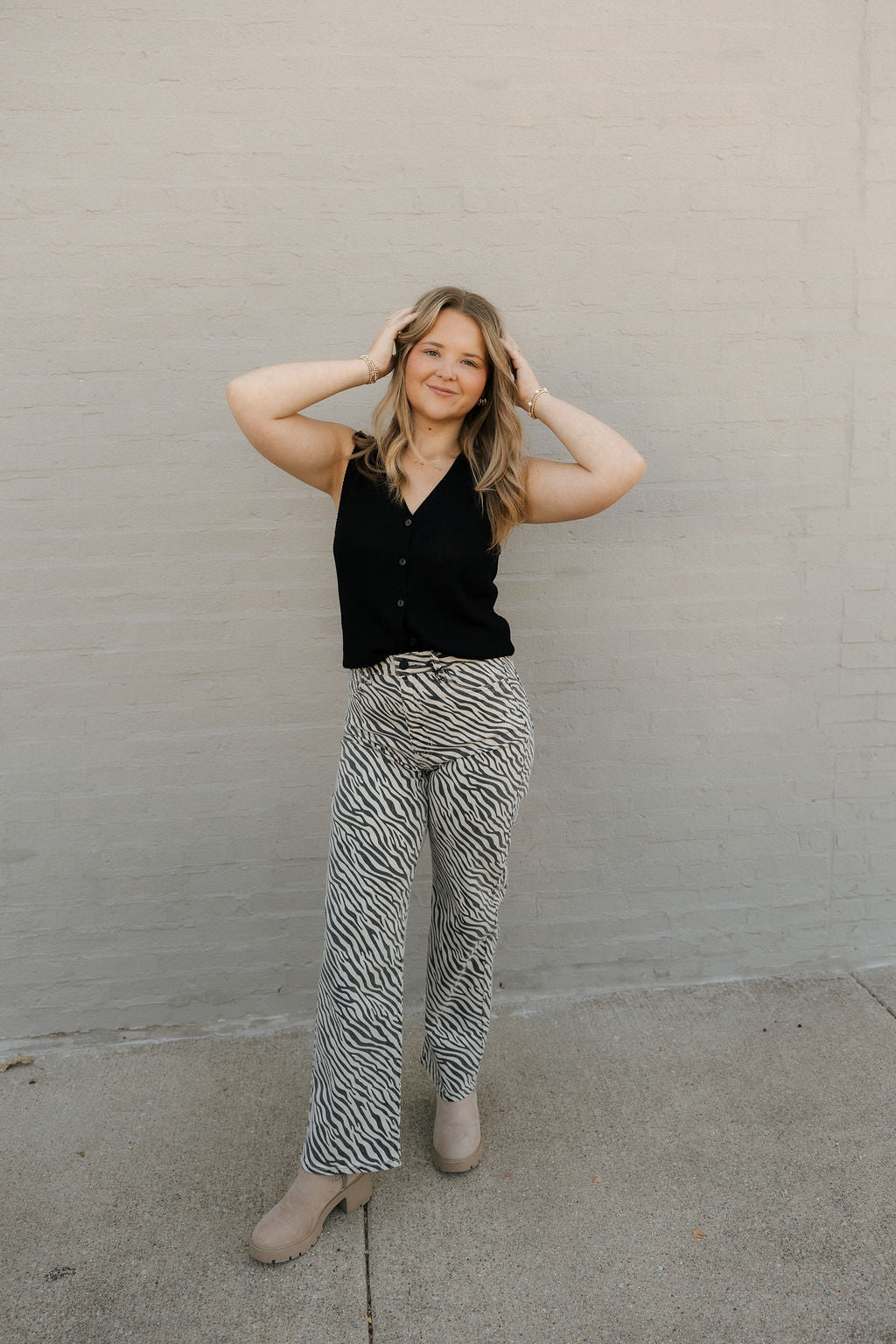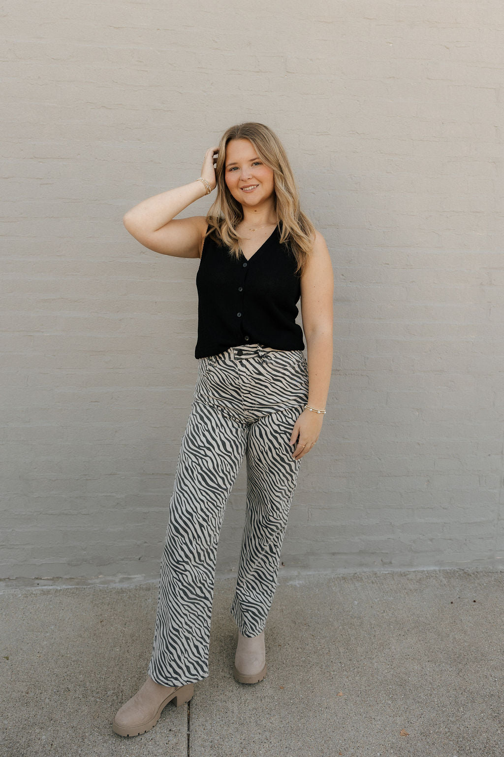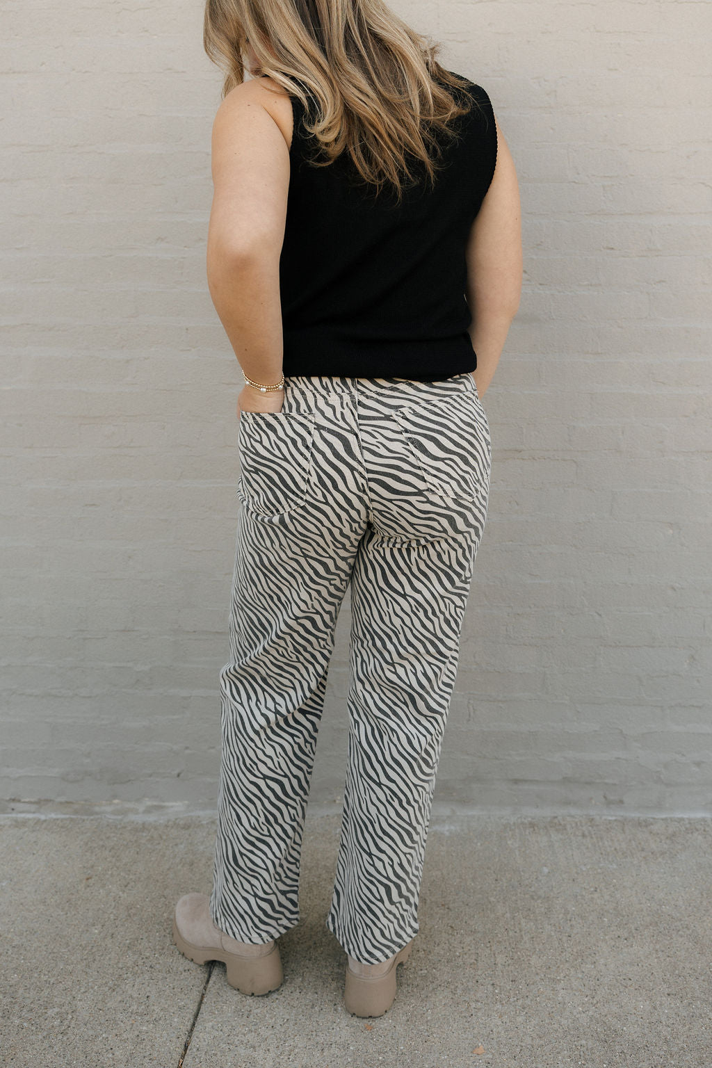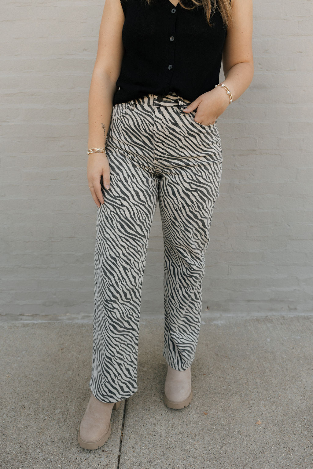 Elevate your wardrobe with the Vintage Straight Zebra pants—featuring a fun, bold print and a flattering high-rise fit. Designed with full-length legs and handy pockets, they offer year-round comfort and style. Perfect for making a unique statement wherever you go.