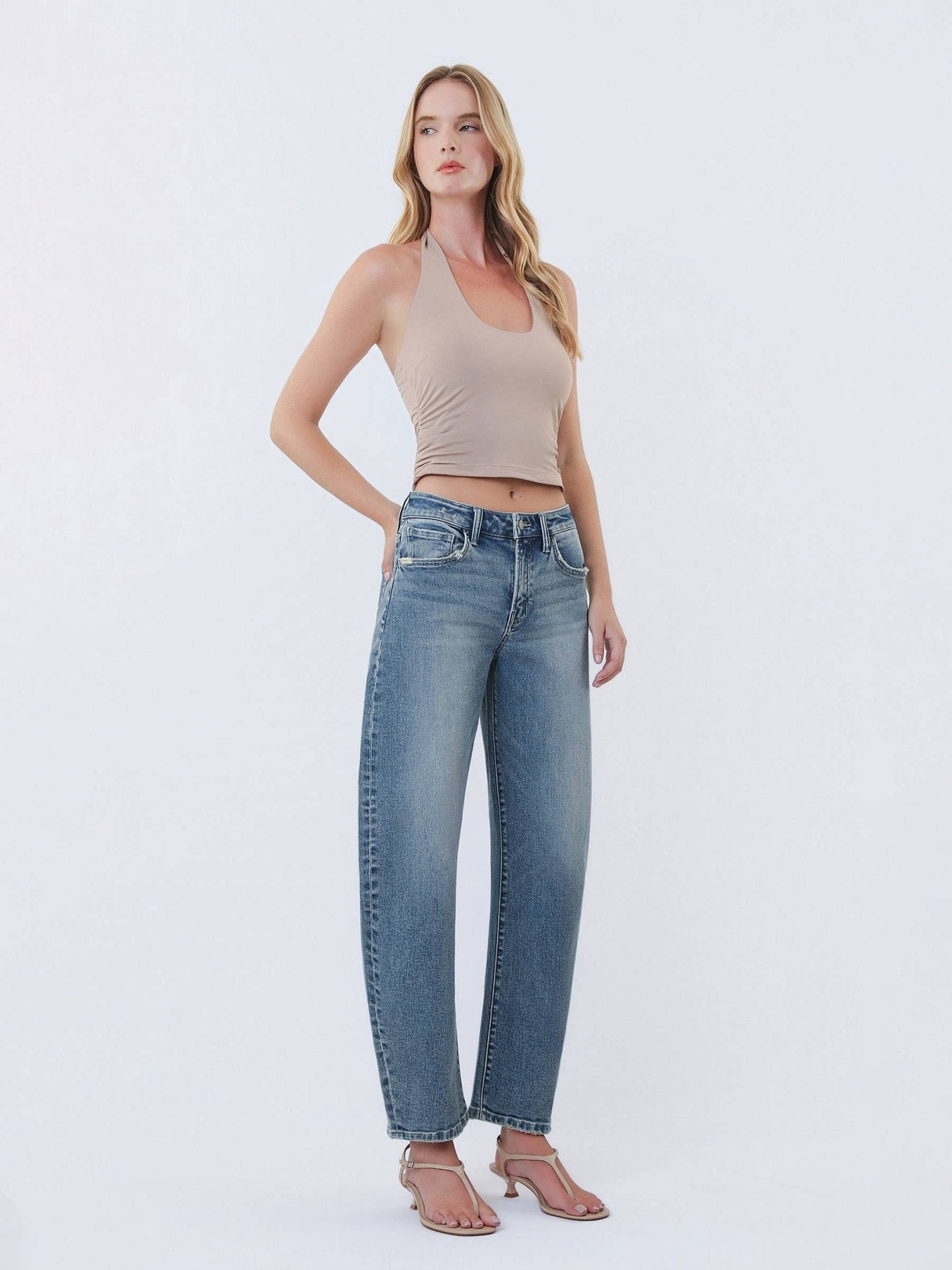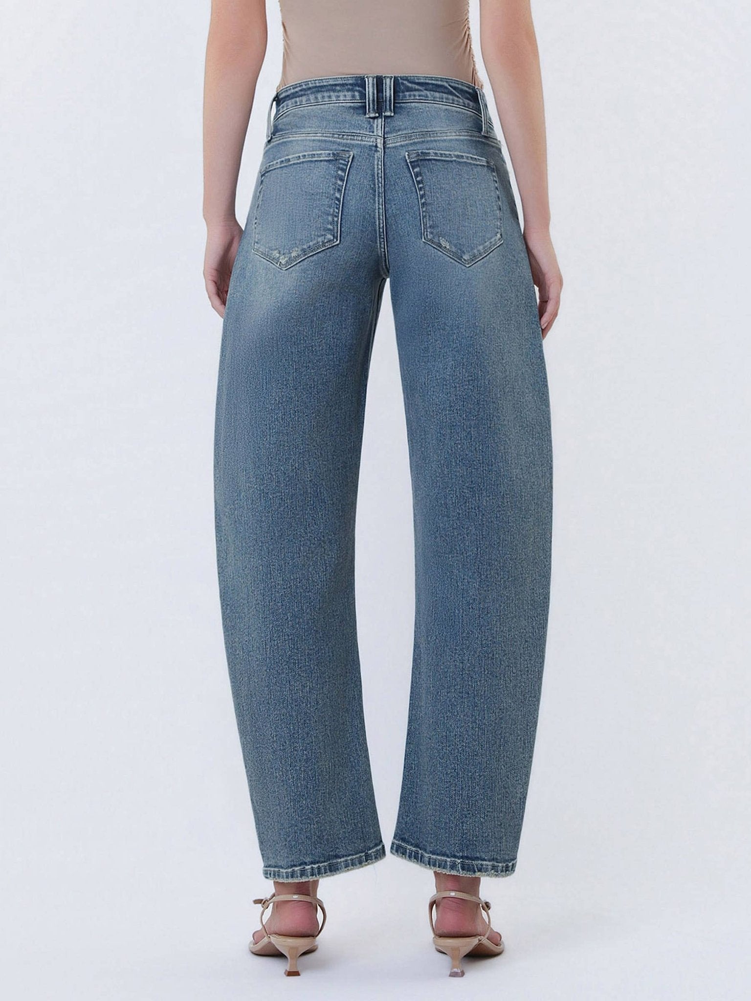 HIGH RISE ANKLE SLIM BARREL JEANS COMFORT STRETCH DENIM, HIGH RISE WAIST, FINISHED HEM, ANKLE LENGTH, MEDIUM WASH, SLIM BARREL JEANS F. RISE: 10 1/2" / INSEAM: 28" / LEG OPENING: 17"