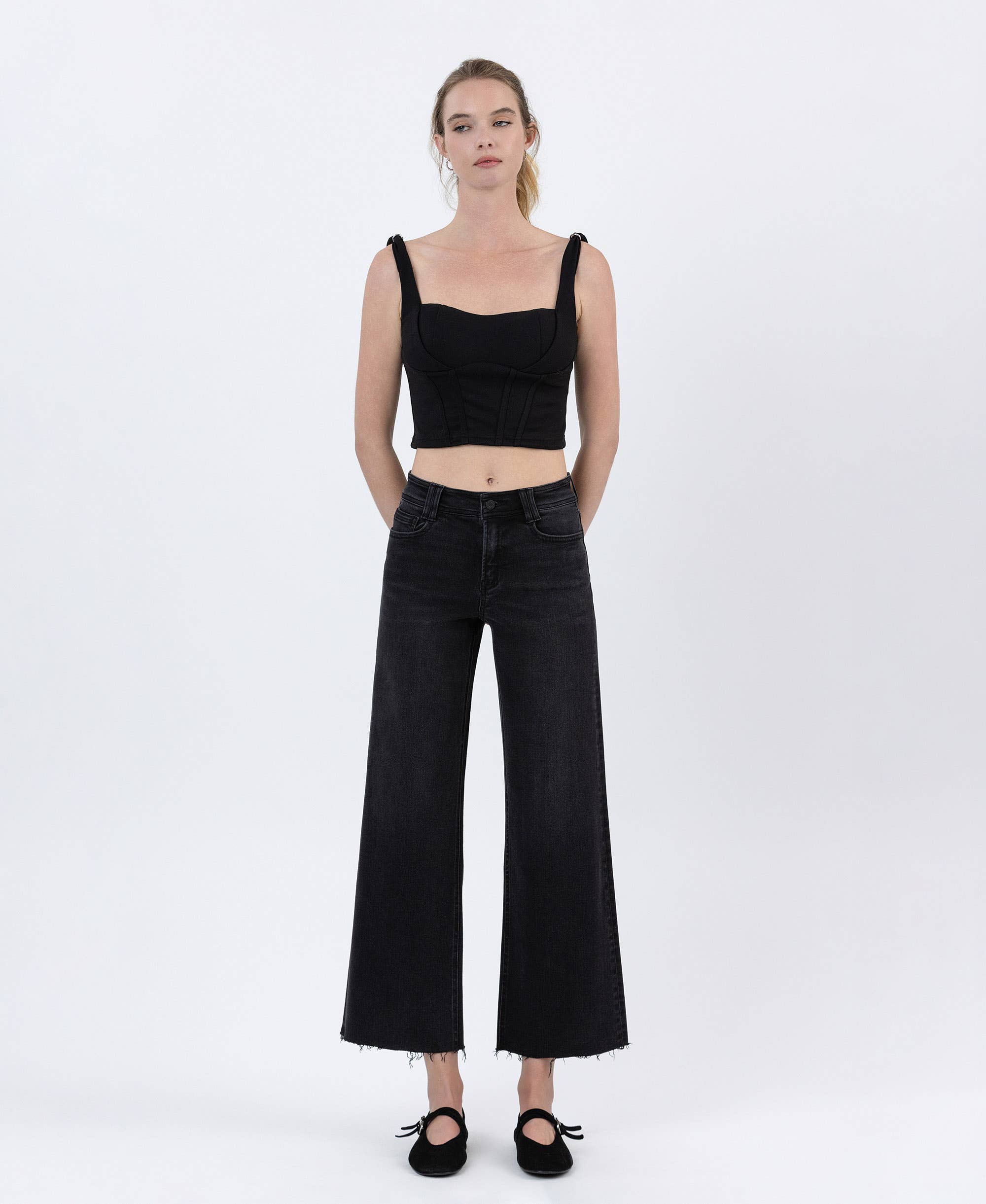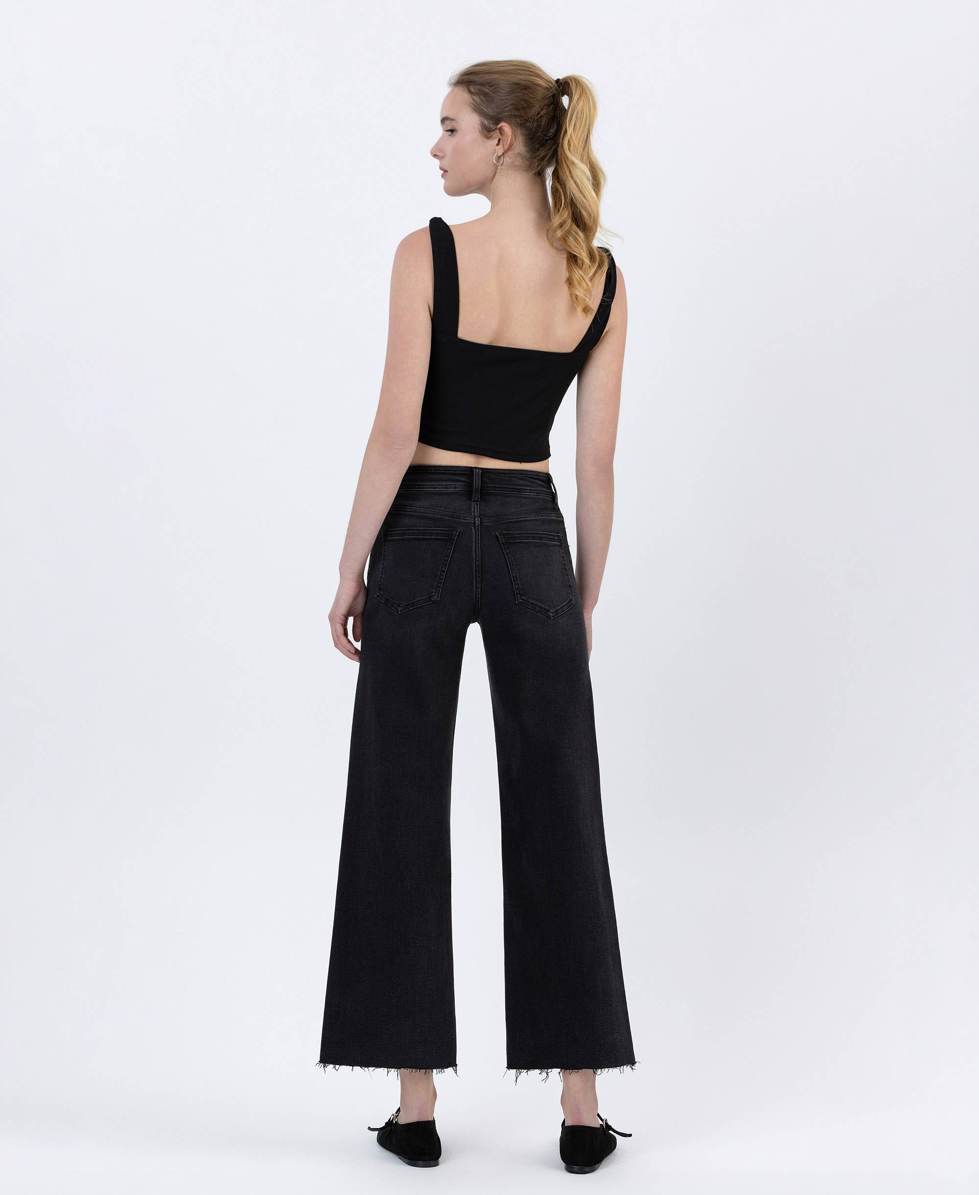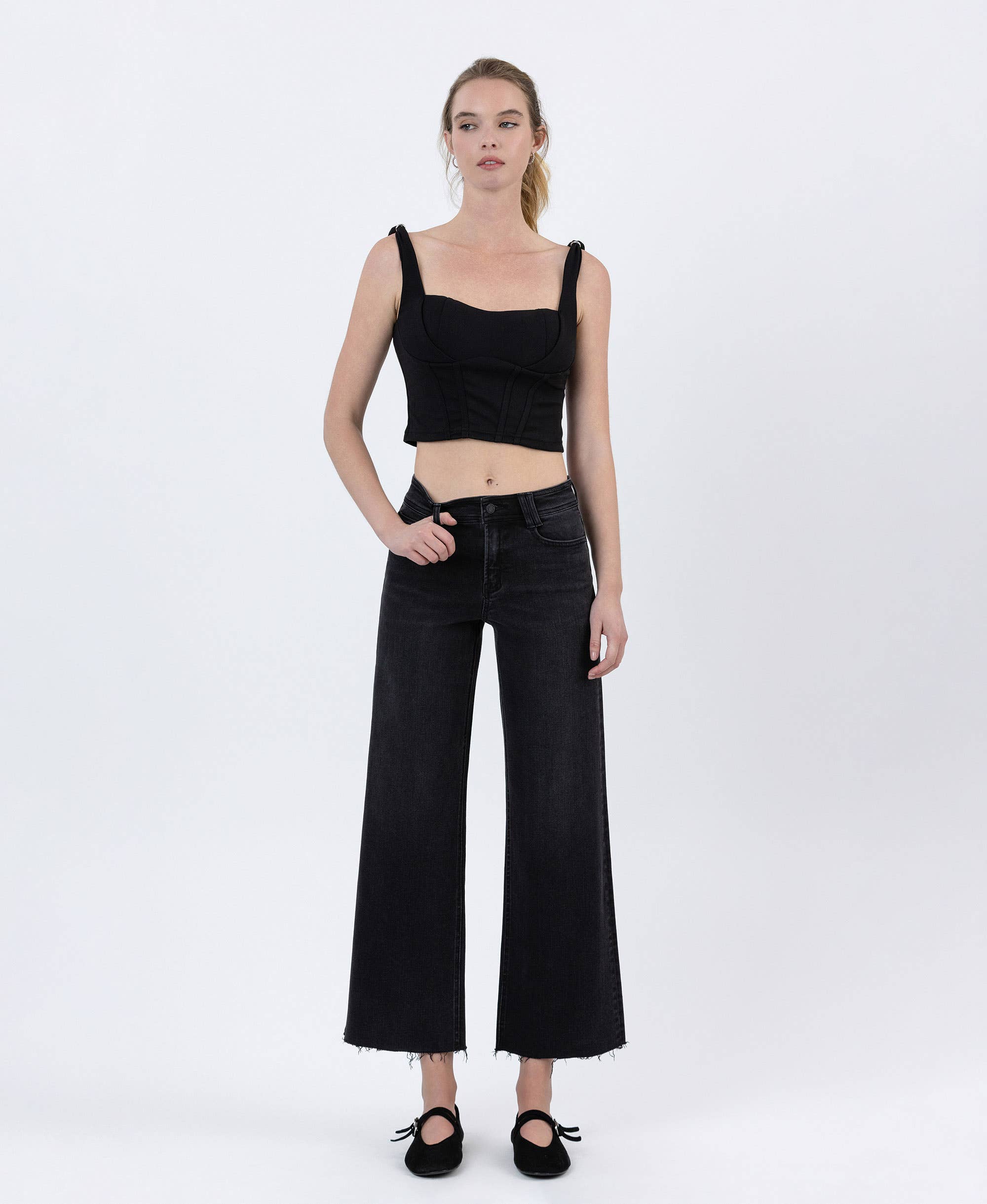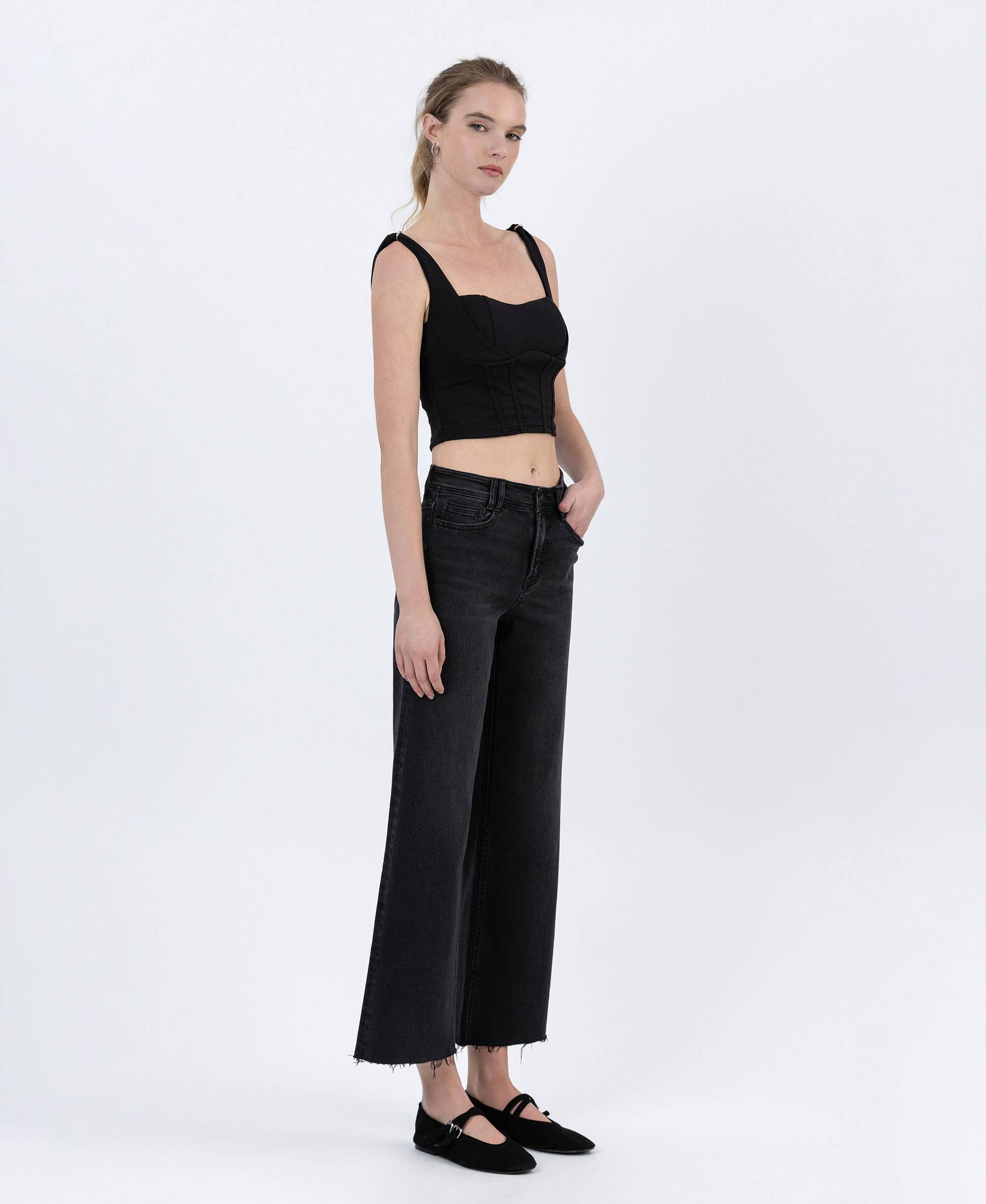 HIGH RISE RAW HEM ANKLE WIDE JEANS COMFORT STRETCH DENIM, HIGH RISE WAIST, RAW HEM, ANKLE LENGTH, WIDE JEANS F. RISE: 10" / INSEAM: 27 1/4" / LEG OPENING: 21"