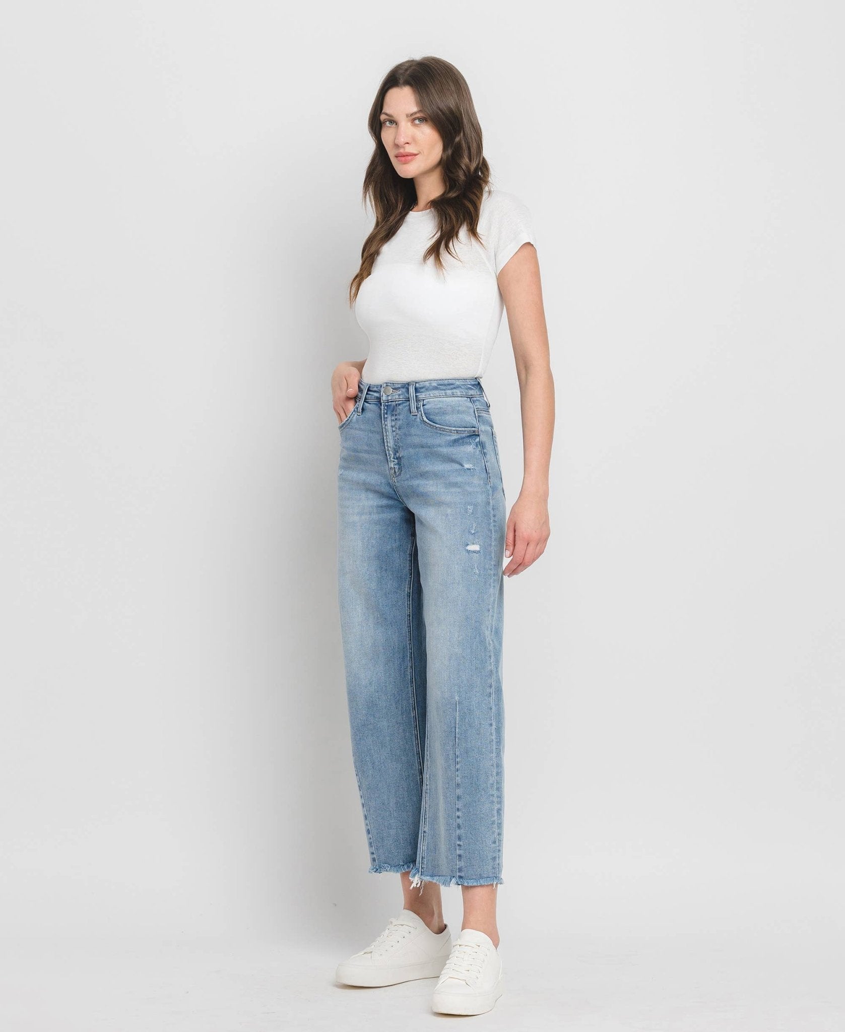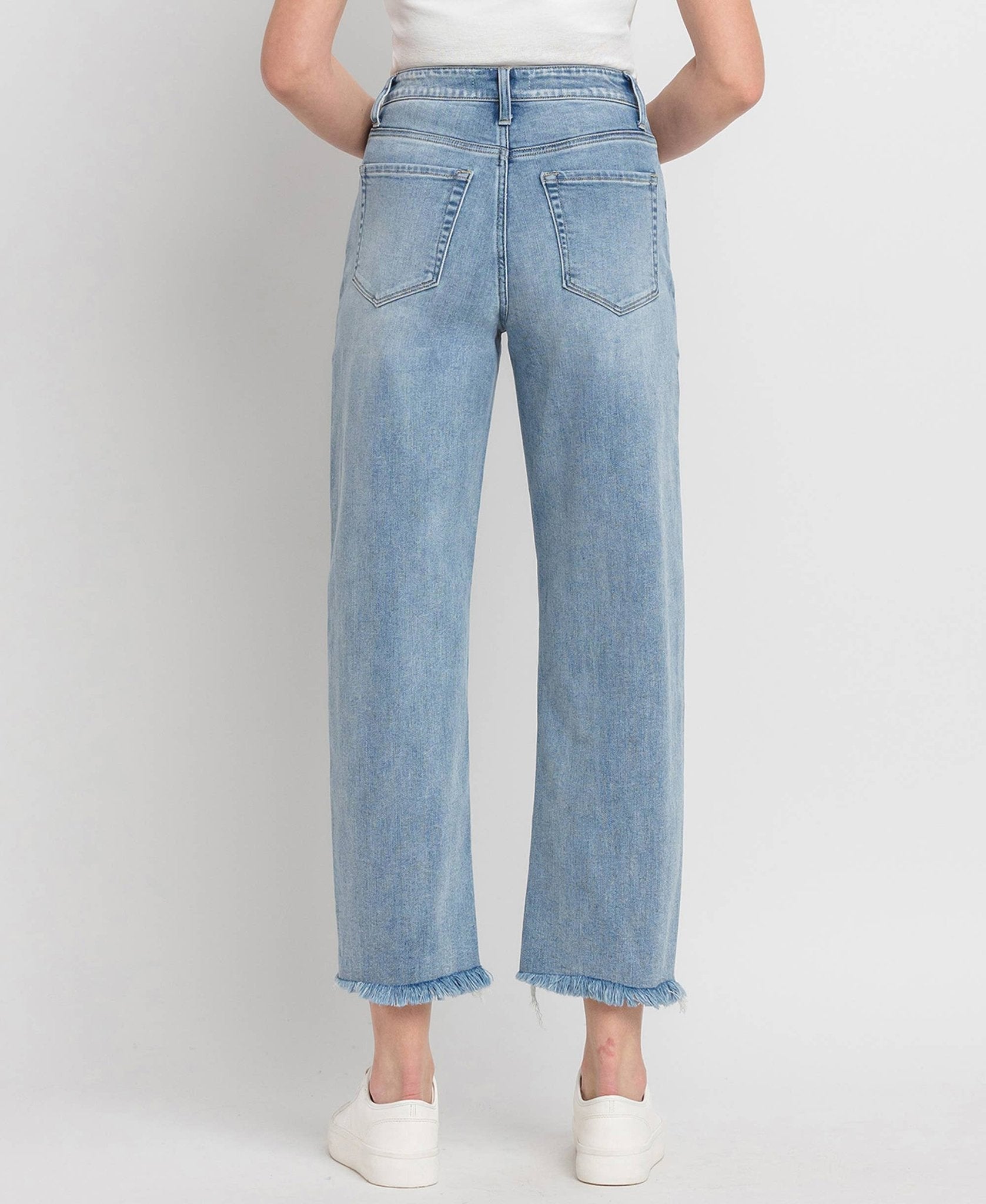 SUPER HIGH RISE BARREL LEG JEANS COMFORT STRETCH DENIM, SUPER HIGH RISE WAIST, SLIGHTLY DISTRESSED DETAIL, FRAYED HEM, CROPPED LENGTH, BARREL LEG JEANS F. RISE: 11" / INSEAM: 27" / LEG OPENING: 16 3/4" MODEL IS 5'9"