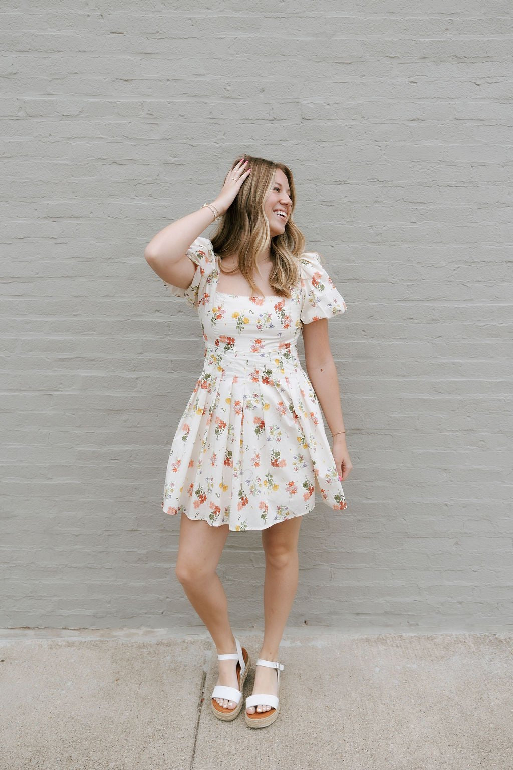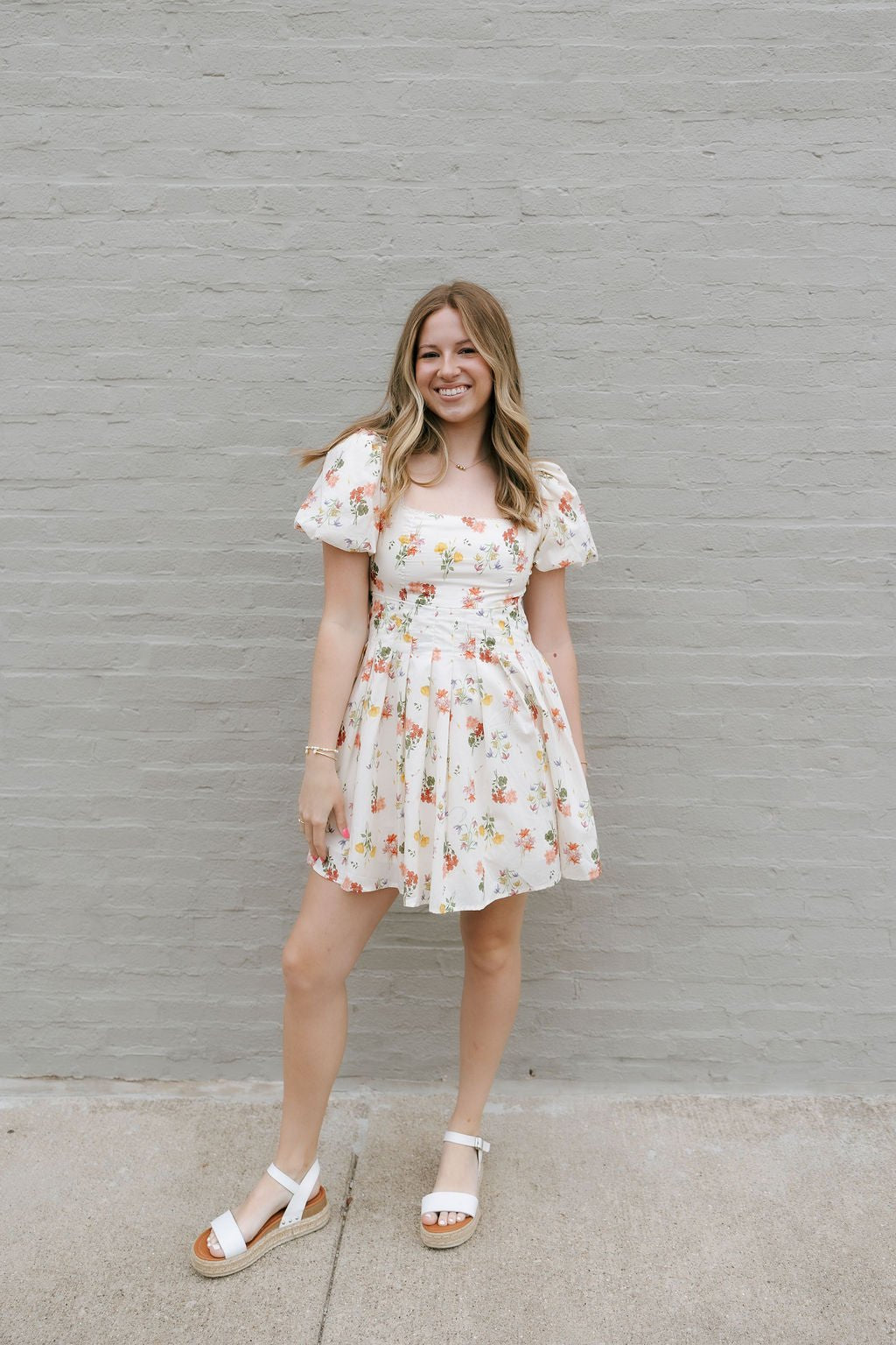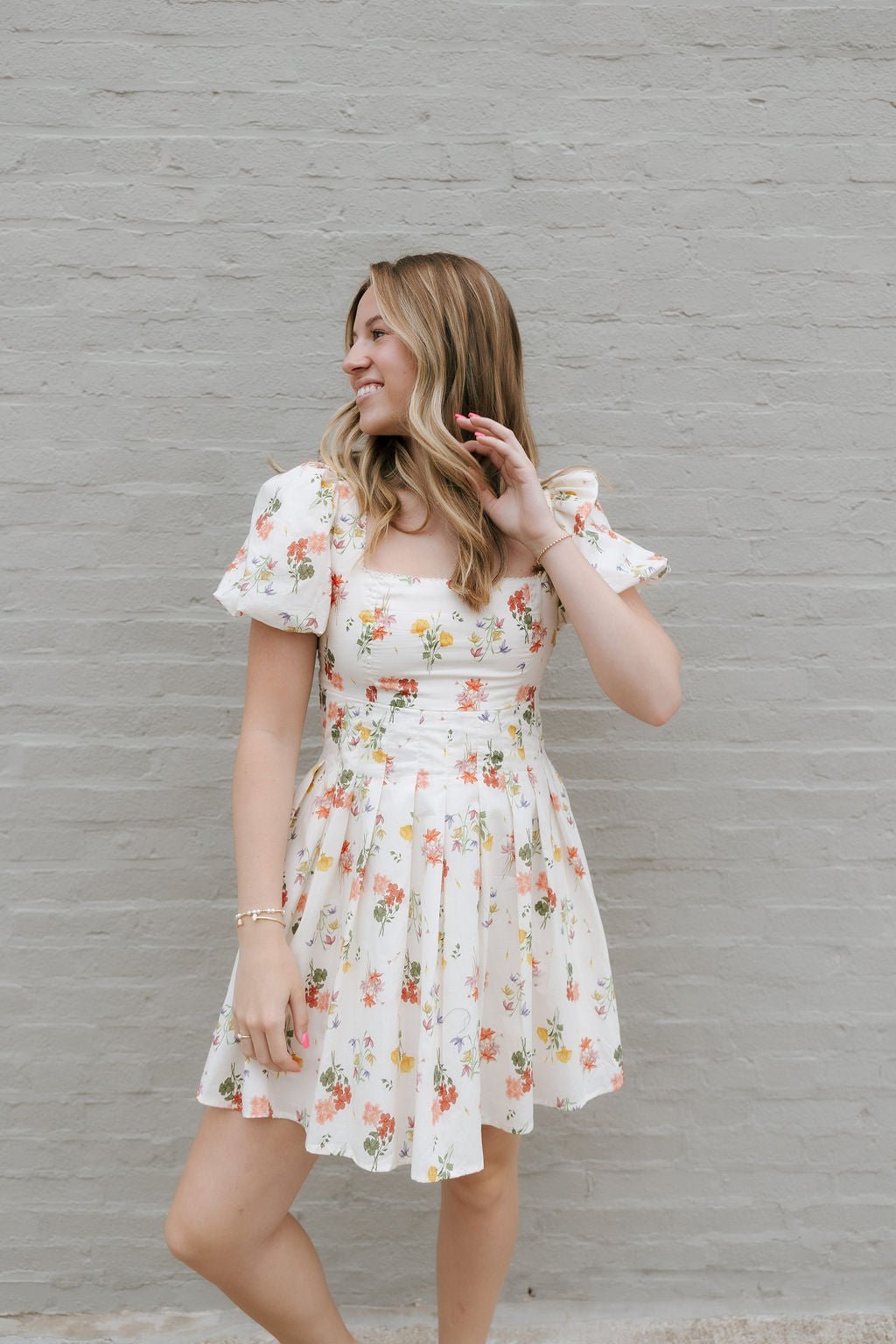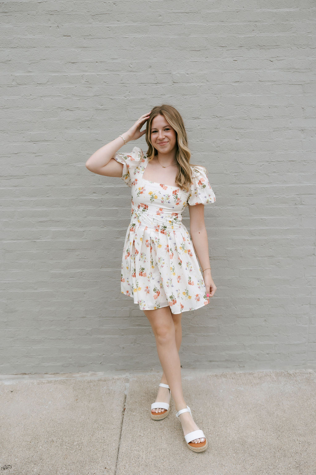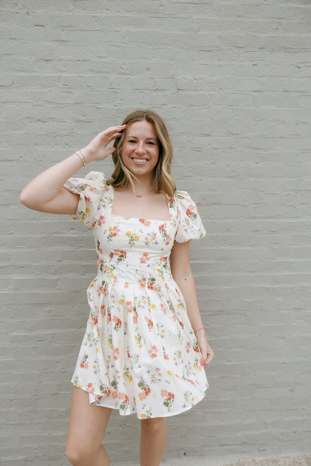 Be uniquely chic with our Floral Square Neck Dress in Cream. Perfect for spring and summer, this mini dress features a flattering square neckline and stylish puffed sleeves. The open tie back adds a touch of elegance to this floral design.