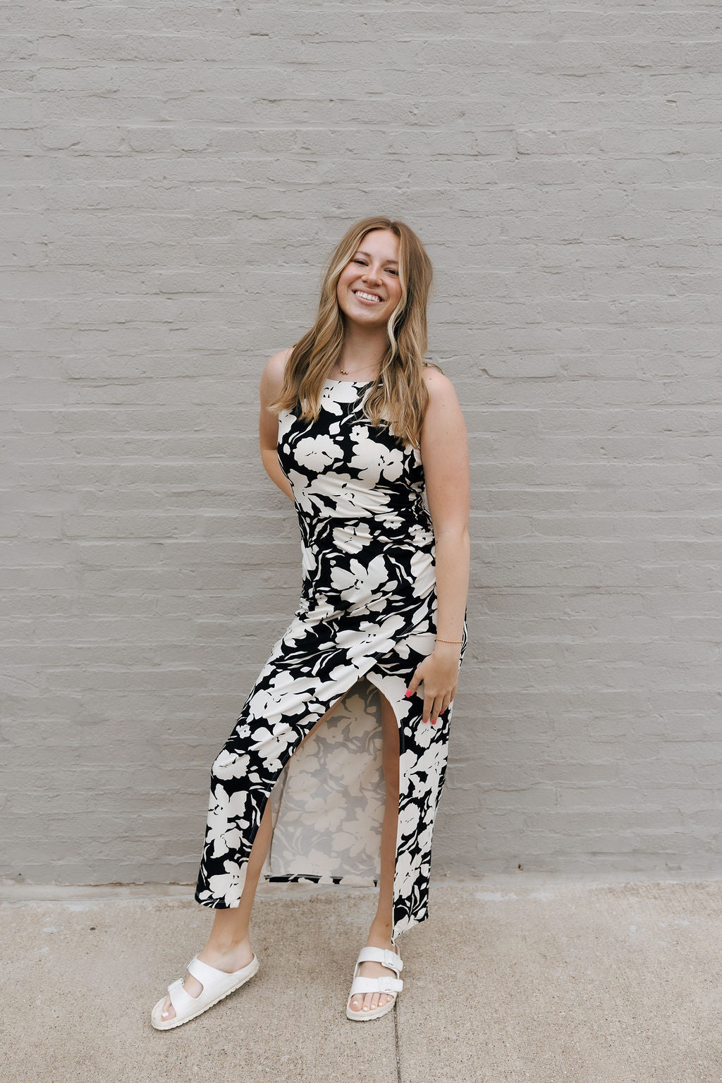 Fit: True to size, sleeveless, open back, side slit, high neckline. Model is wearing a size small.