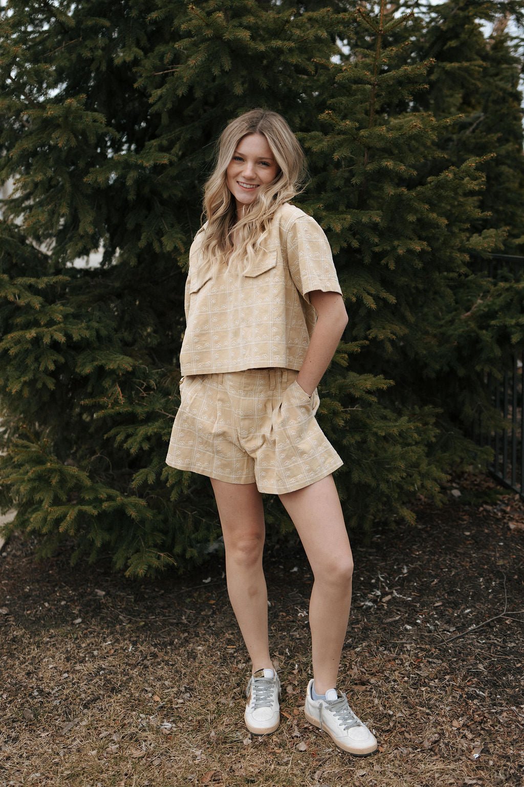 Fit: True to size, low v-neck, cropped length, flowy, pocket detailing on front, and folded collar. Model wearing size small. 19.5" from collar to bottom of shirt/ 5" from armpit of sleeve to cuff.