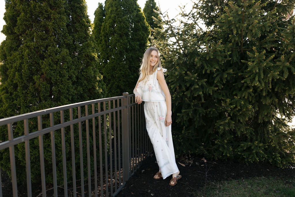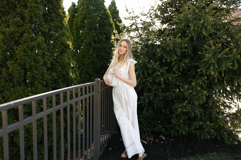 Elevate your spring/summer wardrobe with our unique Embroidered Tank/Pants Set. Effortlessly flowy and adorned with fun floral embroidery, this set is both cute and comfortable for any occasion. Upgrade your style with this must-have addition to your collection.
