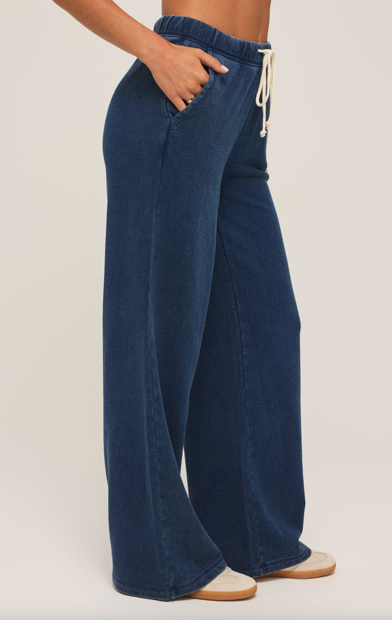Say hello to your new go-to full-length pant, featuring sleek trouser pockets and a fully functional drawcord waistband for that perfect fit. Made from lightweight knit denim, these pants combine style and comfort effortlessly for any occasion.