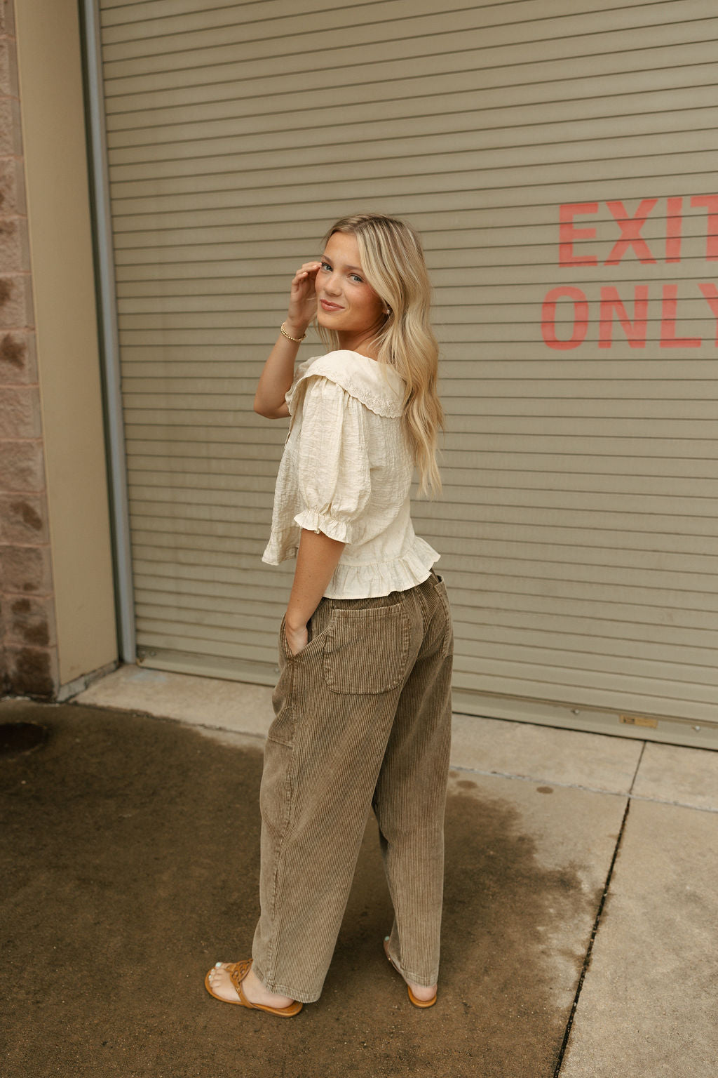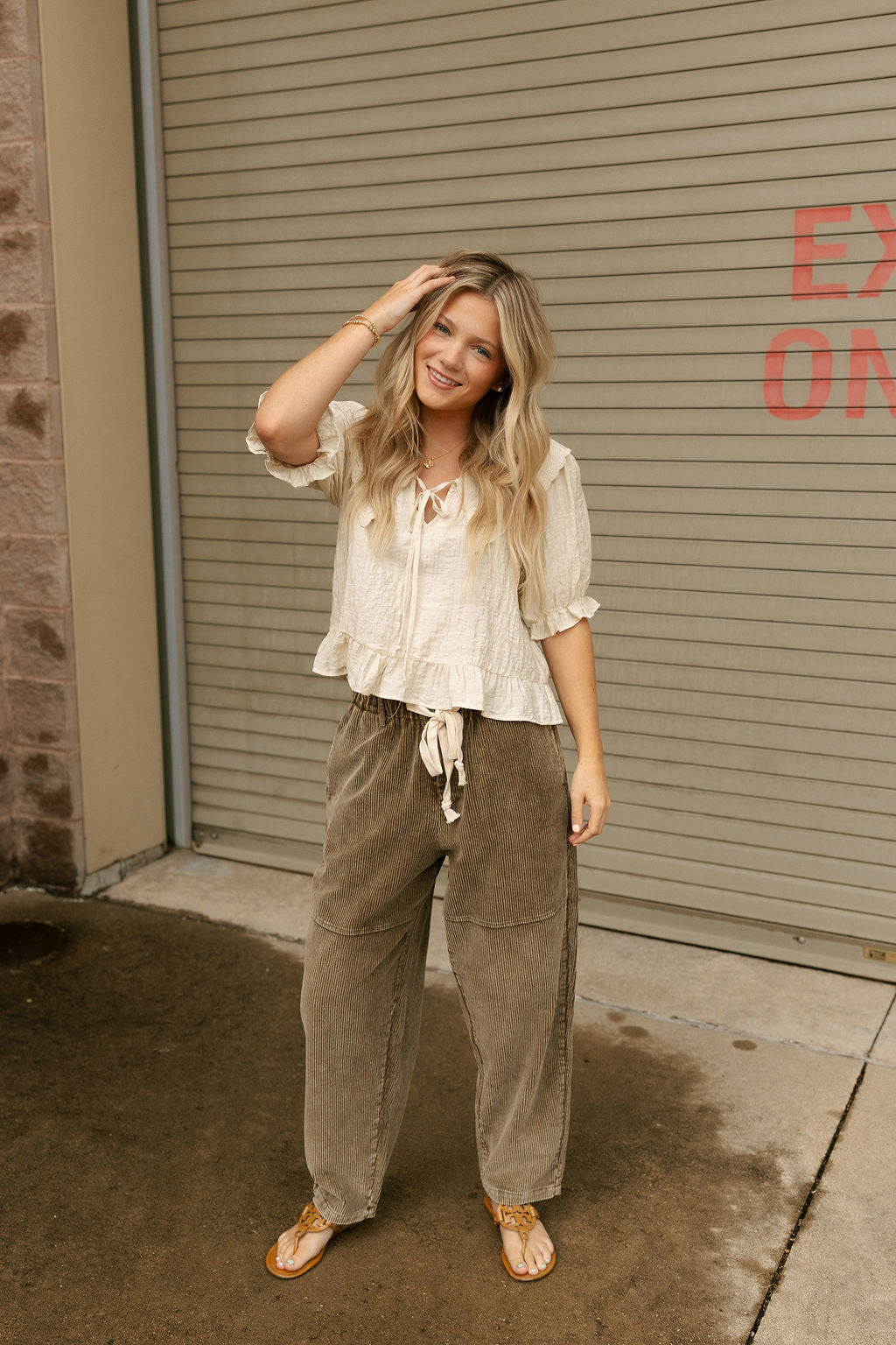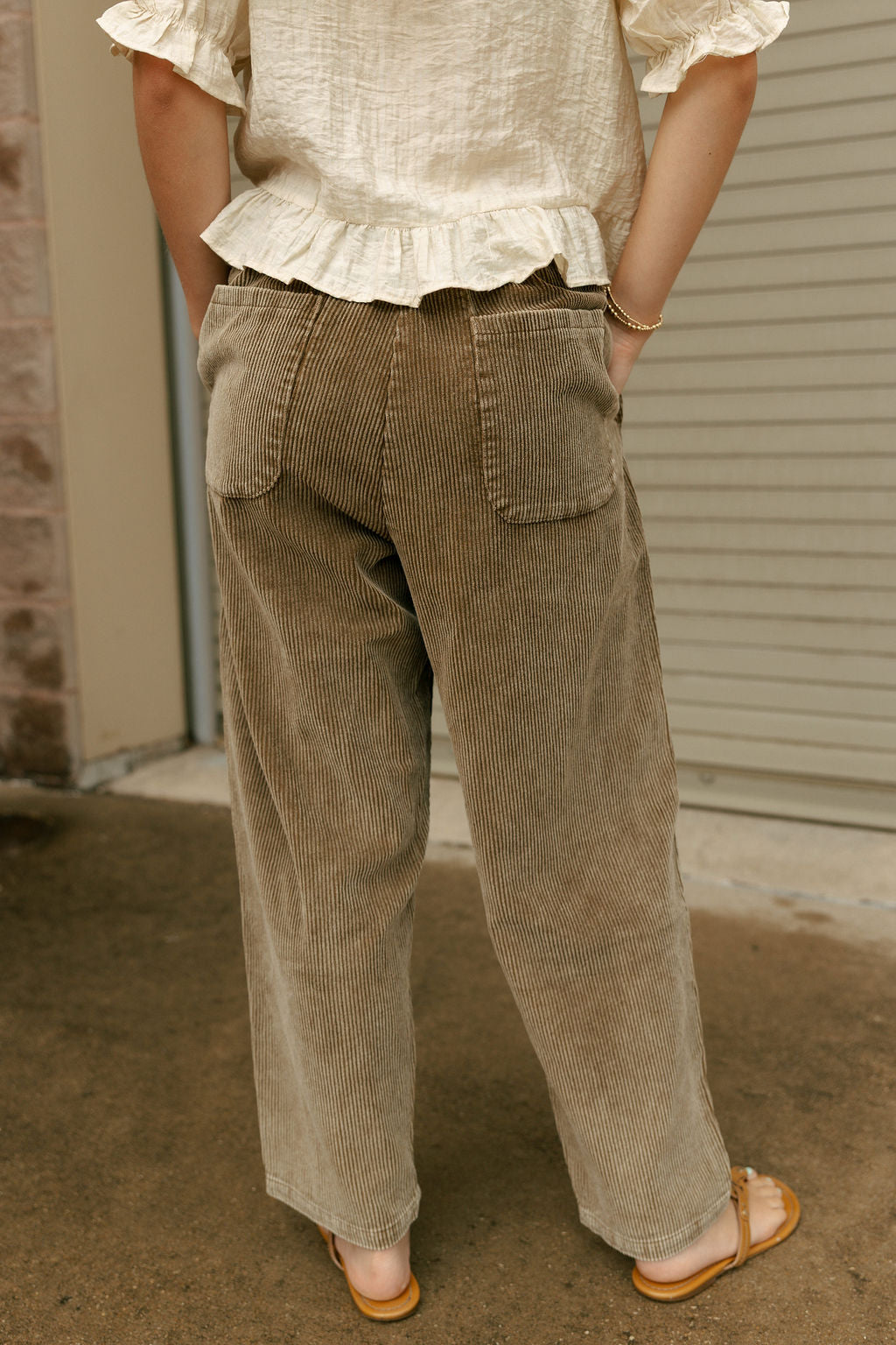 These Washed Cord Pants in olive combine comfort and style with a high-rise fit and elastic waistband for a perfect, flexible hold. The adjustable drawstring lets you customize the fit, while practical pockets add convenience. Their cropped length makes them versatile for year-round wear, effortlessly pairing with your favorite tops for a unique, laid-back look.