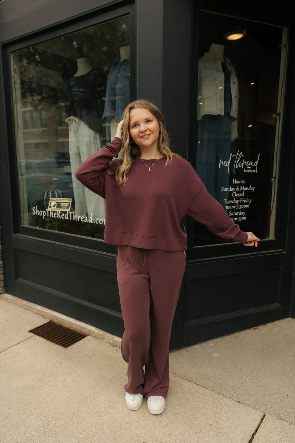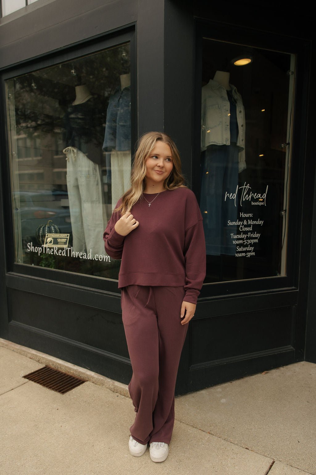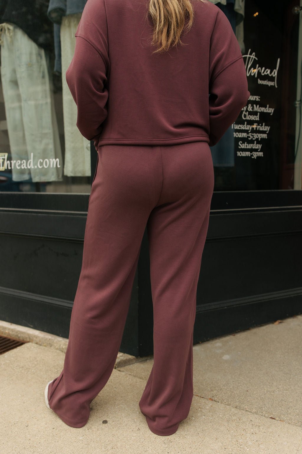 These Scuba Pants in Dark Plum offer a perfect blend of comfort and style. Made with soft fabric, they feature an adjustable drawstring waist for a personalized fit and a flattering mid-rise design. Equipped with convenient pockets, these pants are ideal for lounging year-round with ease and effortless comfort.