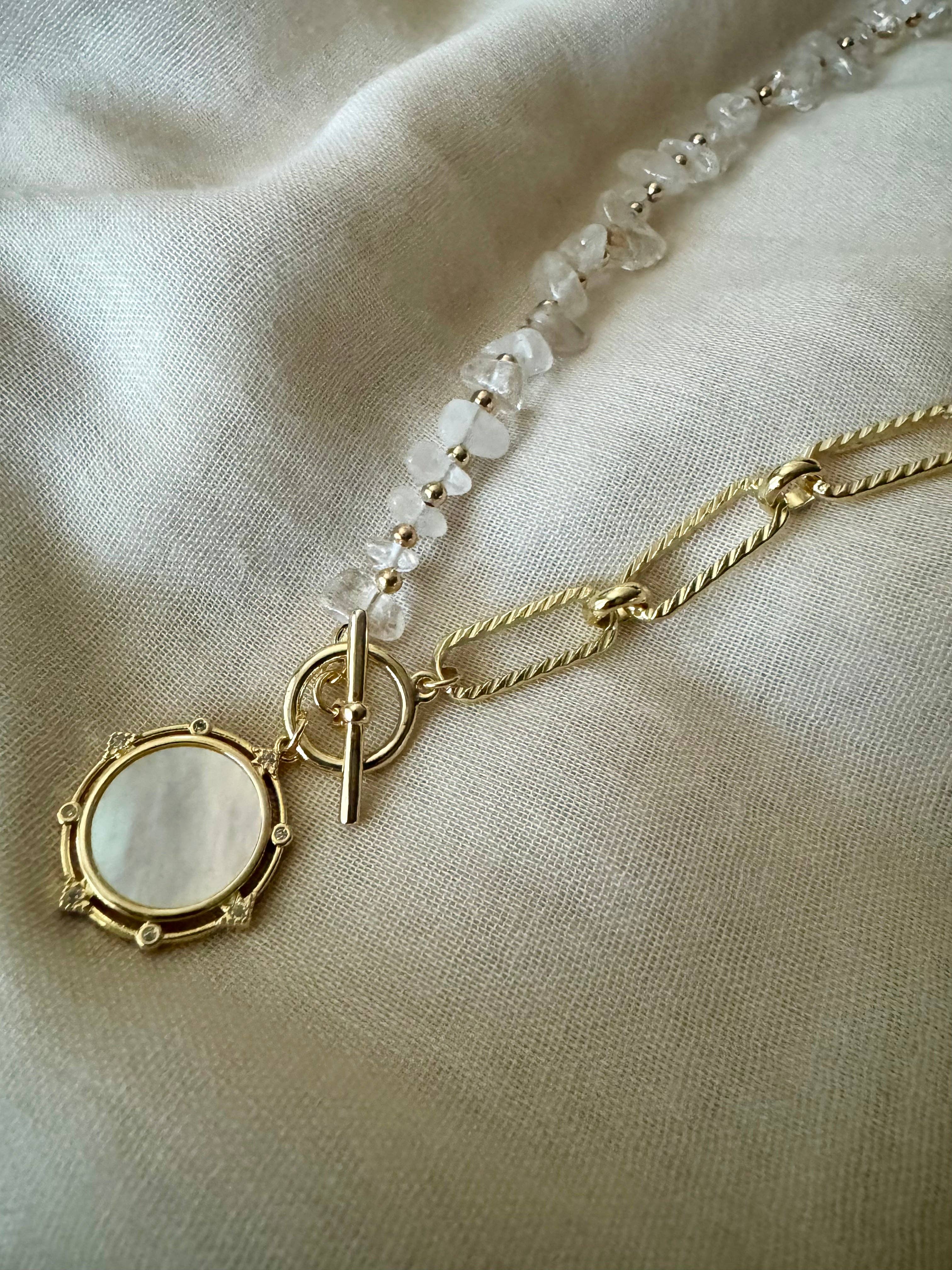 Get ready to shine with Jia, the perfect accessory for any occasion. The white semi clear polished organic shape of the quartz adds a touch of elegance, while the gold finish and mother of pearl pendant provide a subtle sparkle. Whether dressing up or down, Jia will have you looking and feeling your best. Only a few left, so grab it while you can!