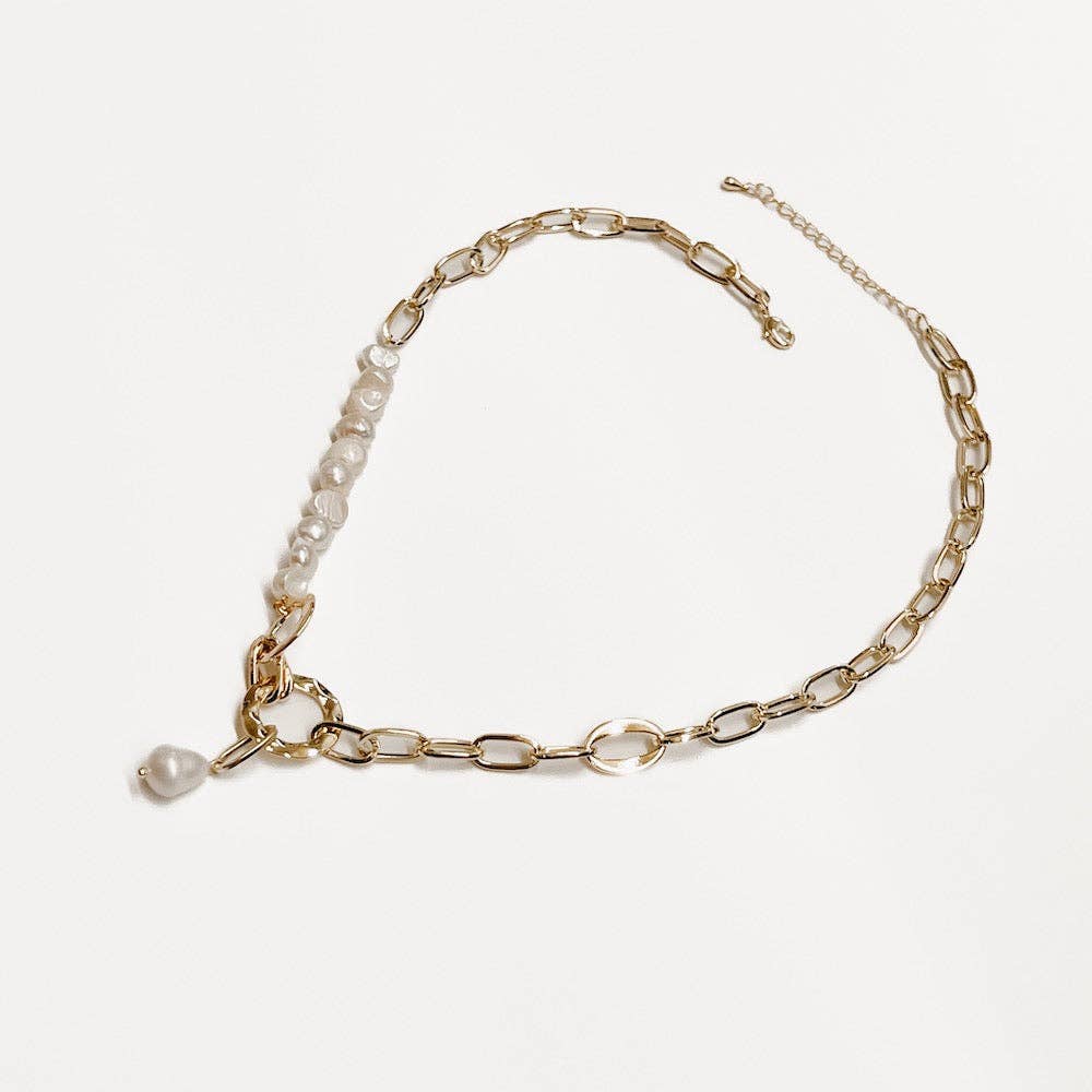 Meet a new addition to our waterproof collection - the Pacific Pearl Link Chain Necklace! This accessory is elegant, eye catching, and dainty while still being a great statement piece. It's made from 18k gold plated stainless steel, and is waterproof, tarnish resistant, and expected to last up to 1-2 years. Style the Pacific Pearl Link Chain Necklace with your favorite Pretty Simple waterproof pearl hoops for a completed look!