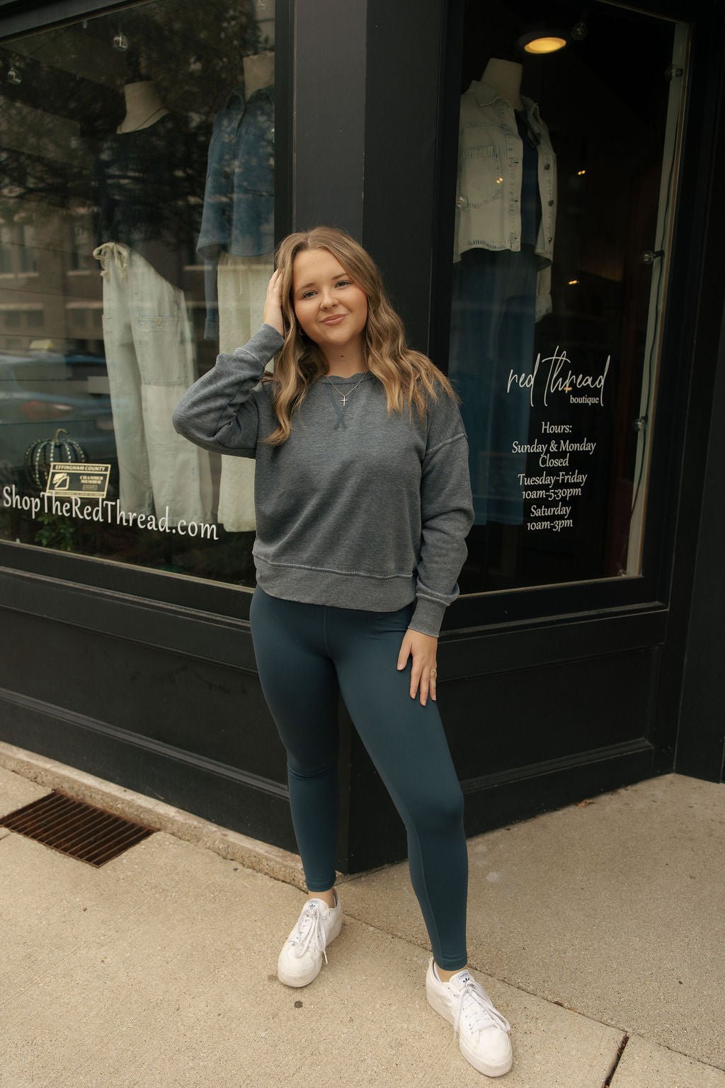 This navy burnout sweatshirt offers a soft, comfortable fit with long sleeves perfect for year-round wear. Its cropped, mid-length design adds a stylish edge while keeping you cozy throughout the seasons. An easy staple for any wardrobe.