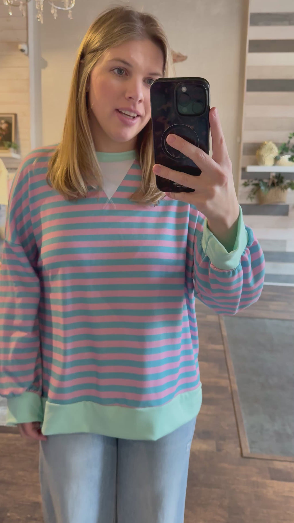 Description: Our Harlow Striped Pullover in Teal/Pink by Haptics is a lightweight and comfortable staple that’s perfect for spring and summer, featuring soft stripes and a relaxed feel that’s great for everyday wear or lounging. Easy to style, it pairs effortlessly with jeans, shorts, leggings, or even a cute biker short for a casual outfit that still feels fun and put together.