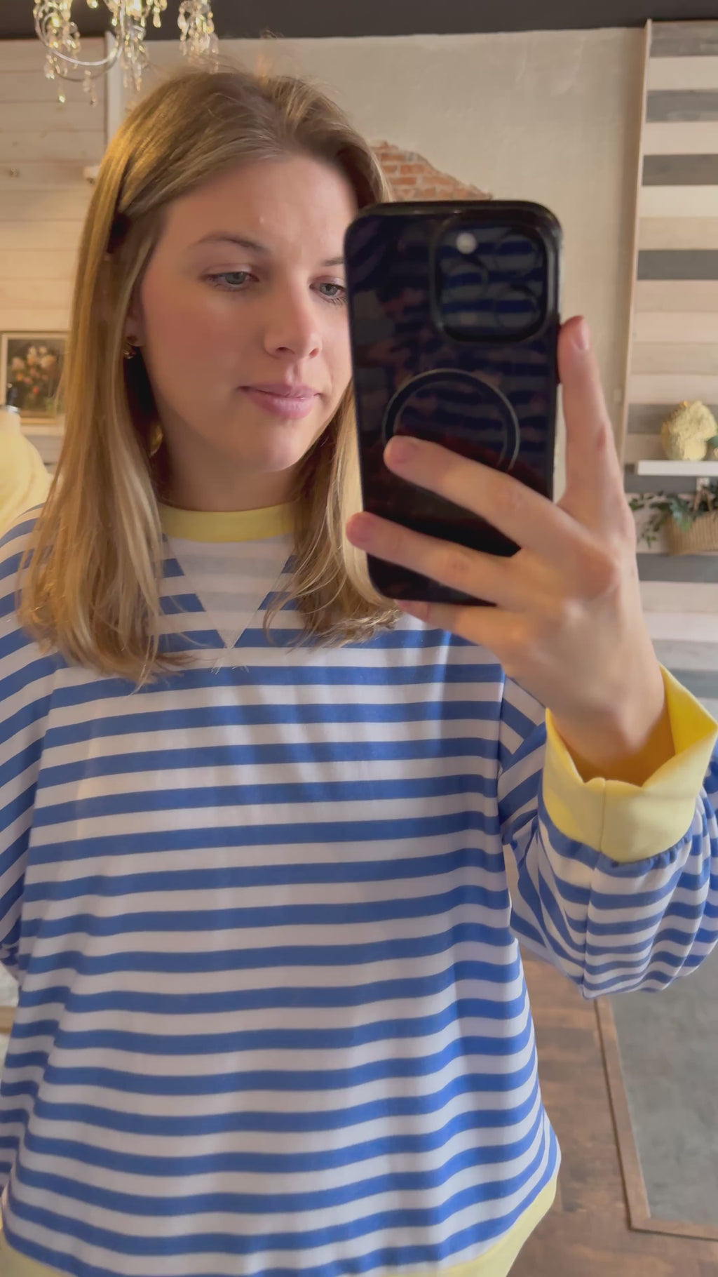 Description: Our Harlow Striped Pullover in Blue/Yellow by Haptics is a lightweight and comfortable staple that’s perfect for spring and summer, featuring soft stripes and a relaxed feel that’s great for everyday wear or lounging. Easy to style, it pairs effortlessly with jeans, shorts, leggings, or even a cute biker short for a casual outfit that still feels fun and put together.