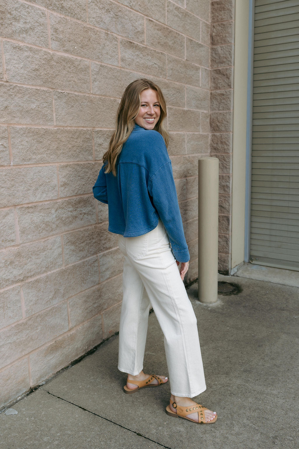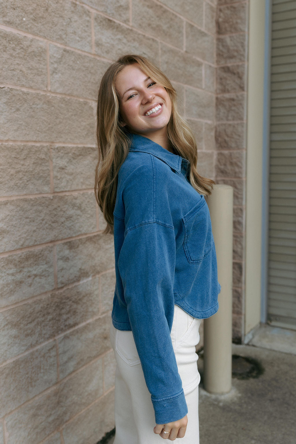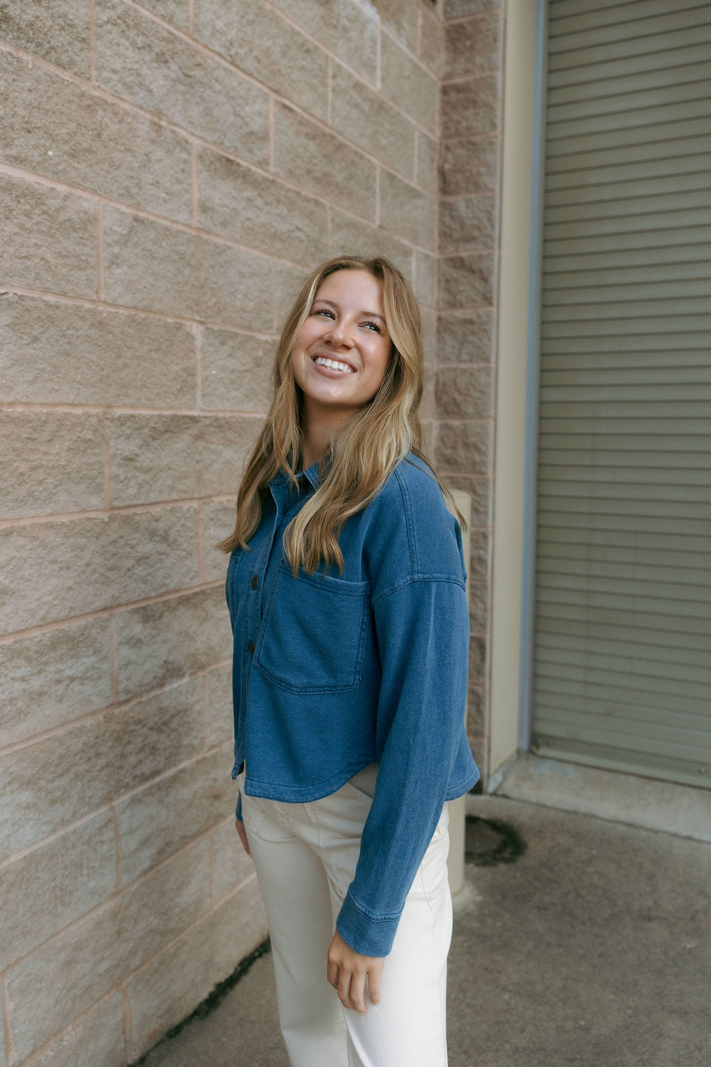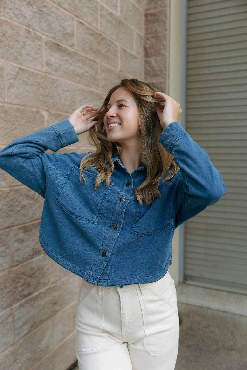 Fit: True to size, cropped length, collared neckline, full button up front, long sleeve, front patch pockets. Model is wearing a size small.