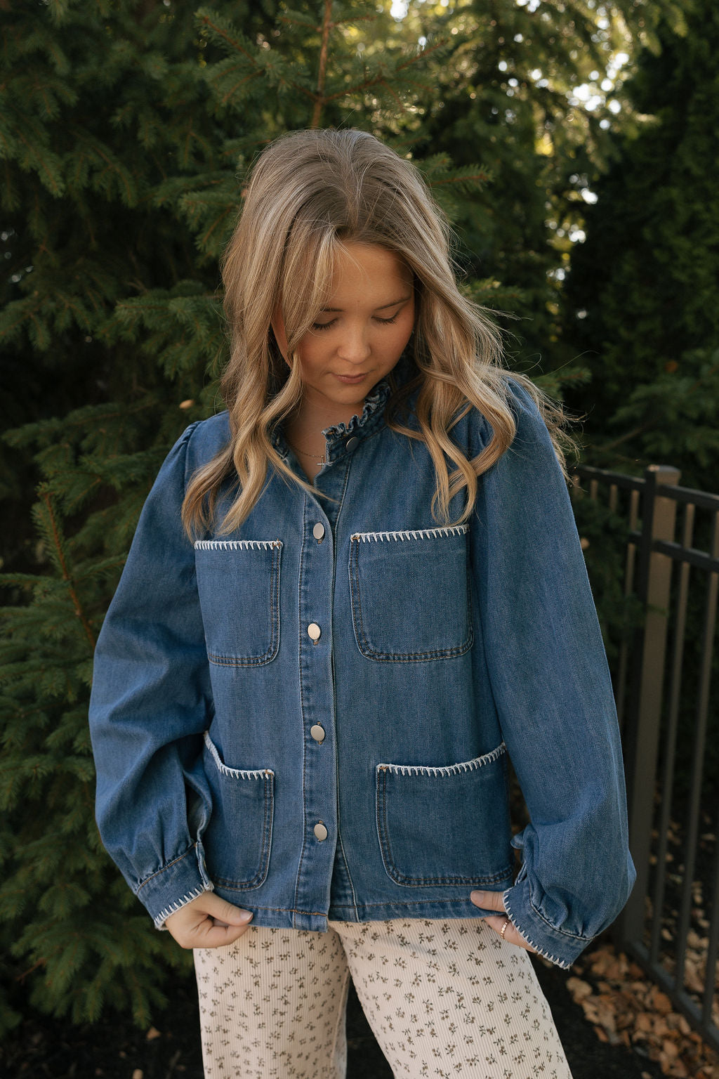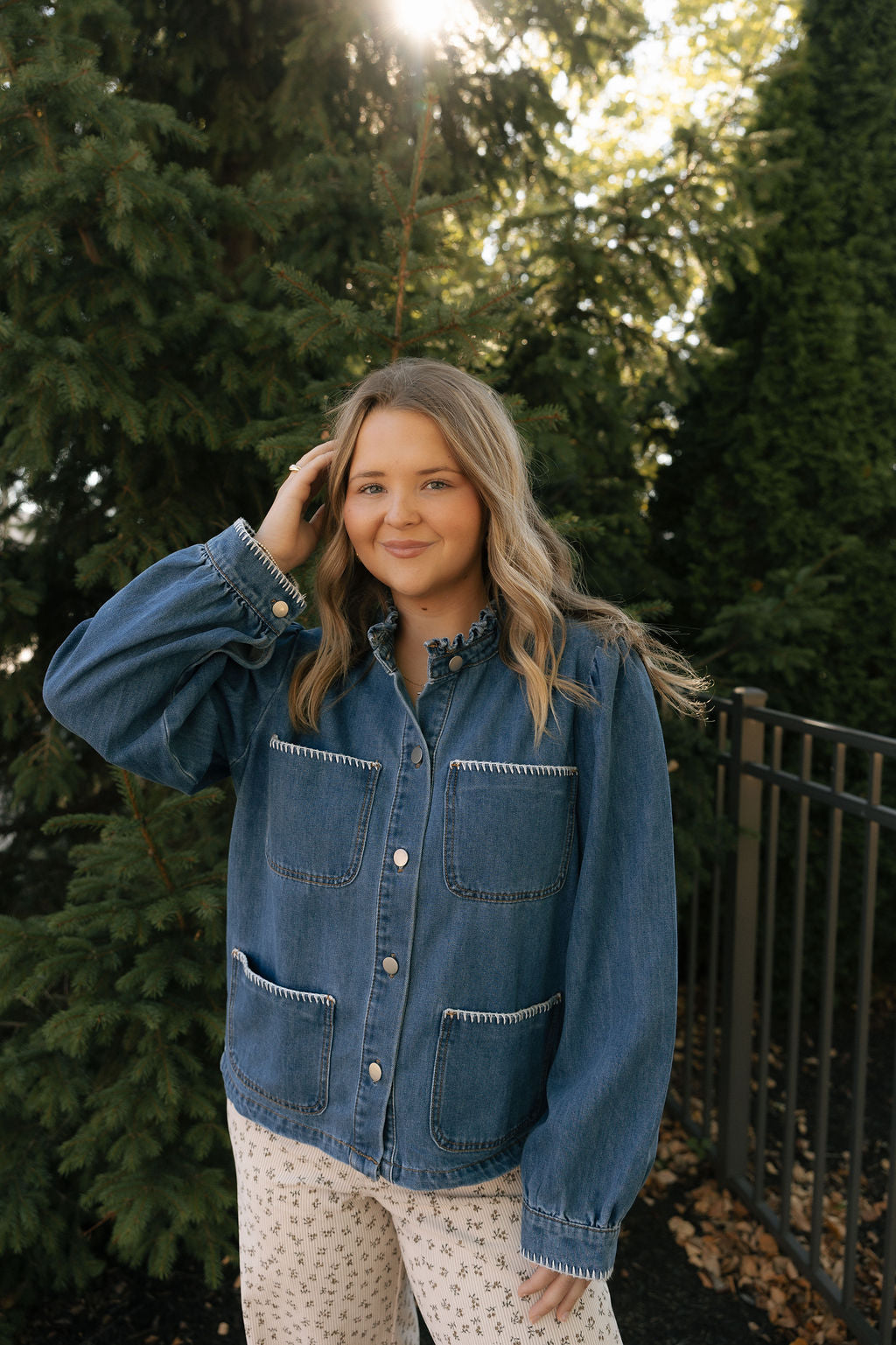 This Stitched Denim Jacket offers a fun, relaxed fit perfect for year-round wear. Its long sleeves and beautiful detailing add a stylish touch while ensuring comfort and versatility. Whether layered or worn on its own, it’s a standout piece that blends casual ease with distinctive design.