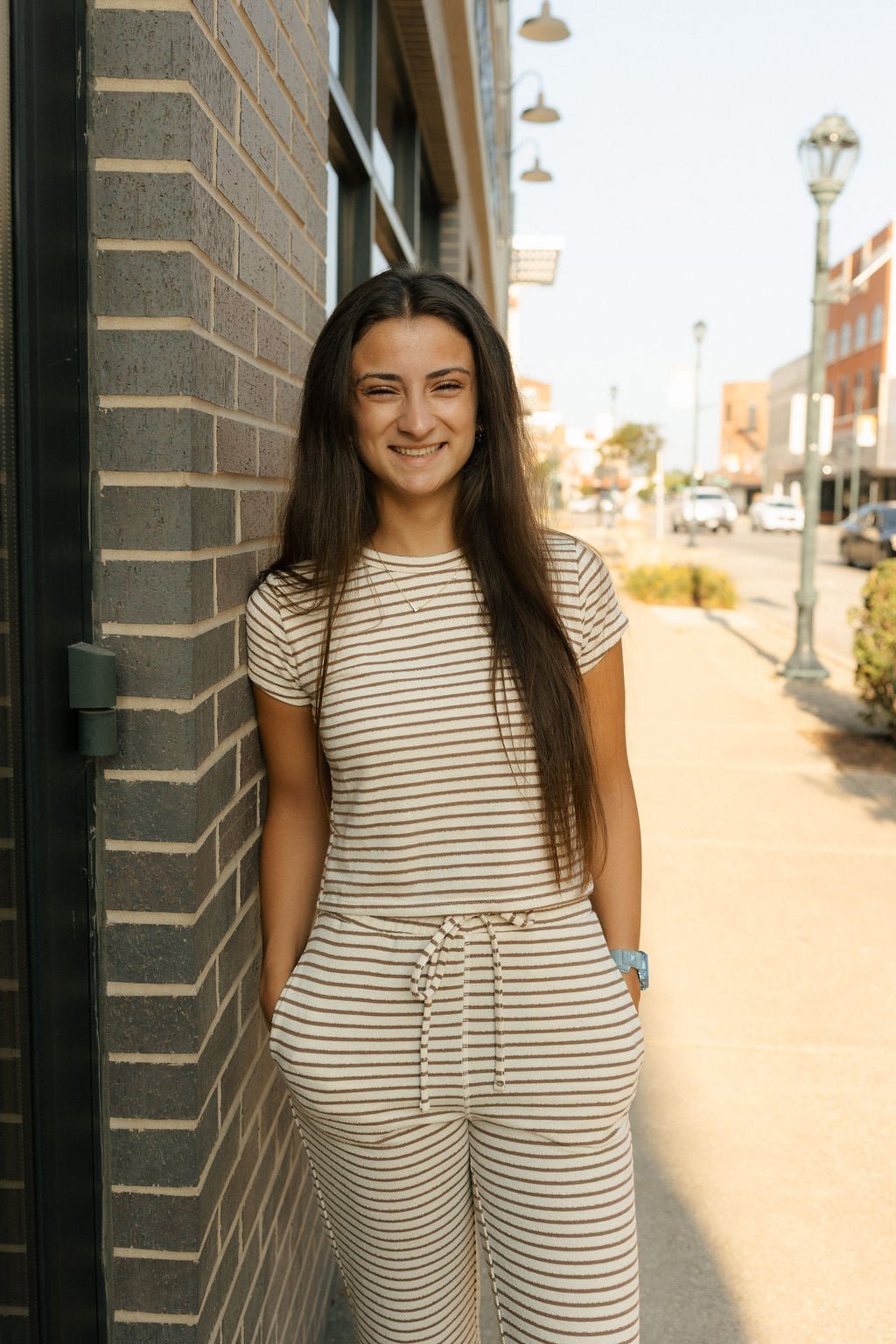 Experience all-day comfort with the Find Your Soft Stripe Pants in Cream Mocha. These full-length, high-rise lounge pants offer a relaxed fit and practical pockets, perfect for year-round wear. Designed for effortless style and cozy ease, they quickly become your go-to for laid-back days.