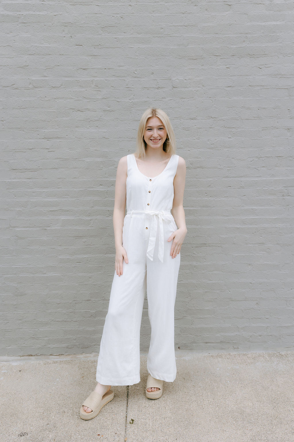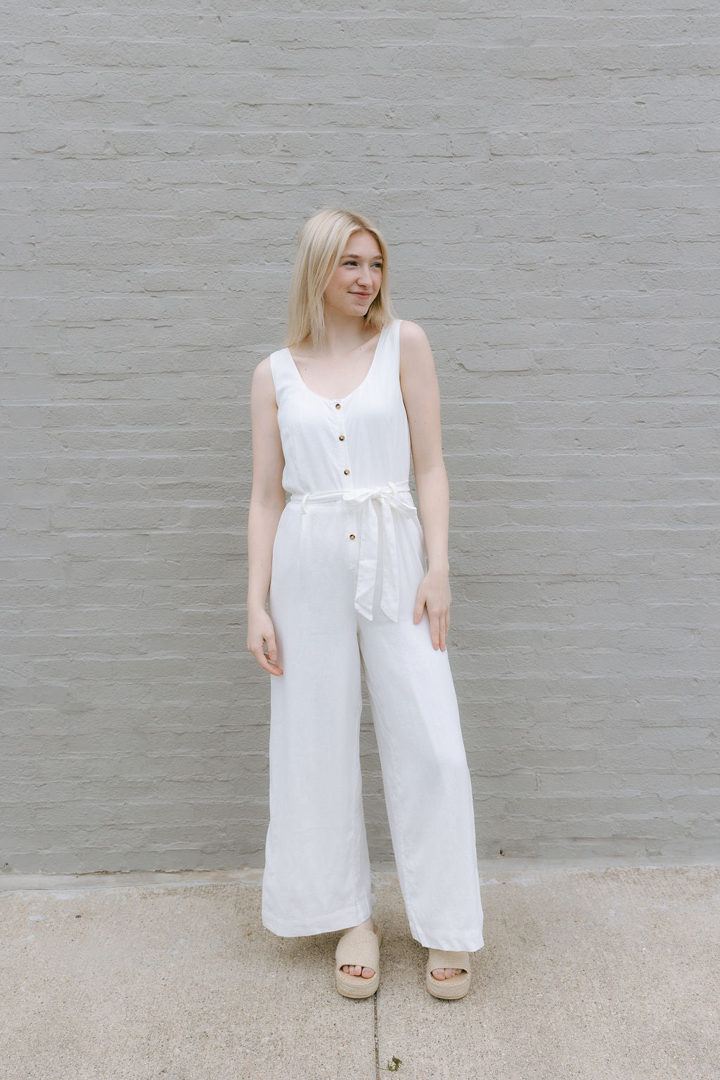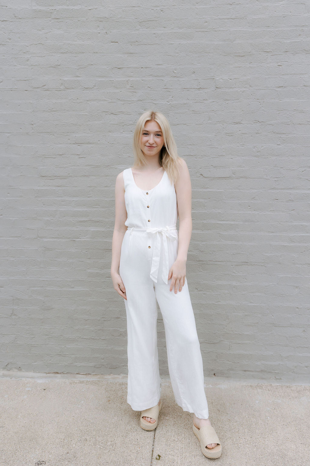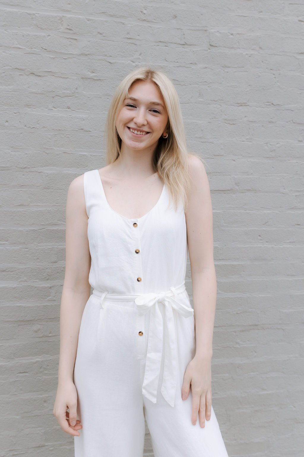 Embrace effortless warm-weather style with this airy white linen jumpsuit. The sleeveless silhouette features a flattering round neckline and convenient button-down front closure, while the full-length design offers sophisticated versatility. Perfect for breezy spring days or balmy summer evenings when comfort meets understated elegance.