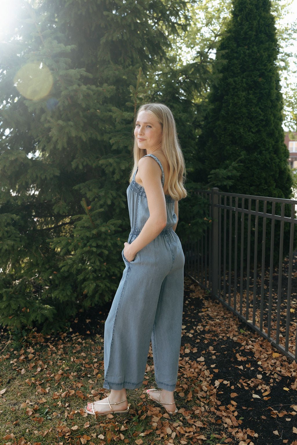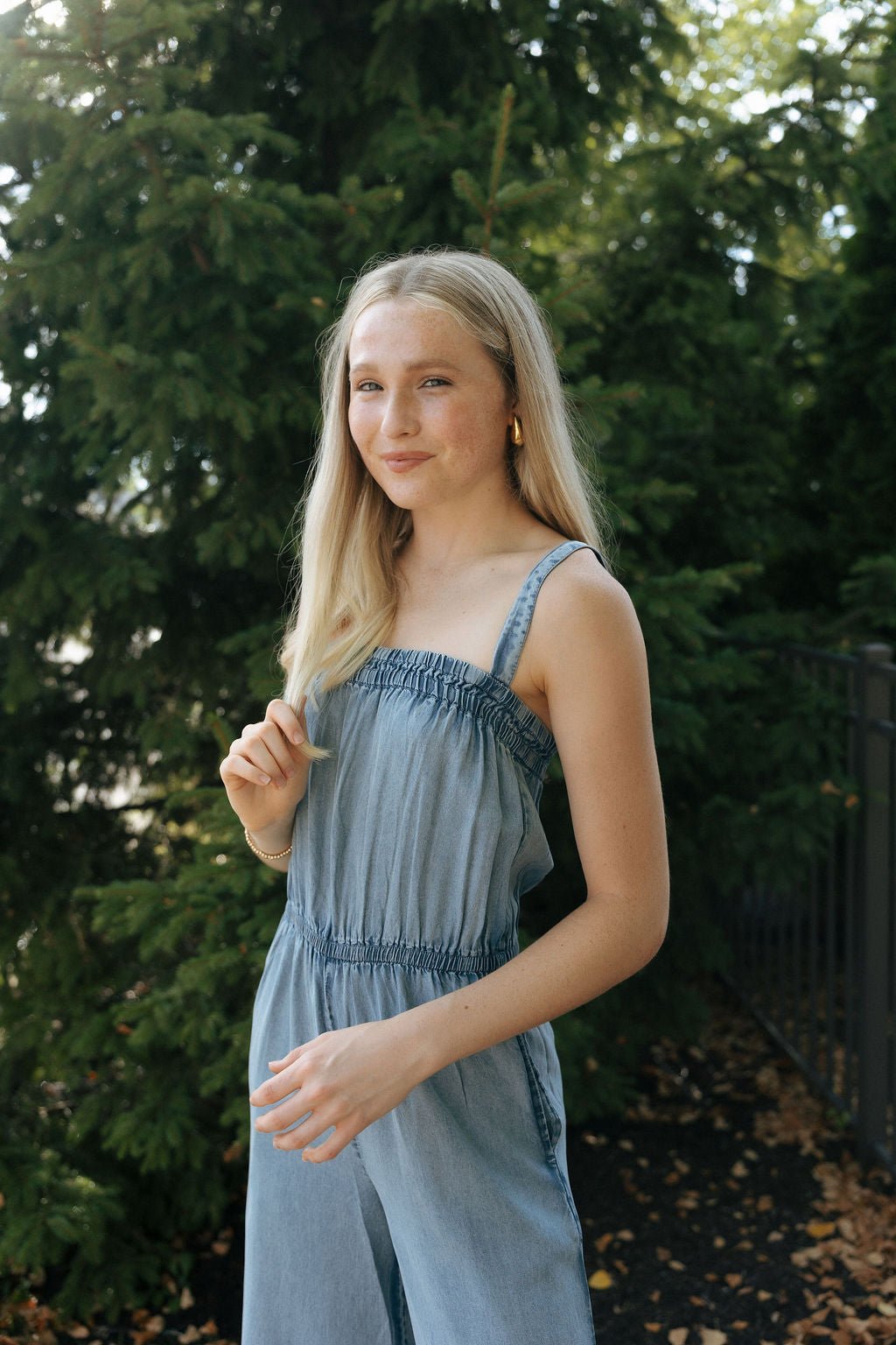The Solara Chambray Jumpsuit is your perfect summer companion, featuring a flattering square neckline and adjustable straps for a custom fit. Made from stretchy, comfortable fabric, it moves with you all day long. Practical pockets add convenience without sacrificing style, making this jumpsuit both functional and effortlessly chic.