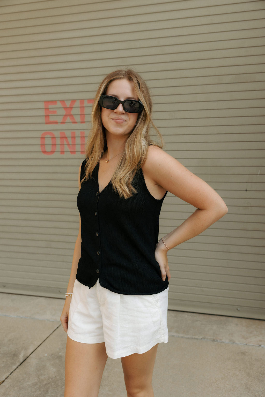Fit: True to size, full length, v-neckline, full front button up, sleeveless. Model is wearing a size XS.