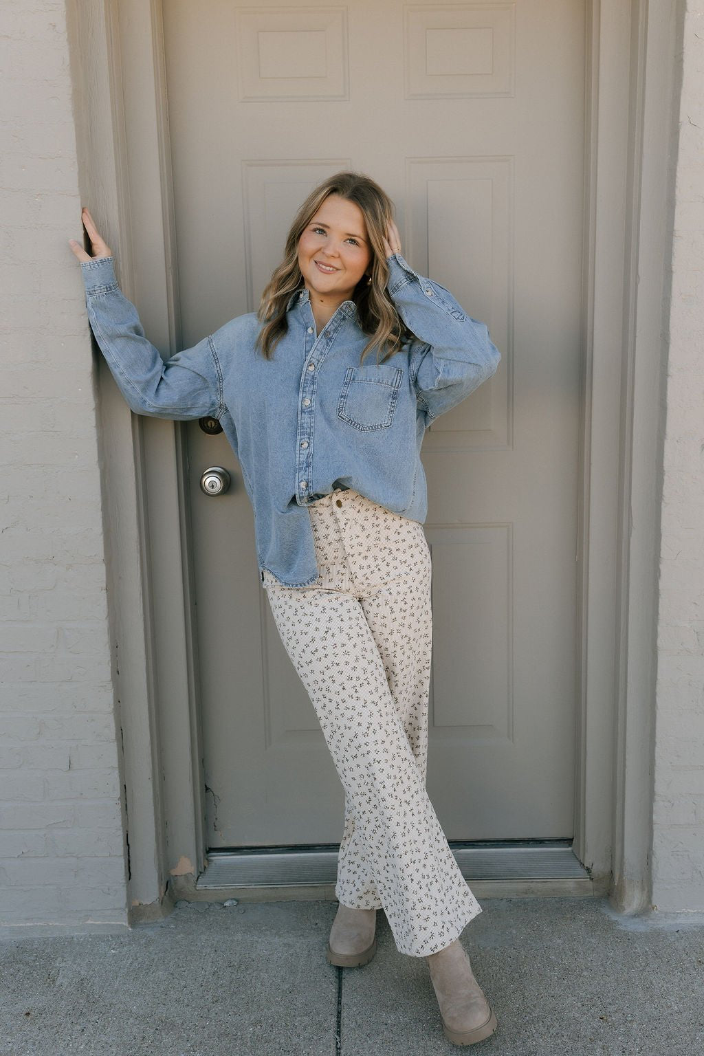 Fit: Relaxed fit, long sleeve, front chest pocket, full front button down for closure. Model is wearing a size small.