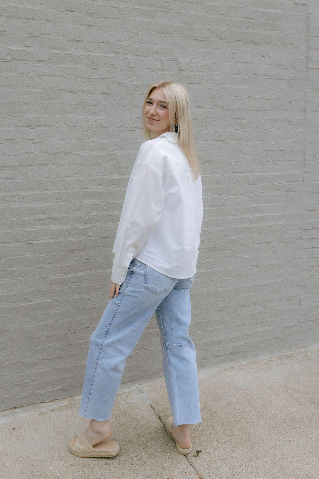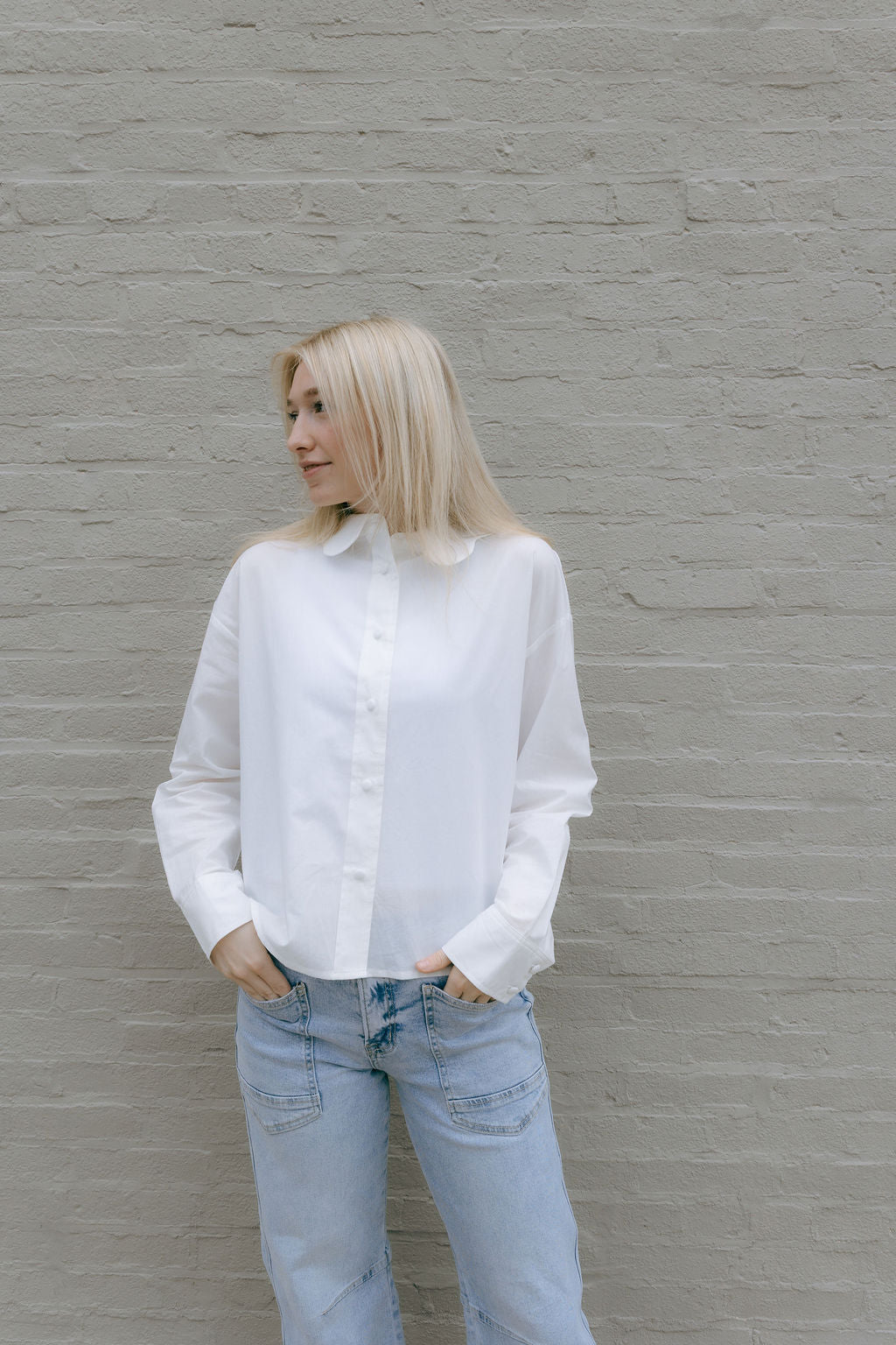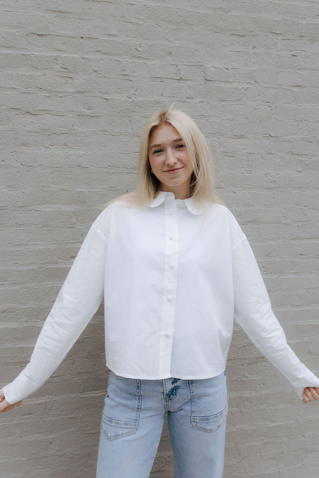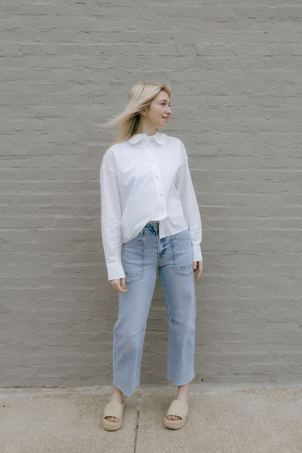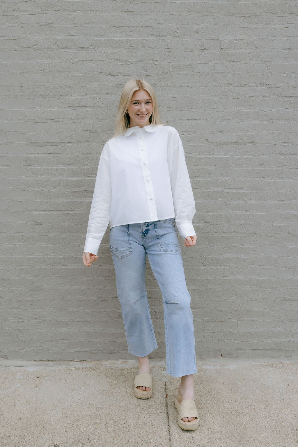 Elevate your spring and summer wardrobe with this sophisticated white Scallop Collar Shirt. The distinctive round neckline with scalloped detailing creates an eye-catching focal point, while the full-length silhouette and button-down front offer versatile styling options. Long sleeves add a touch of elegance, making this piece perfect for dressy occasions when temperatures rise.