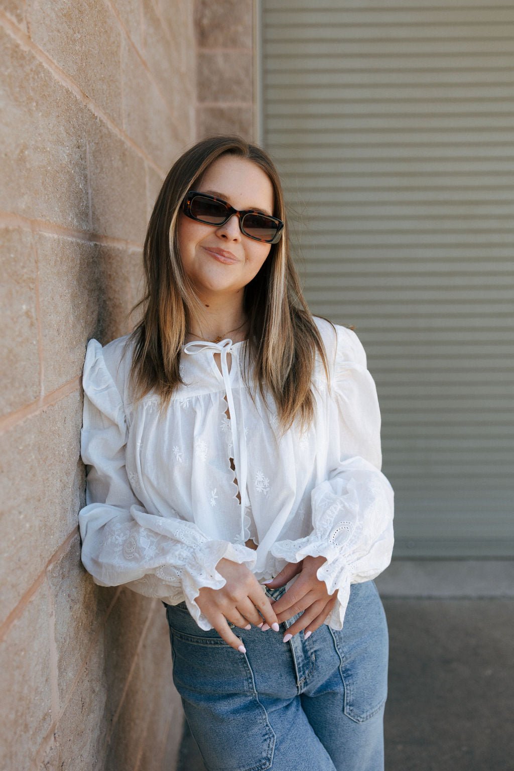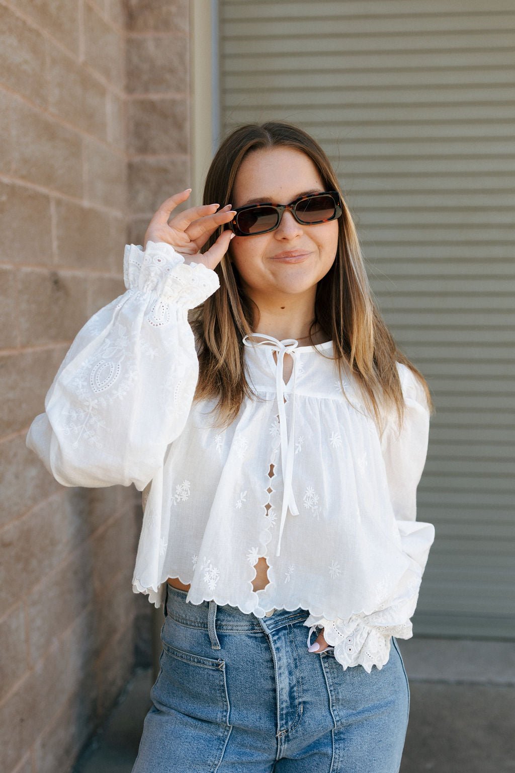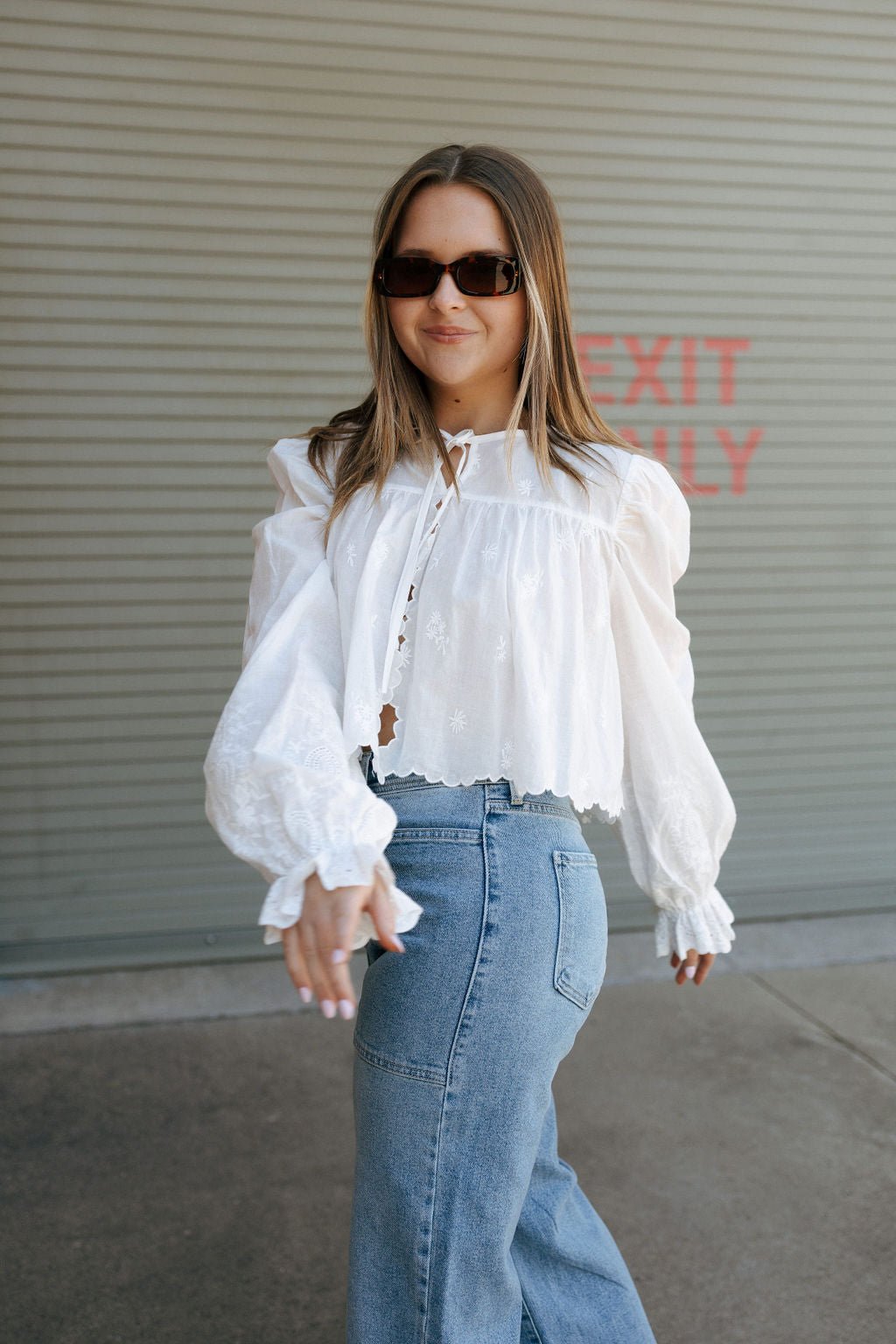 Fit: True to size, cropped length, long sleeve with a flared/scalloped cuff, stitched flower detail, tie front for closure. Model is wearing a size small. Measurements for a size small: Length from top to bottom of blouse- 18" / Sleeve length- 26.5" / Bust- 28"
