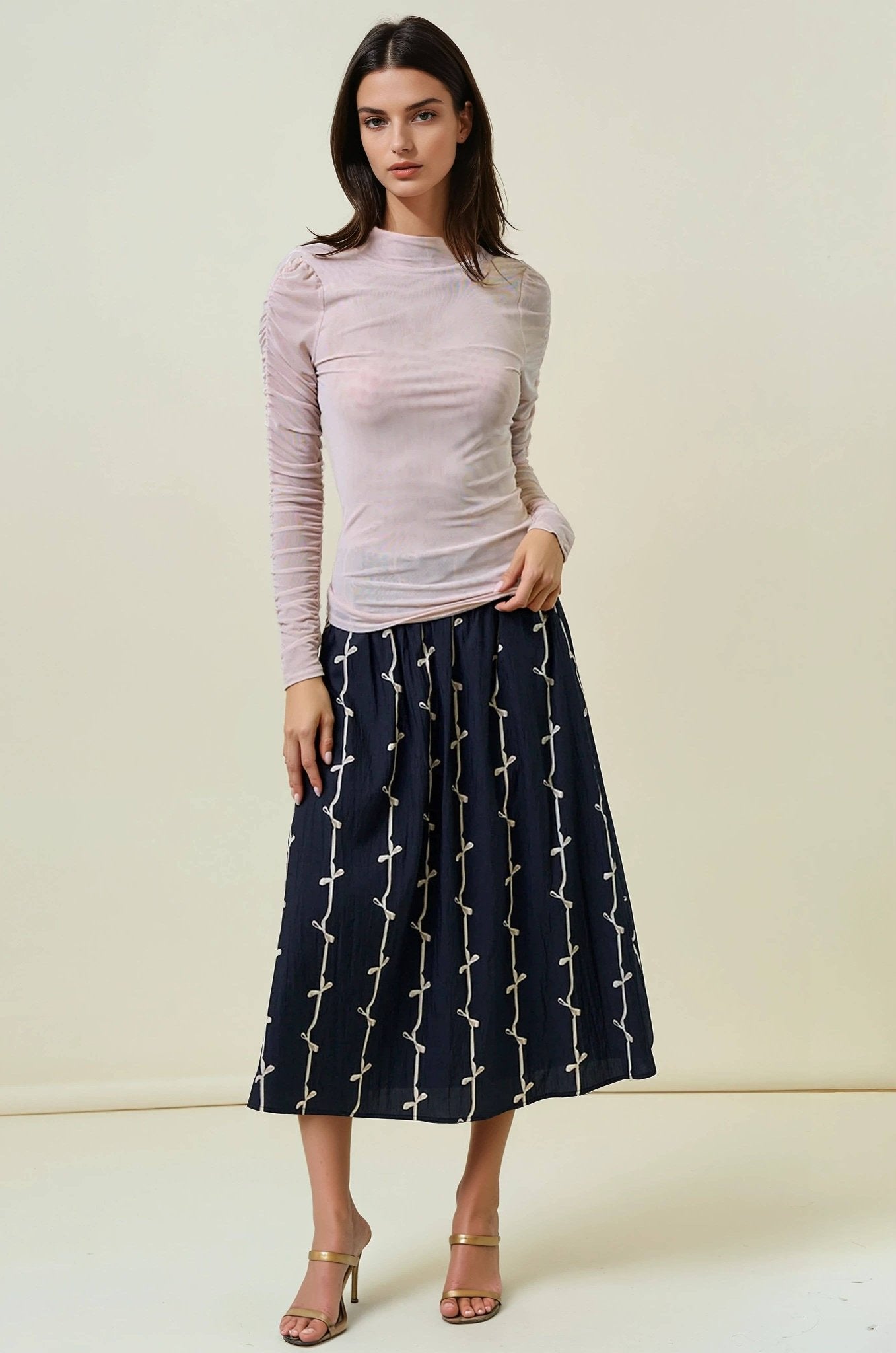SEMI SHEER SHIRRED SLEEVE MOCK NECK LONG SLEEVE TEE - Semi-sheer mock neck tee with a subtle, elegant appearance - Long sleeves with shirred, ruched detailing for added texture and style - Fitted silhouette that accentuates the figure - Keyhole button closure at the back of the neck for easy dressing STYLE MEASUREMENTS (SIZE SMALL) - TOTAL LENGTH 24" - SHOULDER 13" - BUST 16 1/2" - WAIST 14 1/2" - SLEEVE LENGTH 25" 95%POLYESTER, 5%SPANDEX| BUST 34" | WAIST 25" | HIPS 37" WEARING SMALL