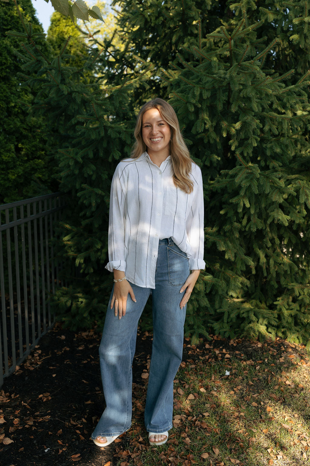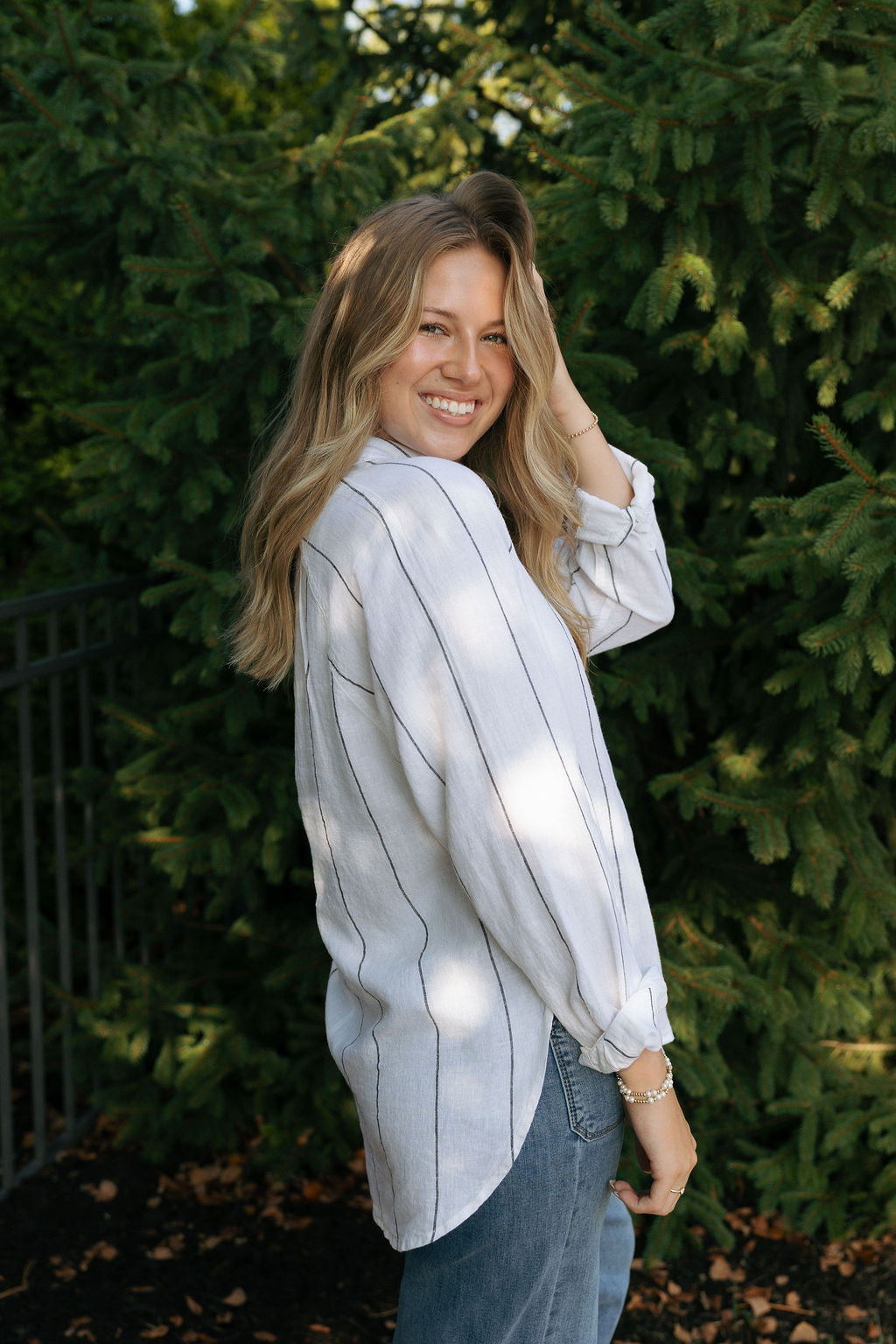 Experience effortless style with The Perfect Line Top by Z Supply. This oversized, full-length shirt features a full front button-up design and long sleeves, making it a versatile choice for year-round wear. Its relaxed fit offers comfort without sacrificing chic appeal, perfect for layering or wearing solo. Elevate your wardrobe with this timeless white top that blends ease and elegance seamlessly.