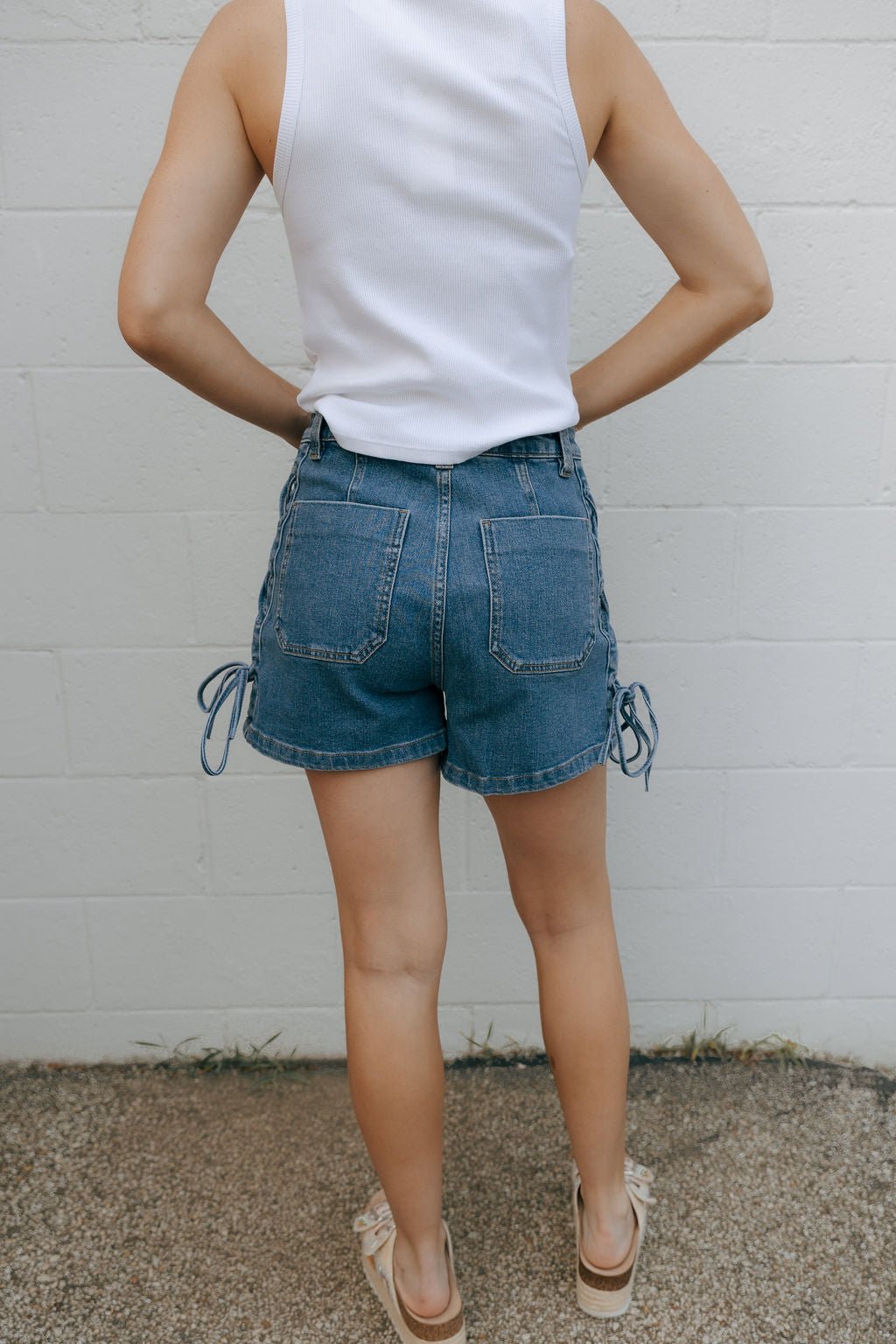 Step into sunny days with the P4594 Lace Up On The Side Denim Shorts. Featuring fun button and zipper closures, these shorts combine style and ease. Front and back pockets add practicality, perfect for carrying essentials on your spring and summer adventures. The unique lace-up detail on the side gives a playful twist to classic denim, making these shorts a standout choice for warm-weather fun.