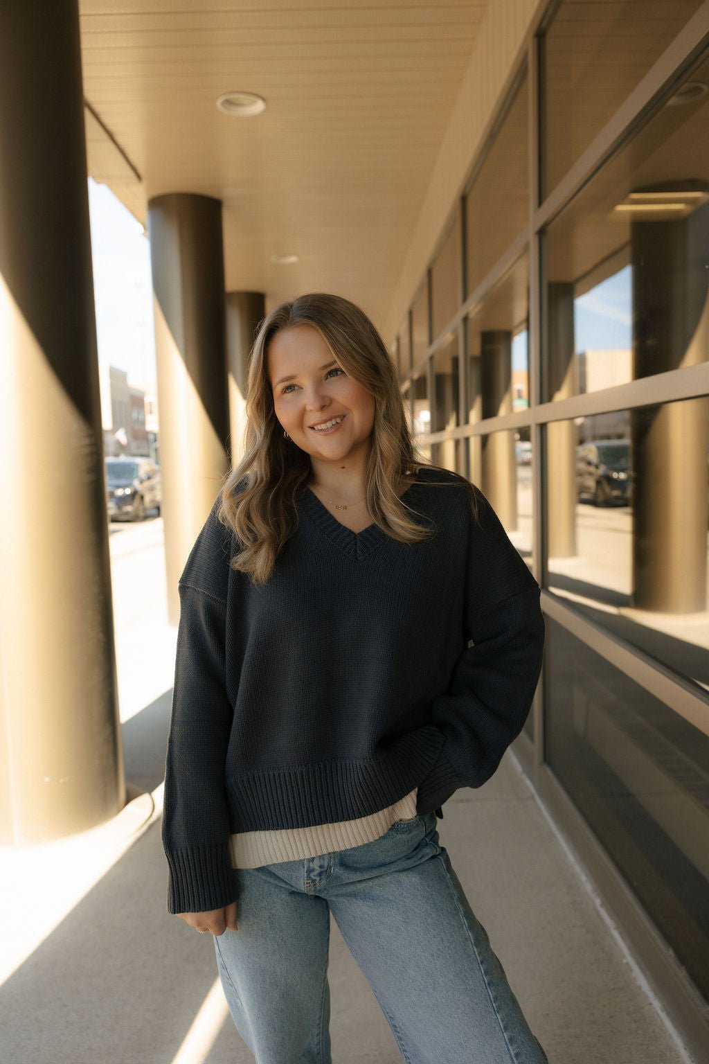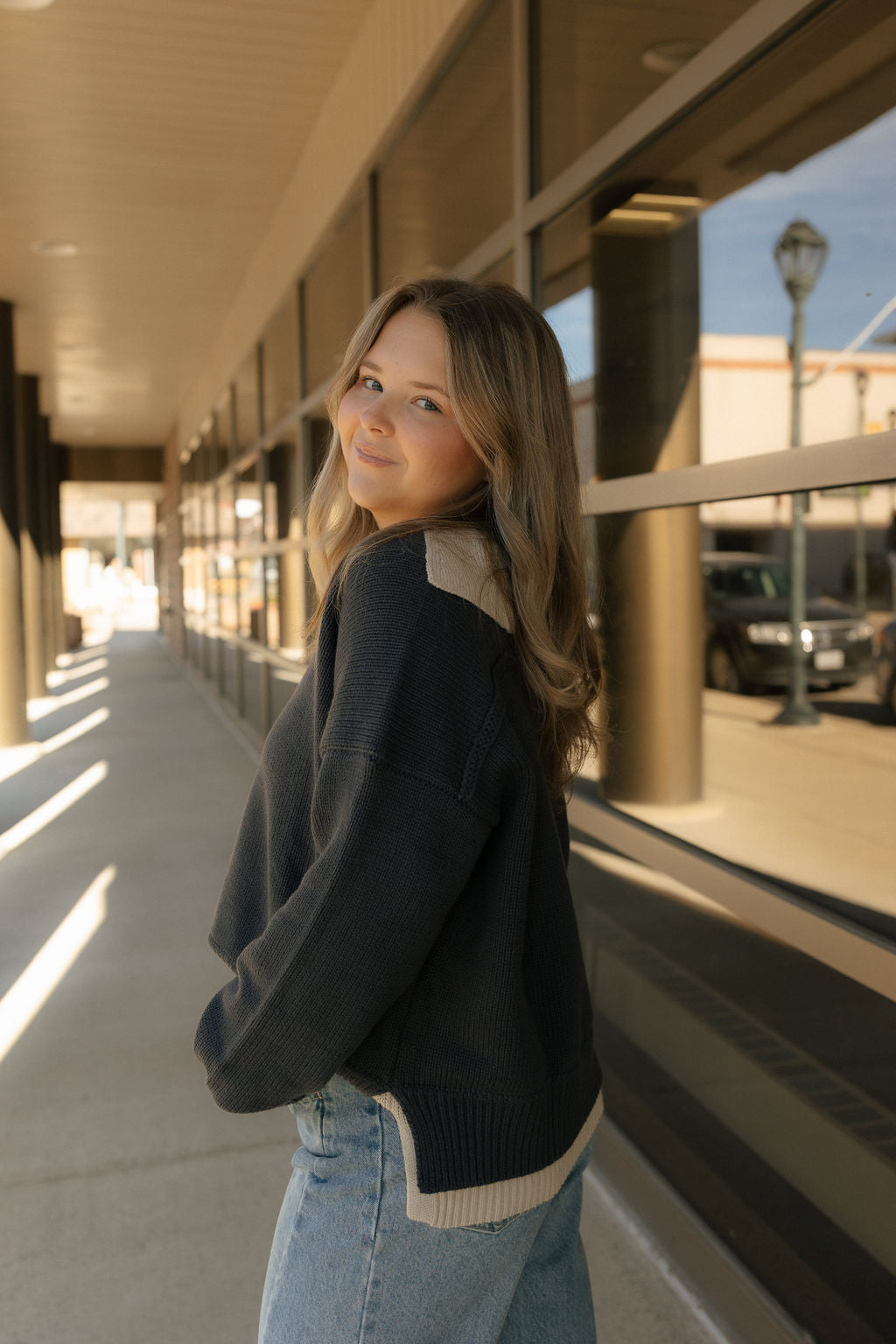 This Navy Color Combo Sweater features a relaxed fit with a collared V-neck and long sleeves, making it perfect for fall and winter. Its full-length design offers comfortable coverage, blending style and warmth effortlessly for cooler days.