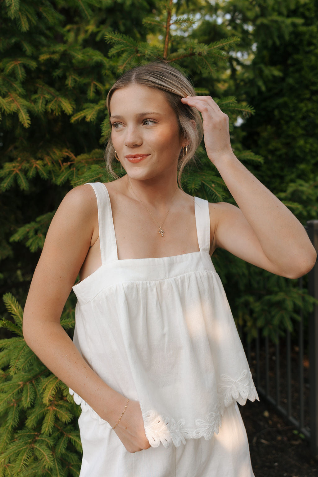 The Annecy Tank in crisp white features a flattering square neckline and sleeveless design, perfect for warm days. Adjustable straps ensure a personalized fit, while its cropped length adds a modern edge to your spring and summer wardrobe. Effortlessly stylish and versatile, this tank pairs beautifully with your favorite high-waisted pieces for a fresh, unique look.