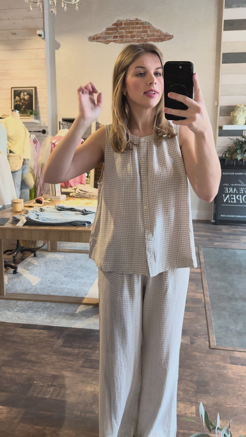 Description: Our Caelis Tank in Sand Gingham by Thread & Supply is a lightweight spring and summer staple, featuring a soft gingham pattern that gives it an effortlessly earthy, relaxed feel. Perfect for creating a comfortable lounge look, it pairs beautifully with the matching Caelis Pants in Sand Gingham or styled with any linen pant for an easy, natural outfit.