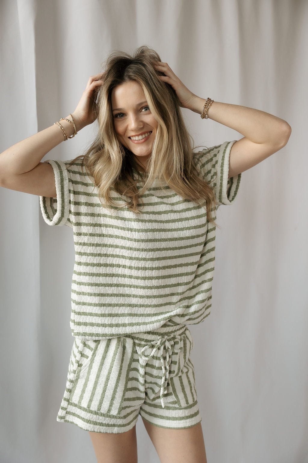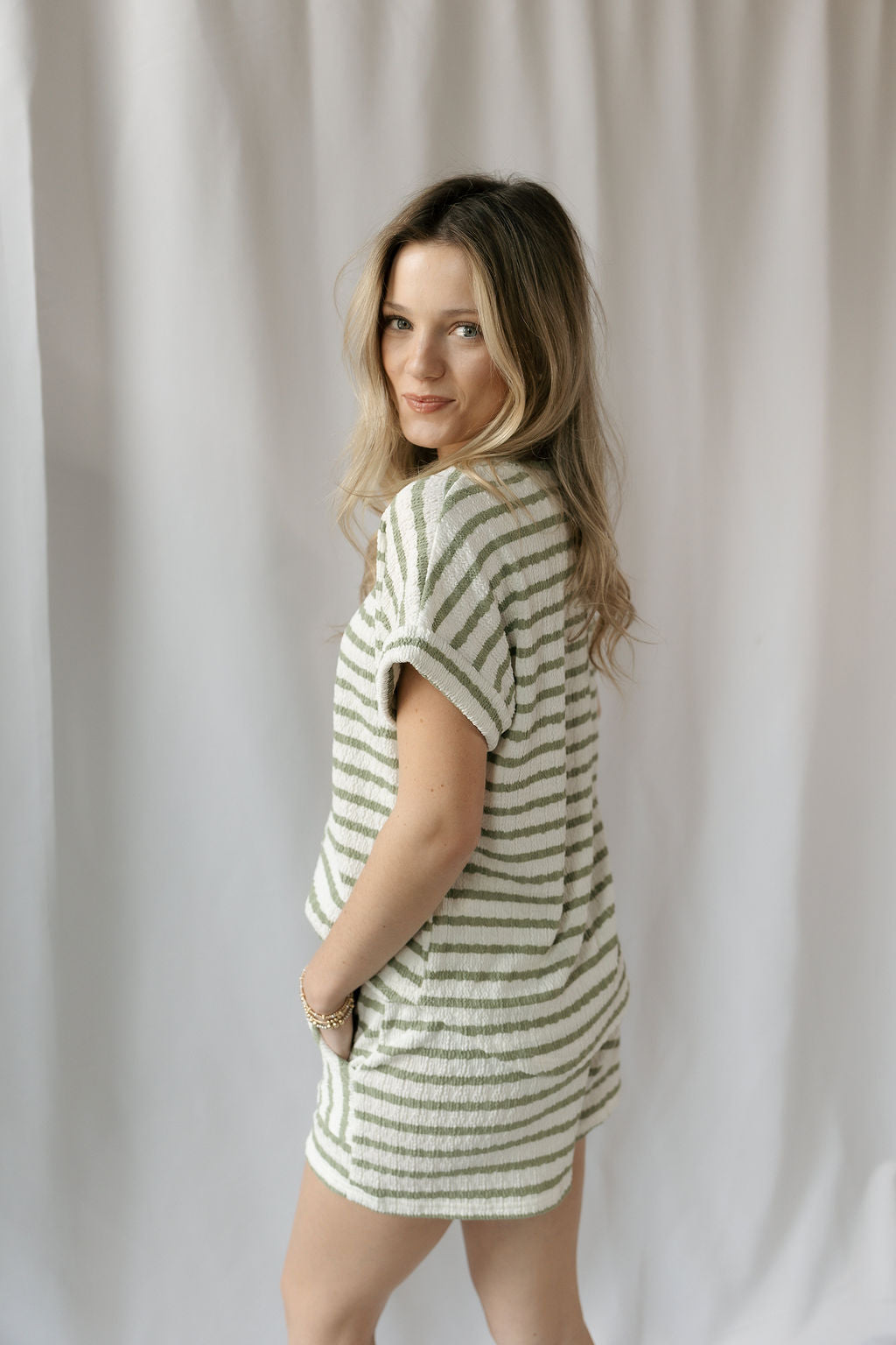 Description: Our Florence Stripe Top in Olive is a simple yet elegant staple for spring and summer, featuring soft stripe detailing and an easy silhouette that makes it perfect for everyday wear. Pair it with the matching Florence Stripe Shorts in Olive for a coordinated look or style it with denim shorts for an effortlessly elevated outfit.