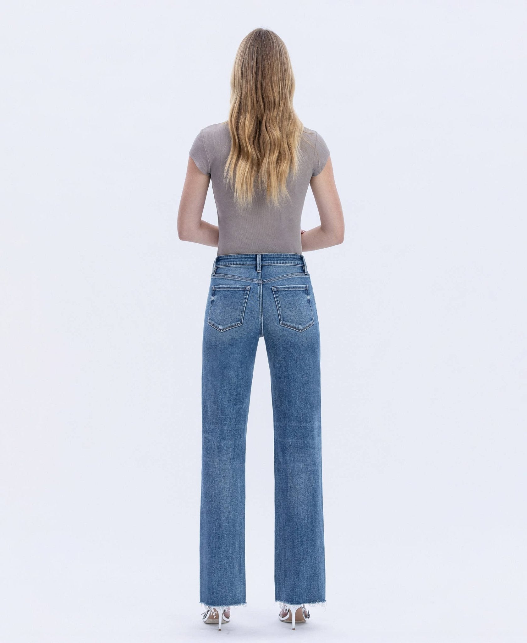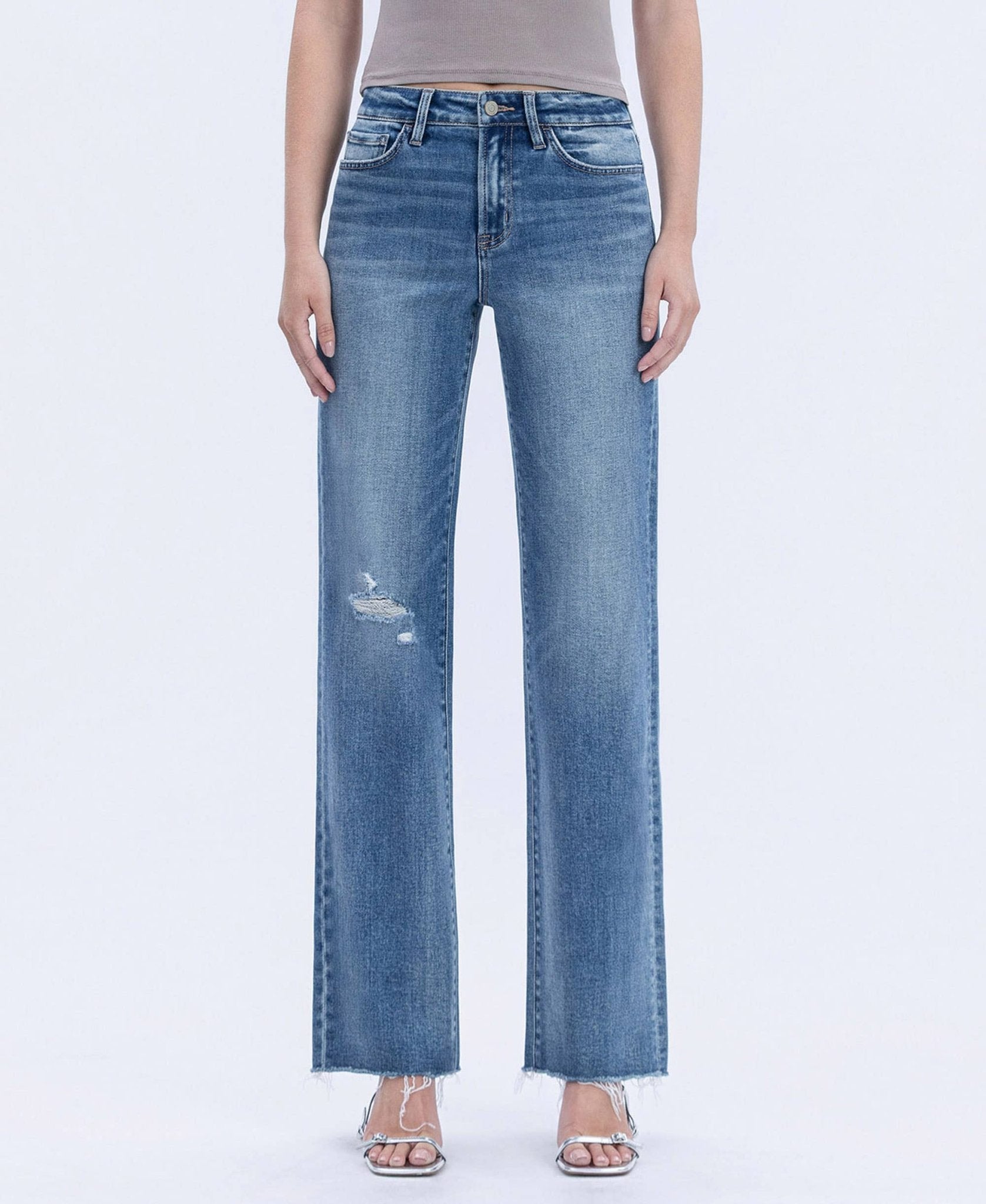 HIGH RISE FRAYED HEM SLIM WIDE JEANS COMFORT STRETCH DENIM, HIGH RISE WAIST, DISTRESSED DETAIL, FRAYED HEM, FULL LENGTH, SLIM WIDE JEANS F. RISE: 10" / INSEAM: 32" / LEG OPENING: 18 1/2"