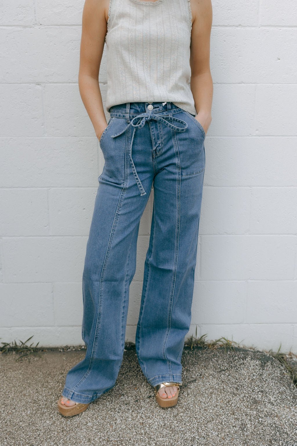 Discover the Tie Waist Denim by Vervet, designed for effortless style all year round. Featuring a flattering tie waist that lets you customize your fit, plus convenient front and back pockets for practicality. This versatile denim pairs perfectly with any top, making it a go-to piece for every season and occasion.