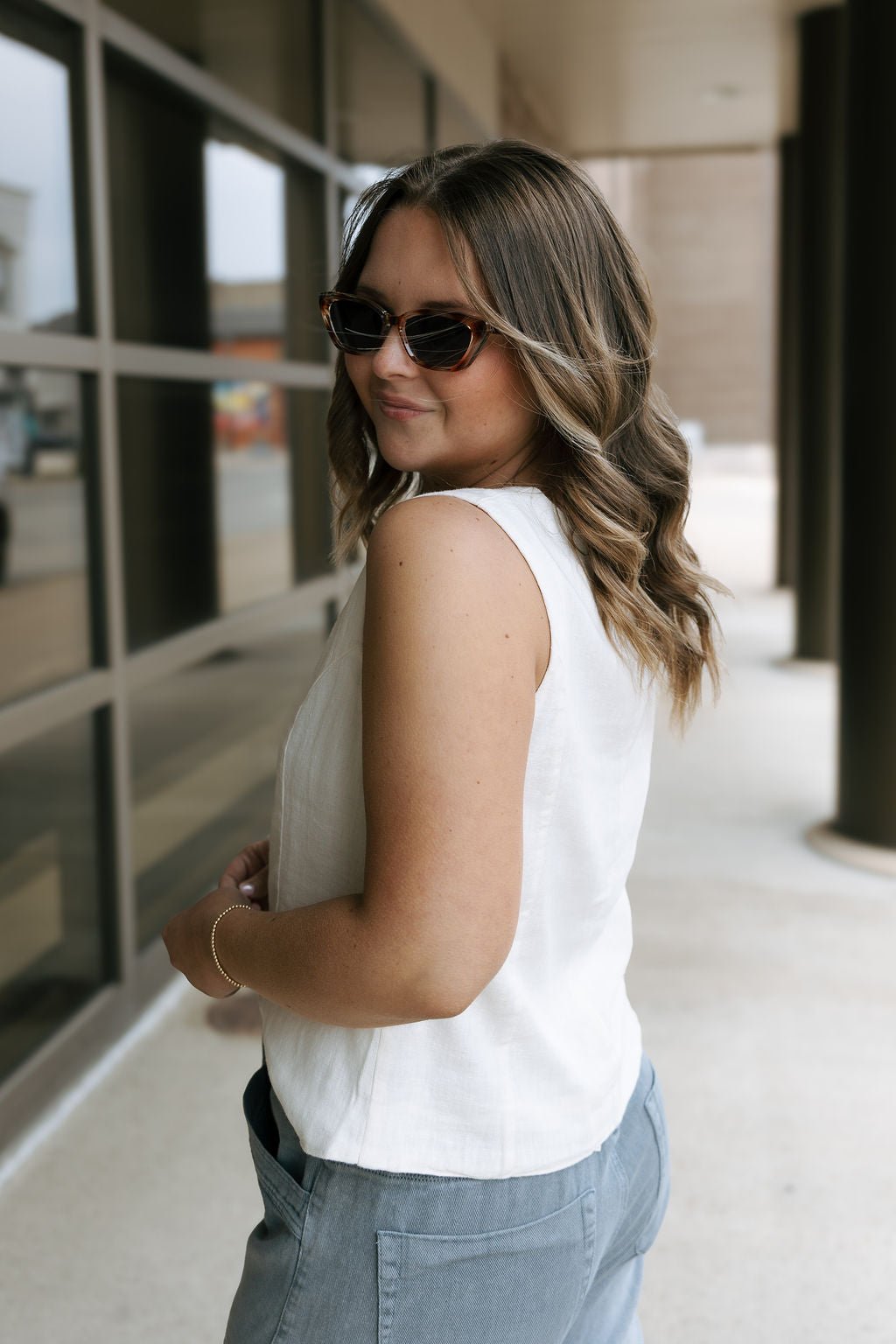 Fit: True to size, v-neckline, mid-cropped length, full button front for closure, sleeveless. Model is wearing a size small.