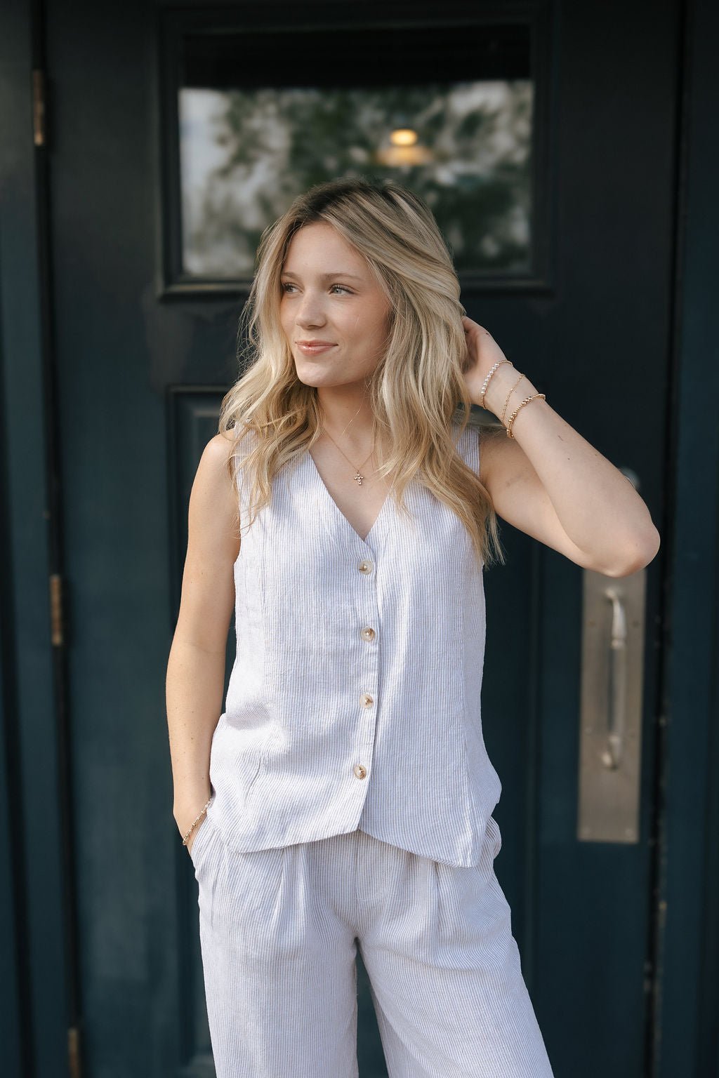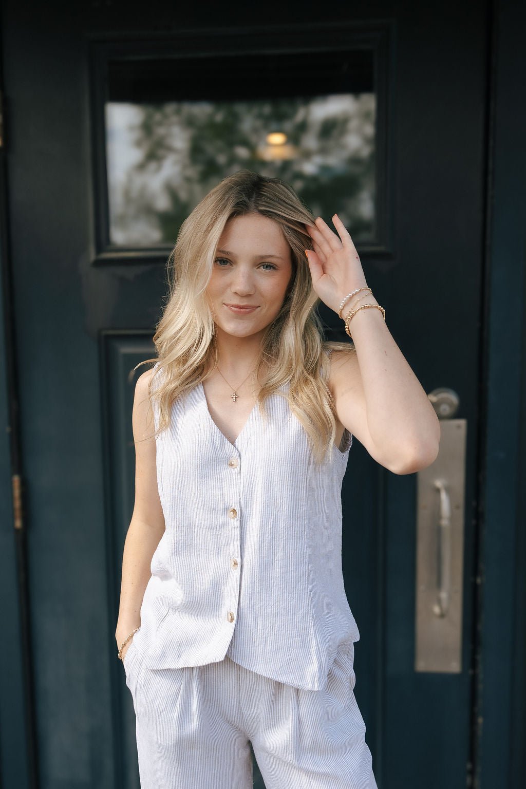 Effortlessly stylish, the Anastasia Vest in White Oak is perfect for your summer wardrobe. Chic and comfortable, it's a unique piece that will elevate any outfit. Embrace the warm weather while looking your best with this must-have piece!