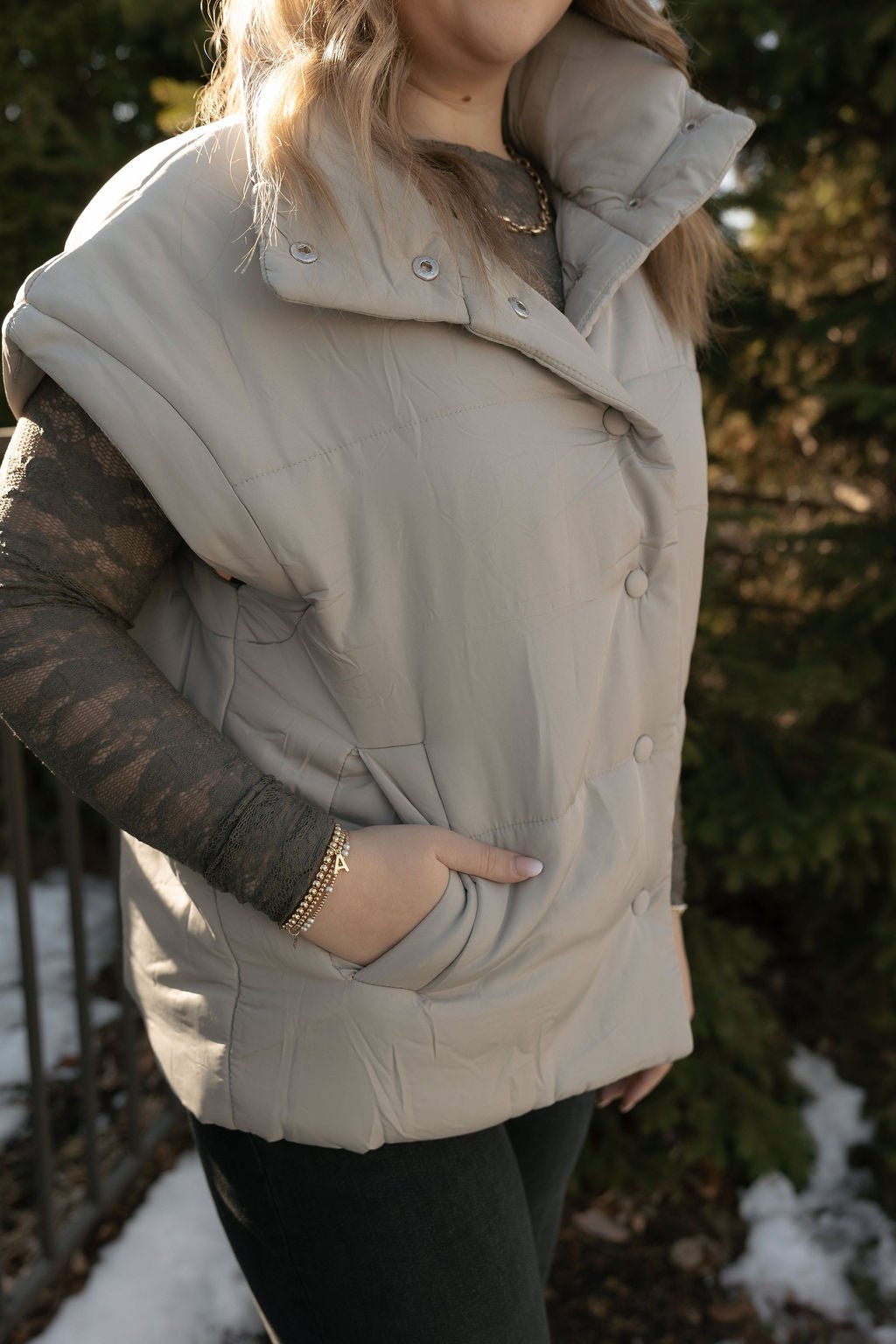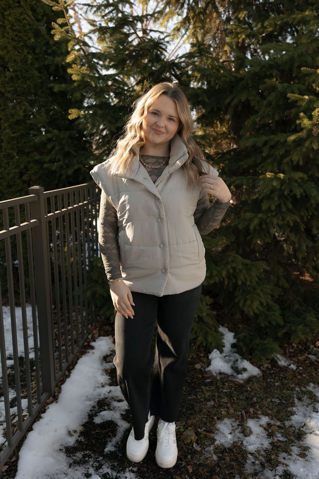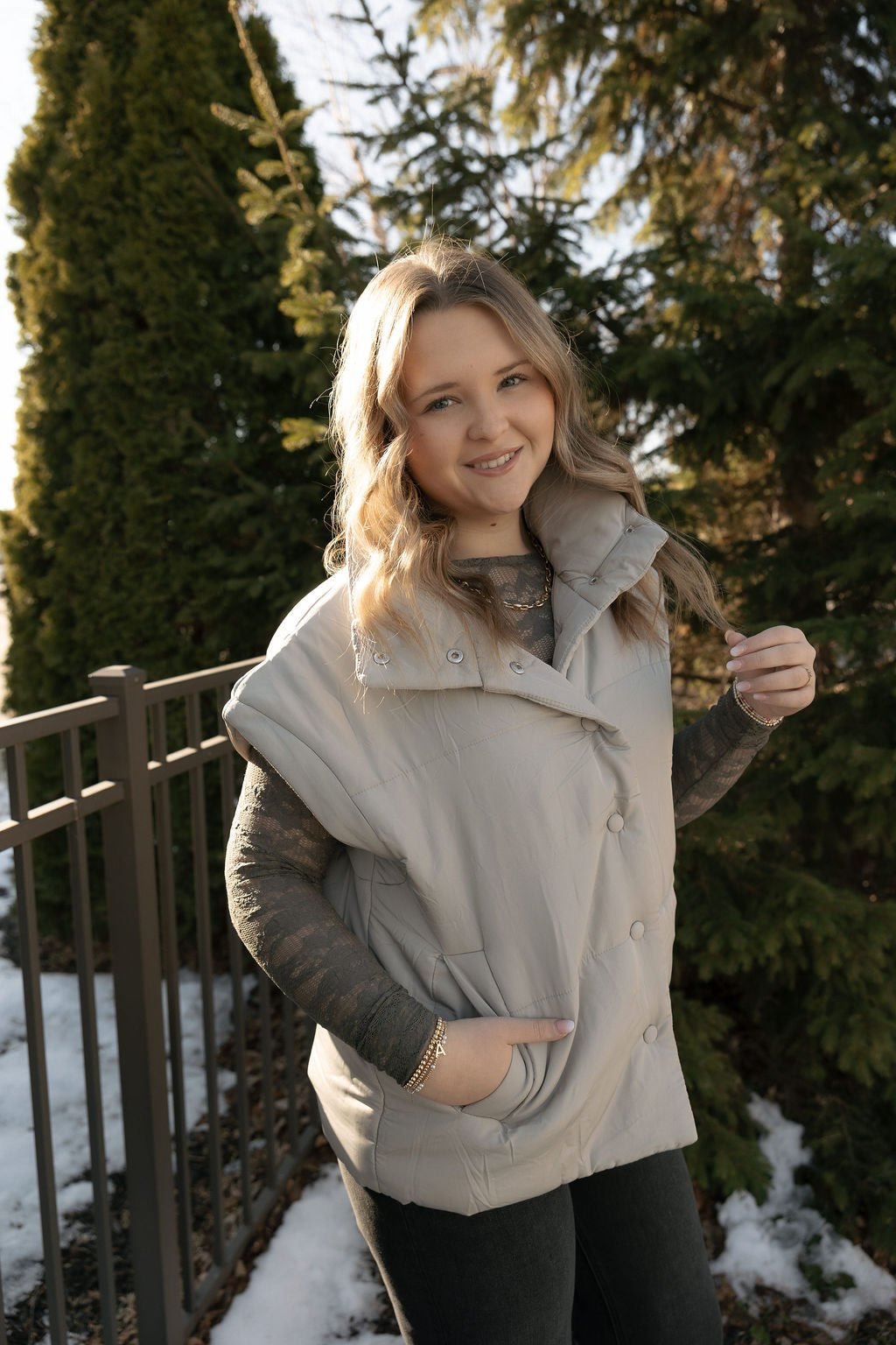 This vest runs true to size with a slight oversized fit. Model wearing size small.