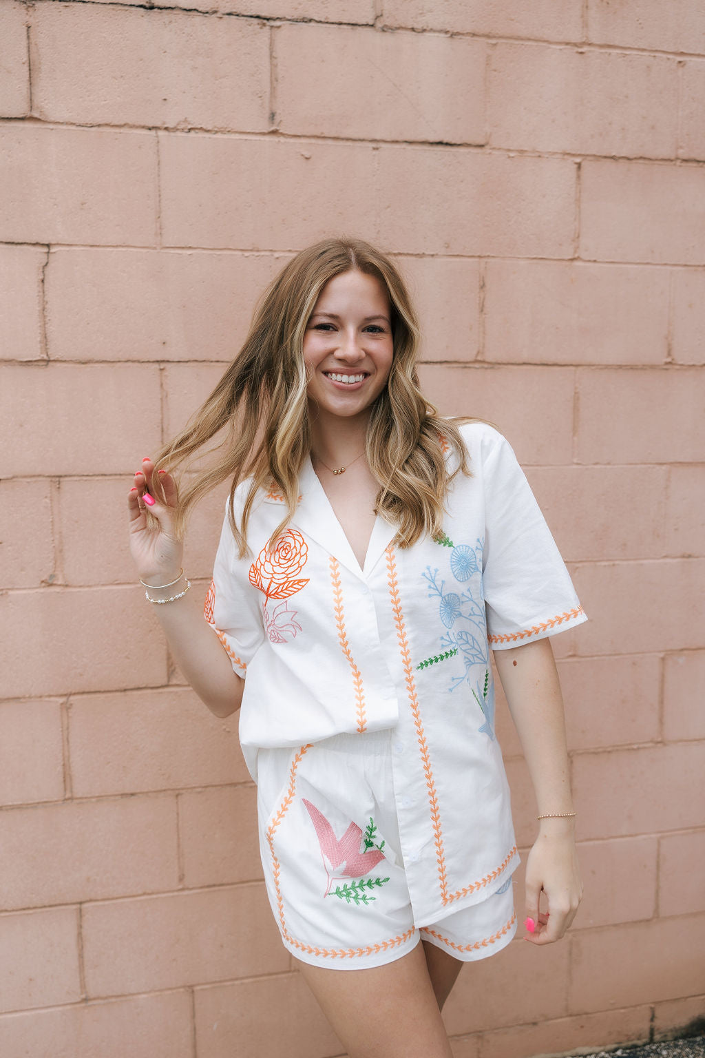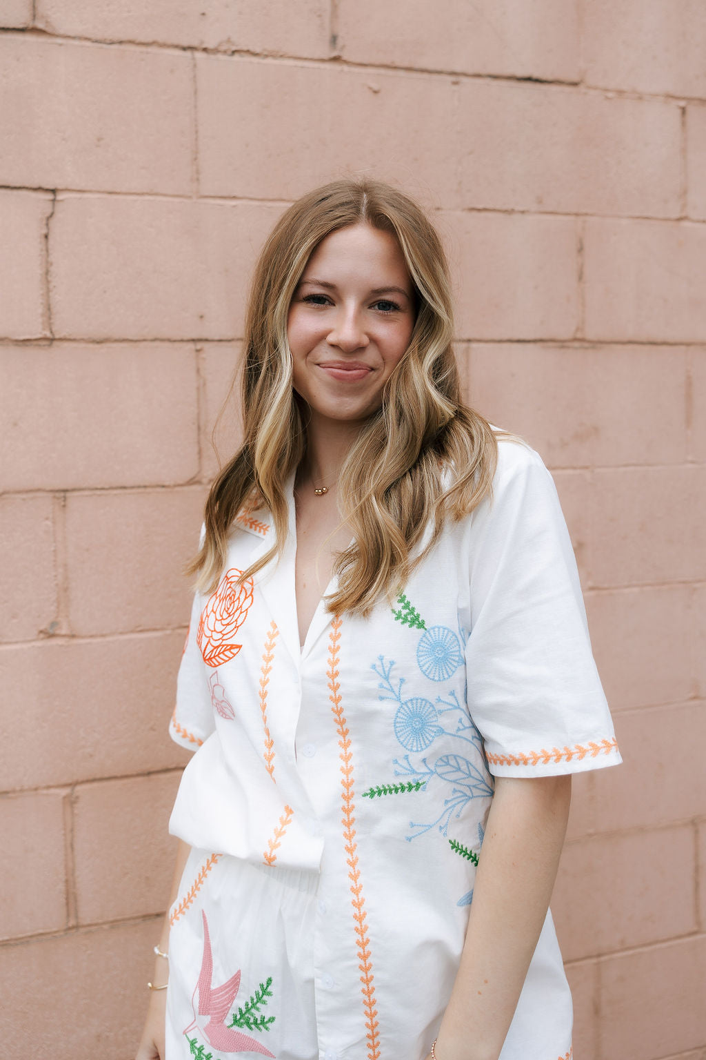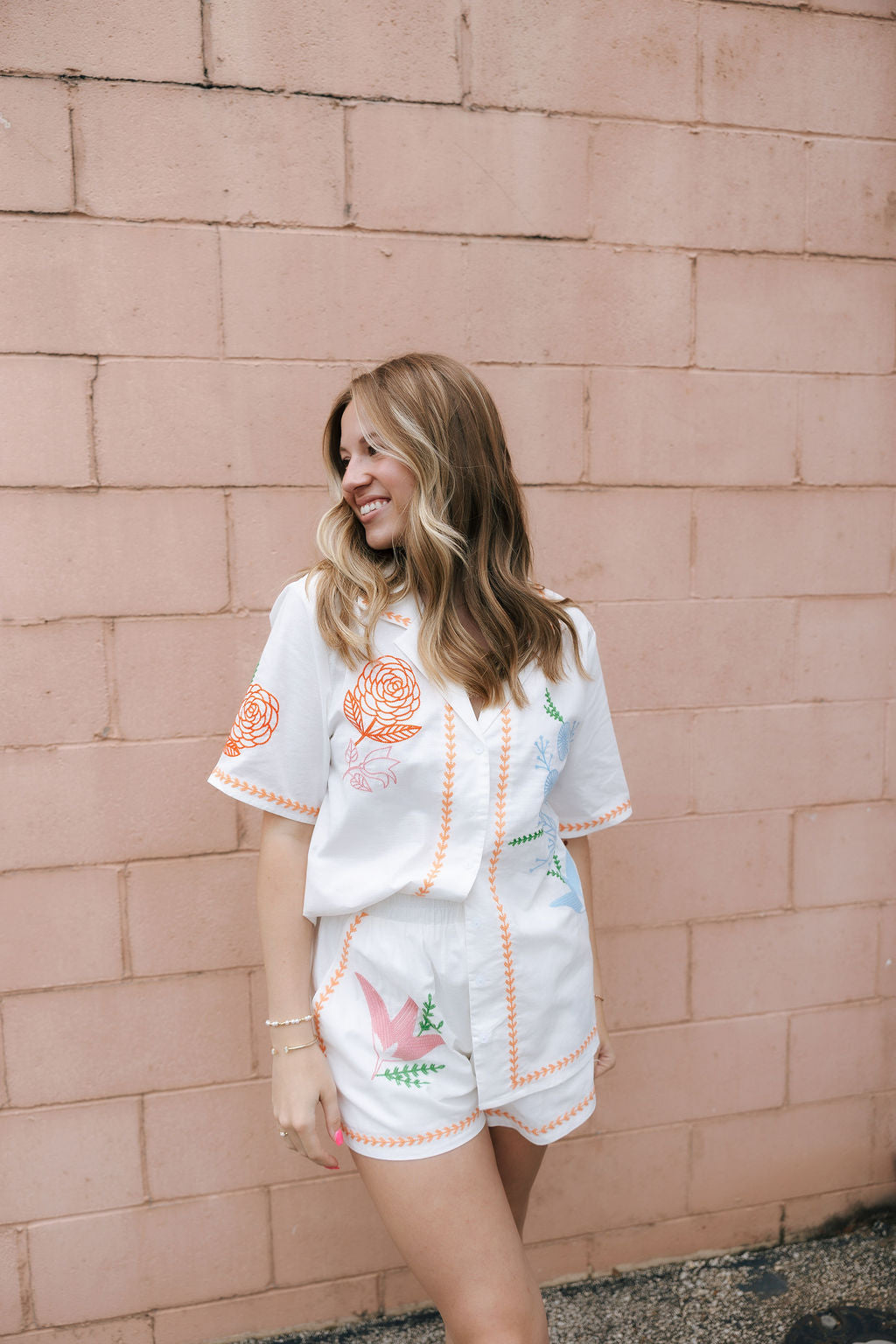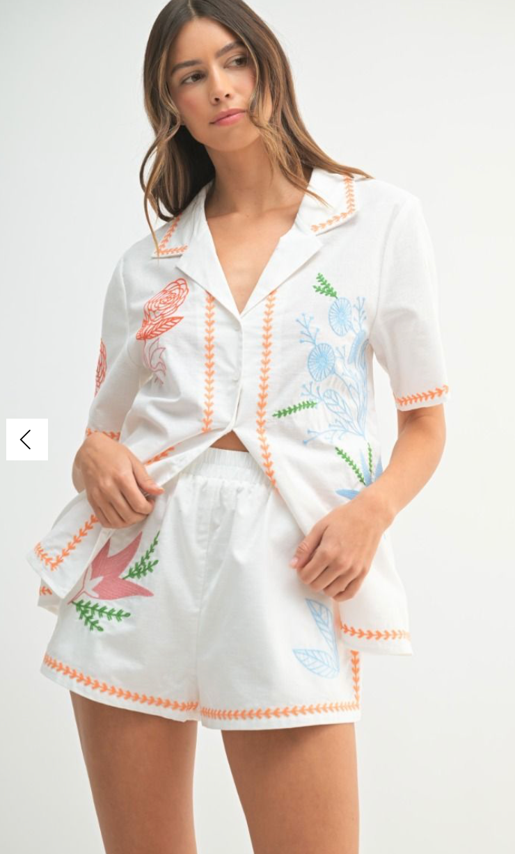Perfect for spring and summer, this vibrant Orange Embroidered Button Shirt Set features a sophisticated collared v-neckline and comfortable elastic waistband. Delicate floral embroidery adds a distinctive touch to this ensemble, creating a look that's both effortlessly stylish and uniquely seasonal.