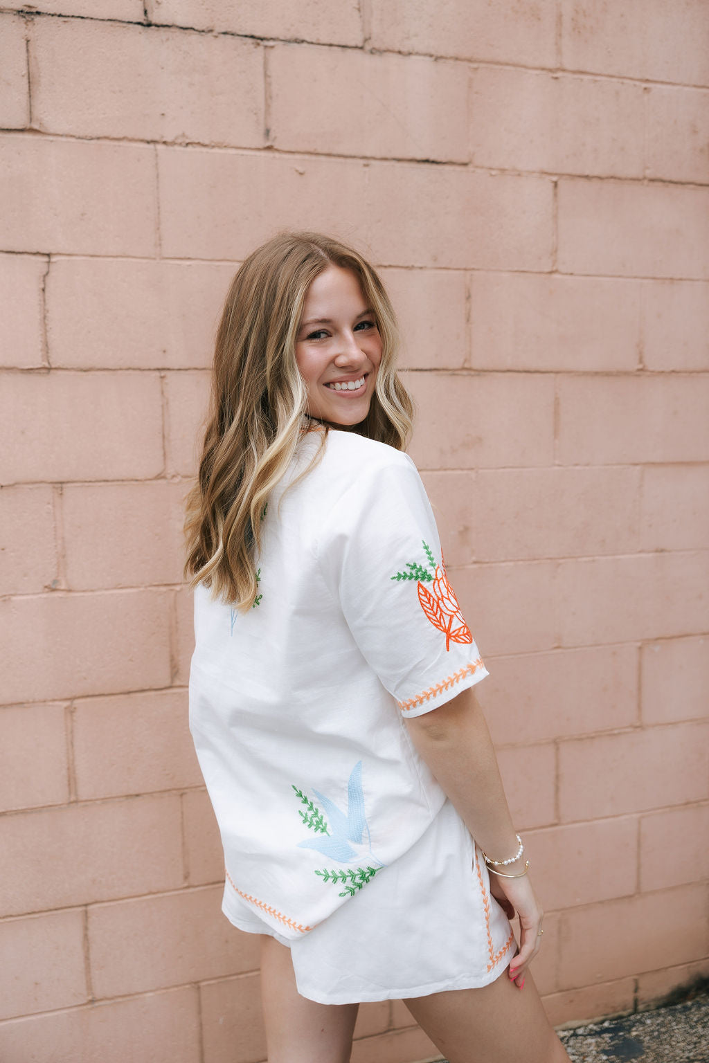 Fit: Oversized, collared v-neckline, button down front for closure, short sleeve. Model is wearing a size small.