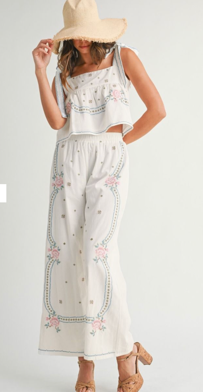 Elevate your spring/summer wardrobe with our unique Embroidered Tank/Pants Set. Effortlessly flowy and adorned with fun floral embroidery, this set is both cute and comfortable for any occasion. Upgrade your style with this must-have addition to your collection.