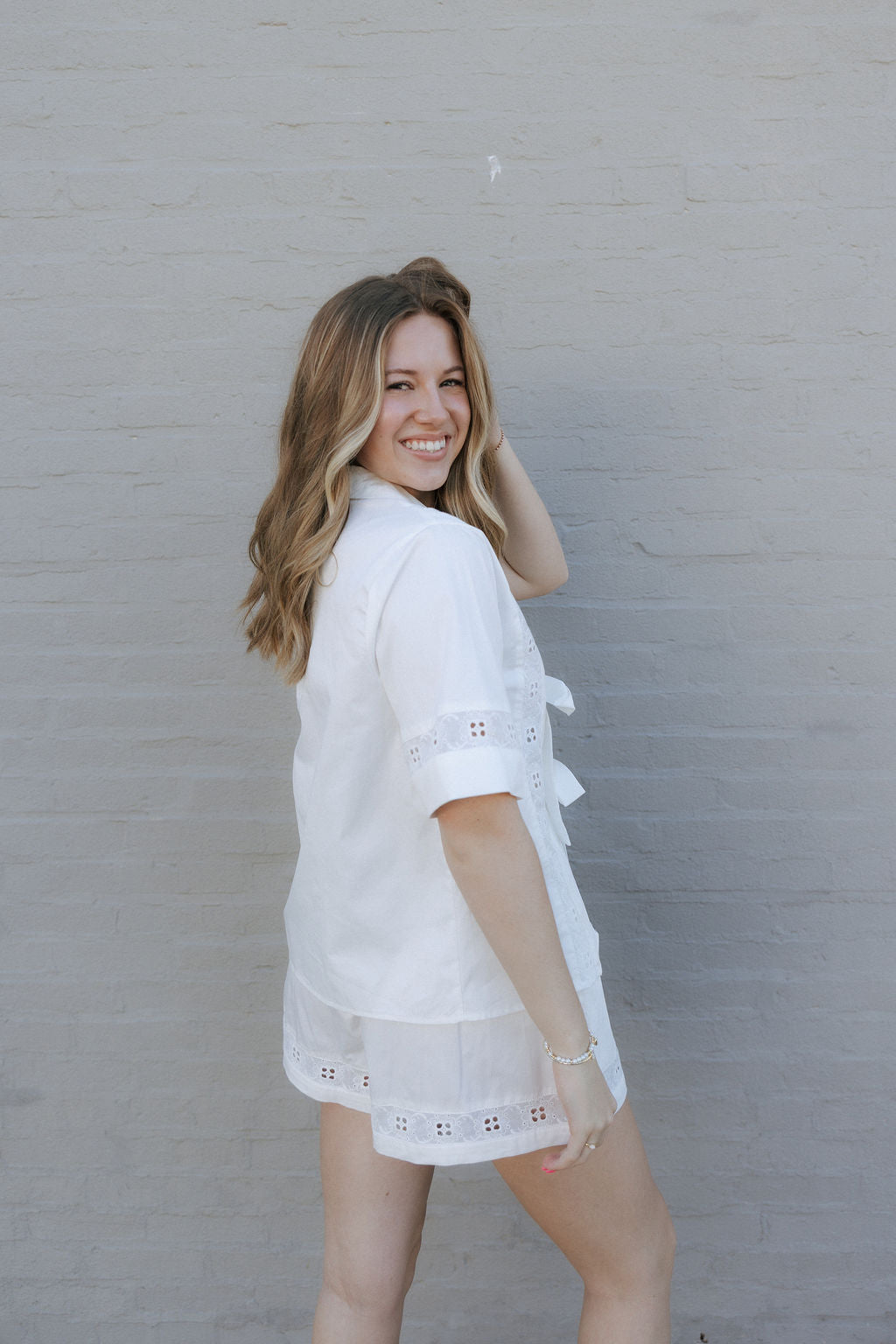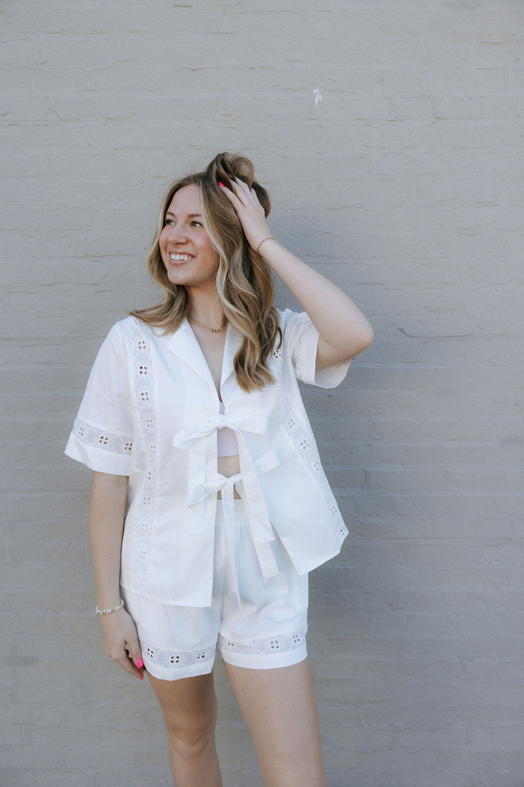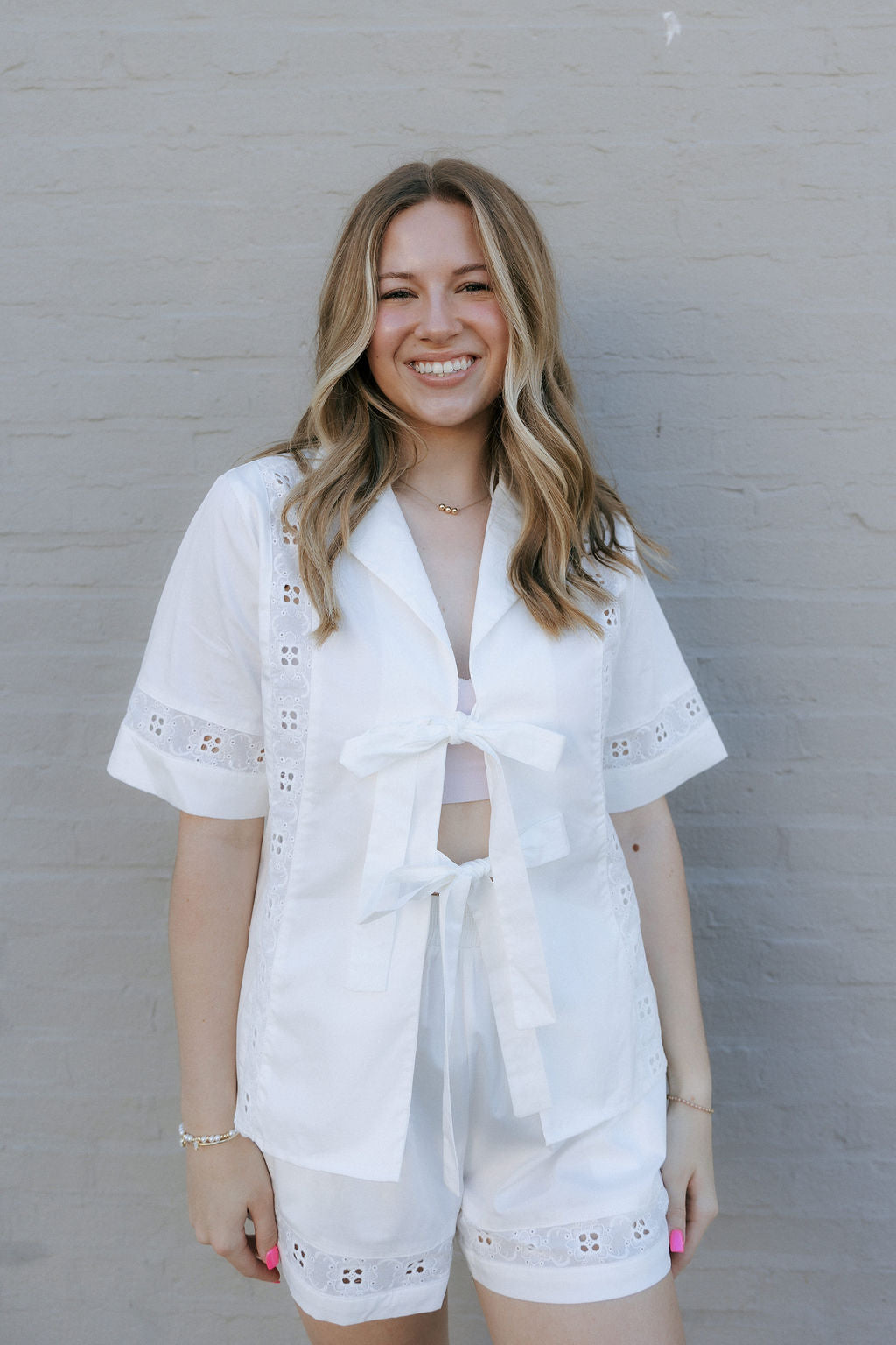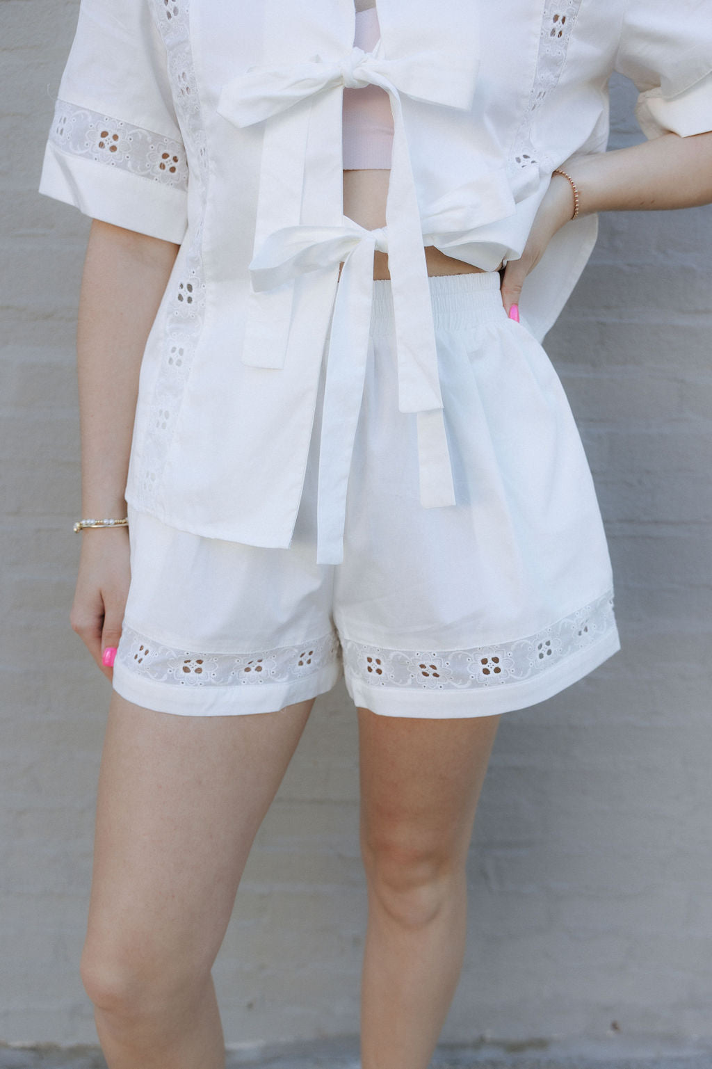 Unleash your unique style with our Eyelet Trim Set in white. This simple and versatile set is perfect for spring and summer. The relaxed fit and elastic waistband provide a comfortable feel, while the tie-front closure adds a fun touch. High-rise shorts complete the look for a casually chic outfit.