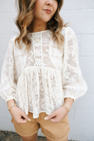 The Haisel Top in Ivory offers a unique, flowy design with an open back detailed with delicate floral lace. Perfect for spring and summer, this top effortlessly combines elegance and comfort.