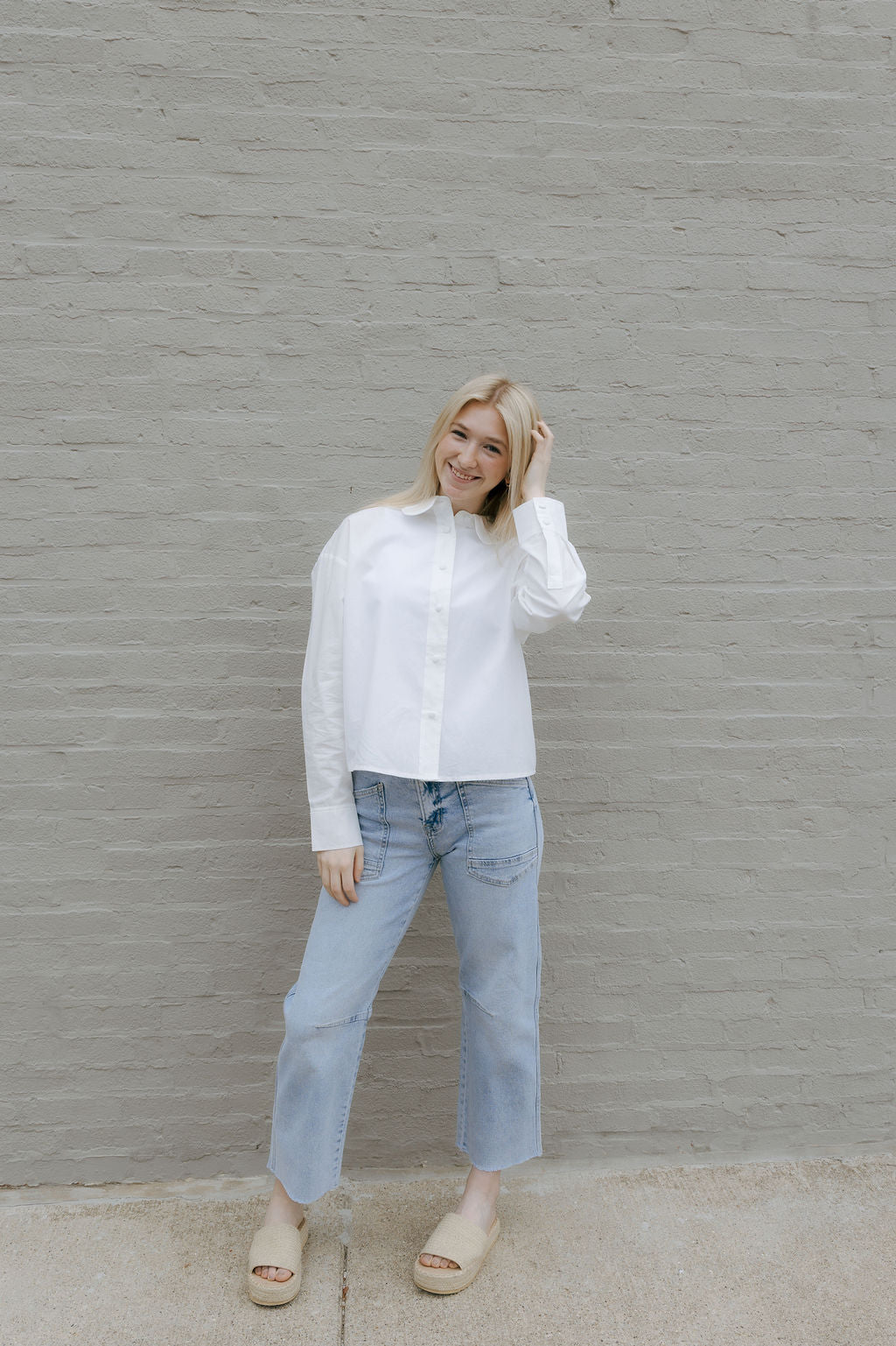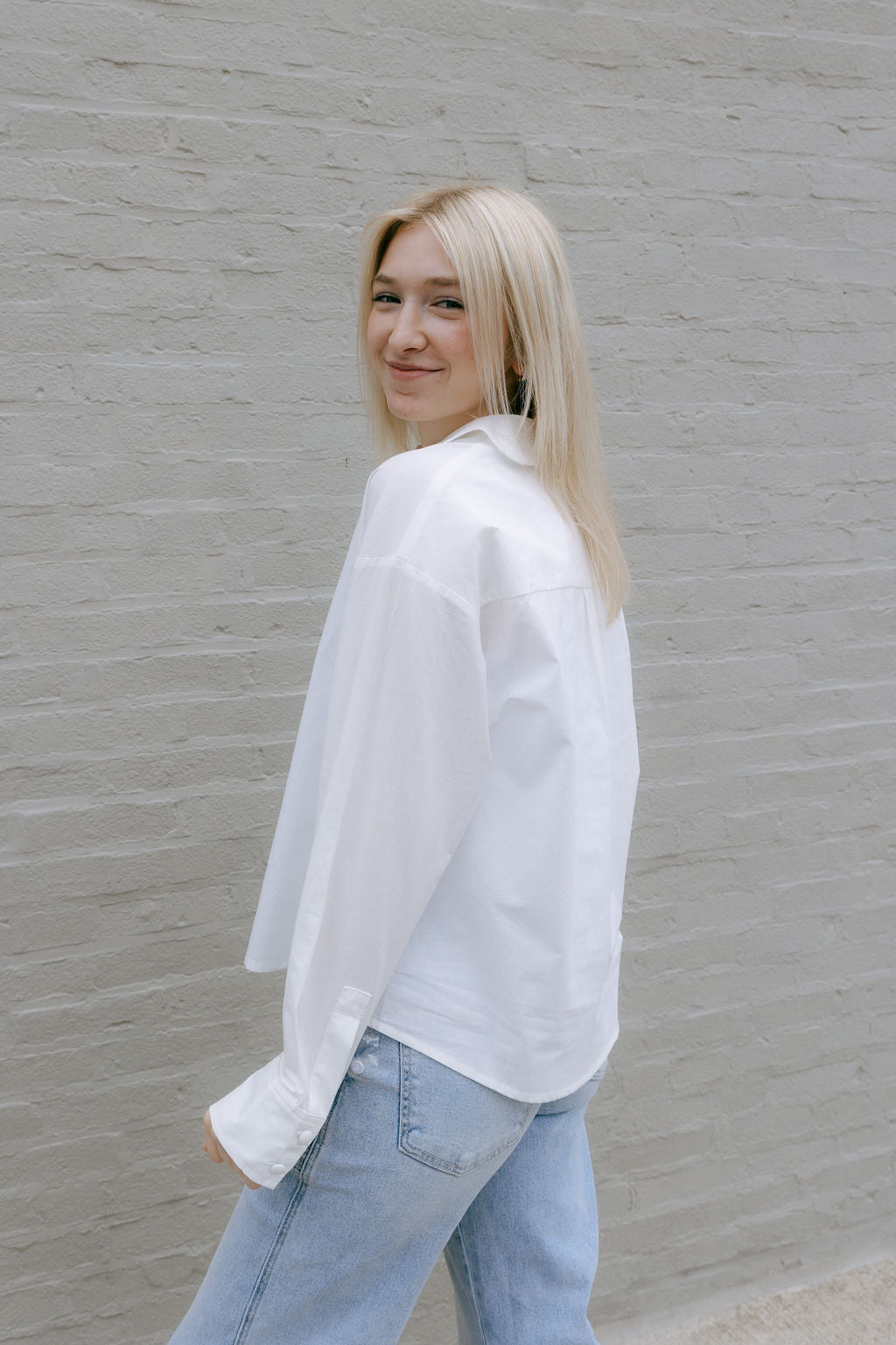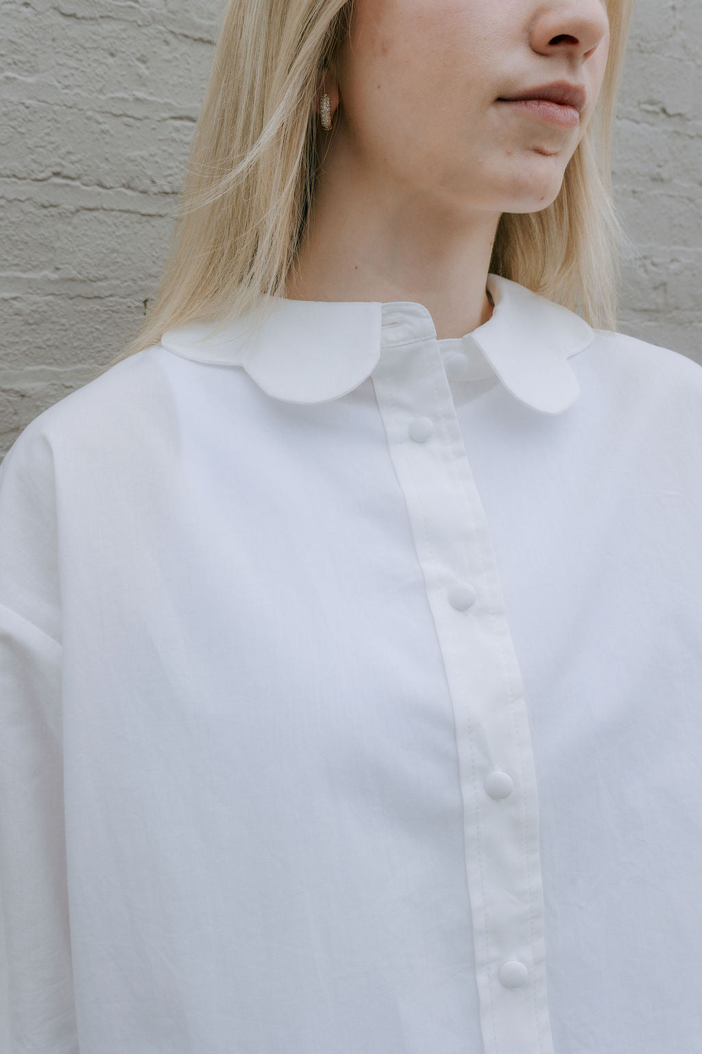 Elevate your spring and summer wardrobe with this sophisticated white Scallop Collar Shirt. The distinctive round neckline with scalloped detailing creates an eye-catching focal point, while the full-length silhouette and button-down front offer versatile styling options. Long sleeves add a touch of elegance, making this piece perfect for dressy occasions when temperatures rise.